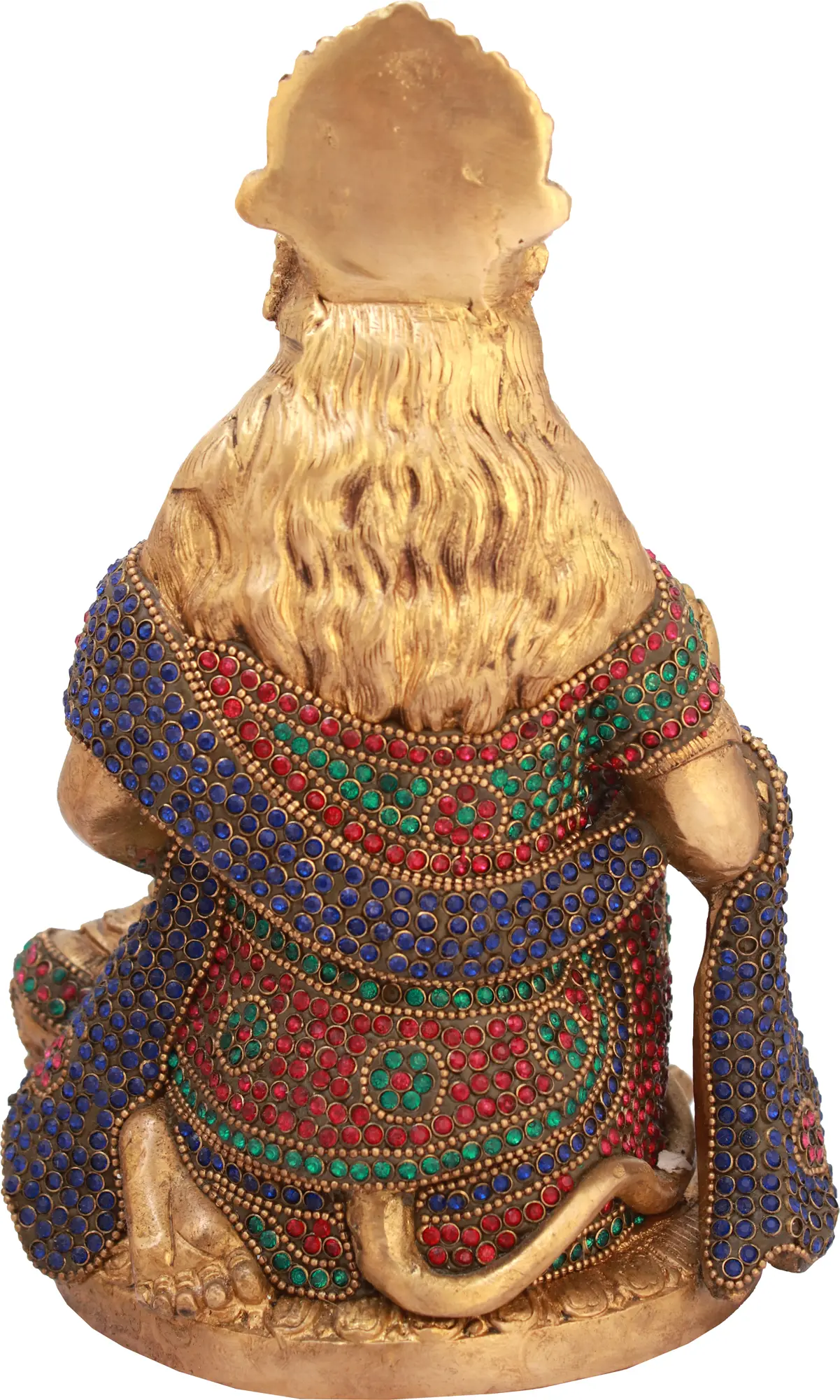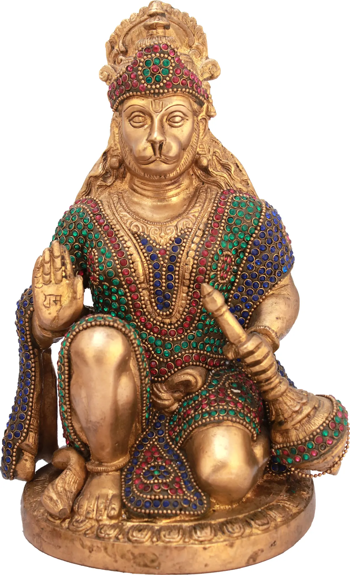 Each detail of this statue is a testament to the rich heritage of Indian craftsmanship. Cast in gleaming brass, it showcases the skilled hands of artisans who have meticulously brought this divine form to life. The intricate inlay work, featuring vibrant red, green, and blue gemstones, adds a touch of opulence and highlights the divine attire of Lord Hanuman. These embellishments not only enhance the visual appeal but also carry symbolic meanings in Indian culture, often representing vitality, prosperity, and spiritual energy. The casting process itself is a time-honored tradition, passed down through generations, ensuring that each piece is not merely an object but a work of art steeped in cultural history. From the powerful musculature to the serene expression on Hanuman's face, every element is thoughtfully rendered, making this statue a cherished addition for collectors and devotees alike. ––––––––––––––––––––