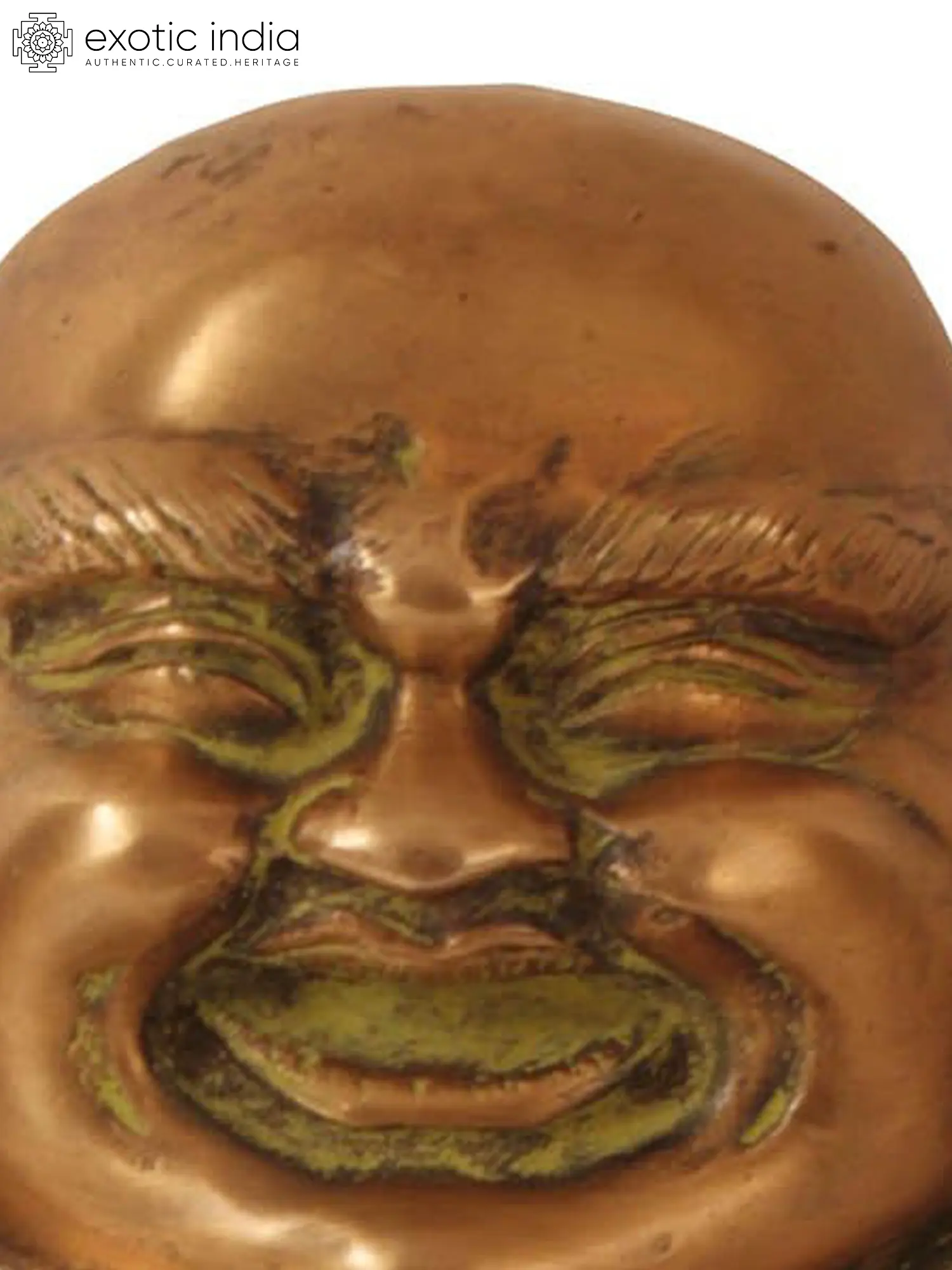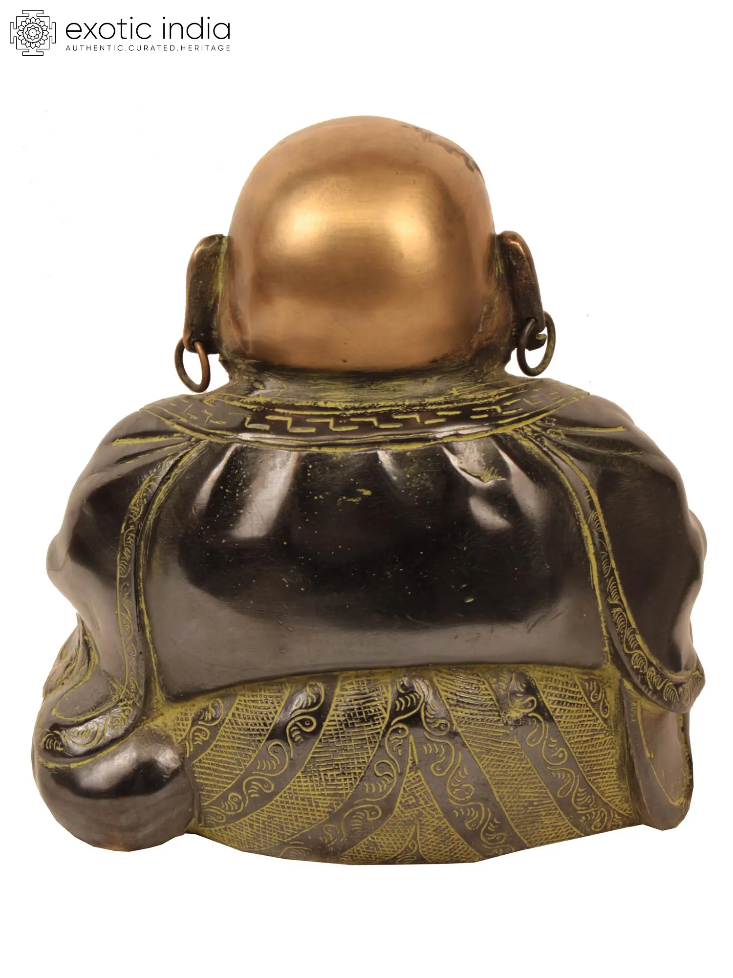 Radiating an aura of profound joy and serene contentment, this exquisite brass statue captures the essence of the Laughing Buddha, a universally beloved figure in Buddhist and Taoist traditions. Crafted with meticulous attention to detail by skilled artisans in India, this piece is not merely an object of art but a vessel of positive energy, inviting prosperity, good fortune, and happiness into your space. The benevolent smile etched on his plump face, the crinkled eyes sparkling with mirth, and the ample belly, a symbol of abundance and good health, all speak of a life lived in joyful simplicity and inner peace. He is depicted in a seated posture, embodying a state of relaxed equanimity. In one hand, he gently holds a string of prayer beads, signifying spiritual devotion and mindfulness, while the other rests on a vessel, perhaps a traditional offering bowl or a symbol of his ability to bestow blessings. The draped robes, rendered in a darker patina that accentuates the form, are adorned with subtle, intricate patterns, adding to the piece's rich aesthetic. The overall finish, a harmonious blend of polished brass and a verdigris patina, lends an antique charm and a sense of depth to the sculpture, making each contour and curve stand out with captivating vibrancy.