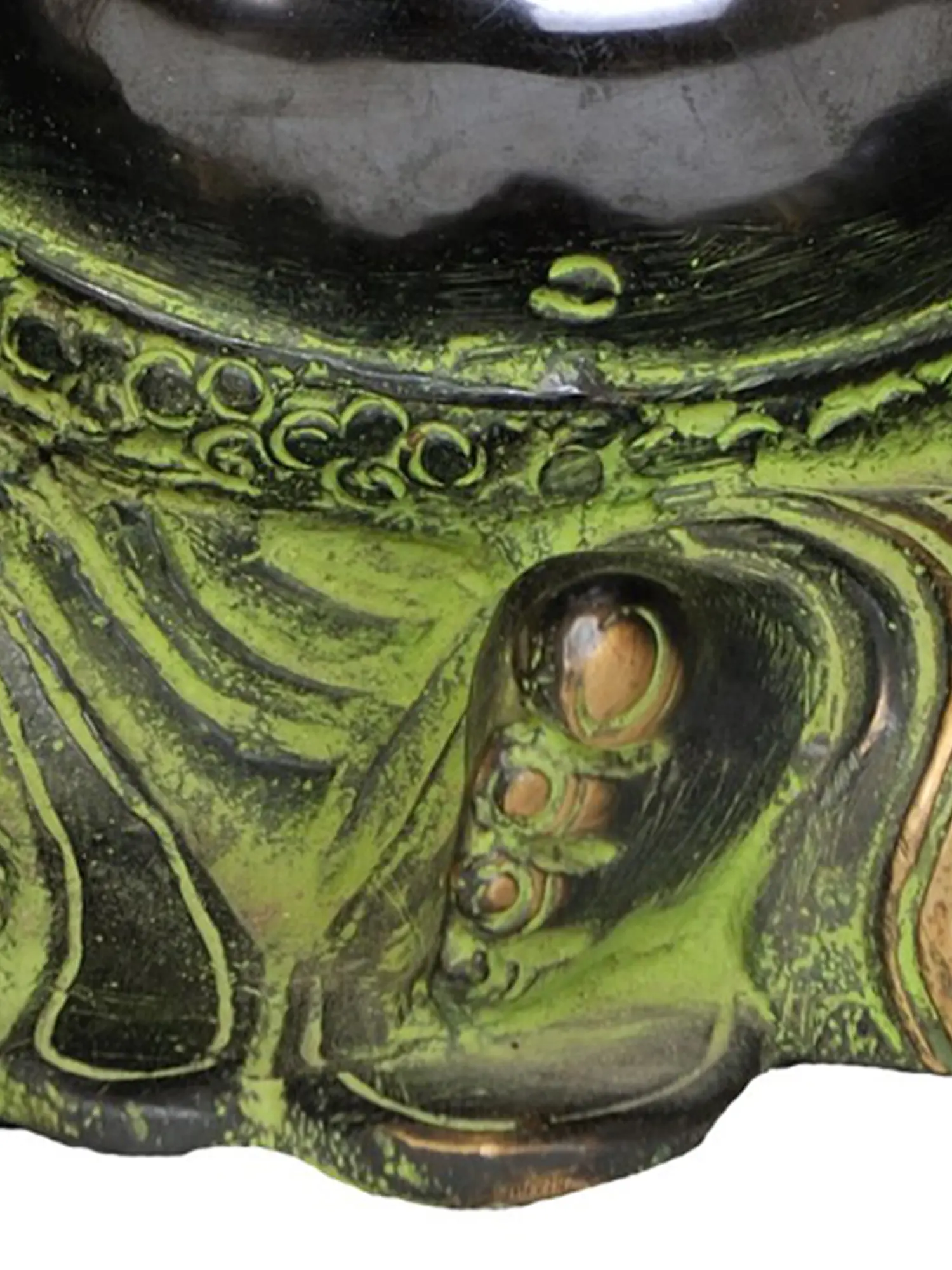 This exquisite brass statue captures the joyous spirit of the Laughing Buddha, a beloved figure in Buddhist tradition and a symbol of good fortune and contentment. Crafted with meticulous attention to detail by skilled artisans in India, this piece exudes a sense of warmth and abundance, making it a captivating centerpiece for any home or sacred space. The rich, polished brass, with its subtle verdigris patina, evokes a sense of timelessness and heritage, as if this benevolent figure has been gracing homes for centuries.