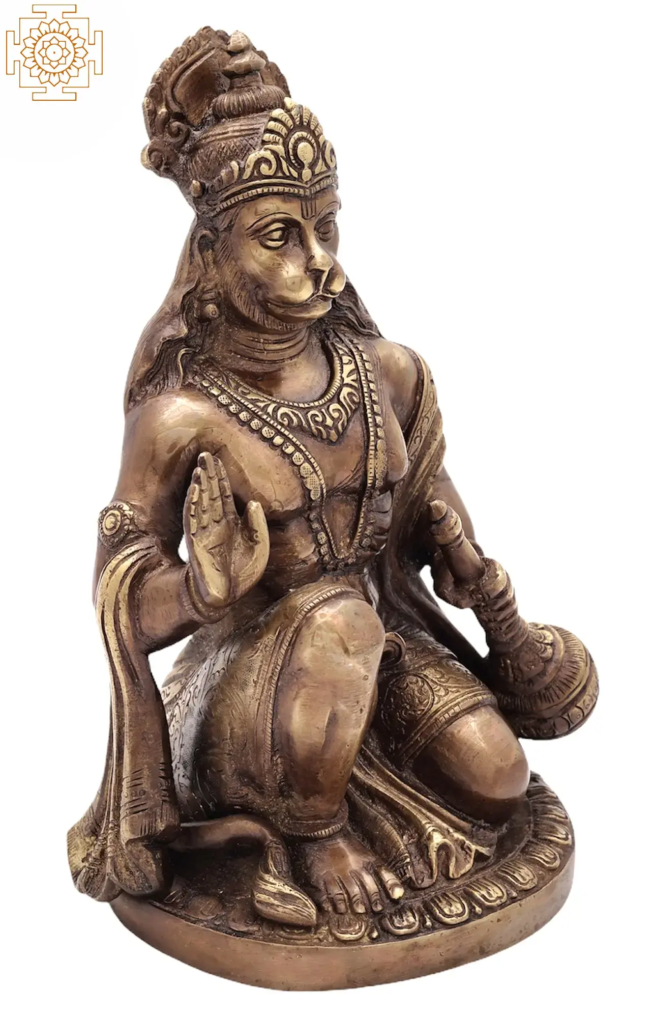 Invite the divine presence of Lord Hanuman into your home with this exquisite brass statue. Crafted with meticulous detail and spiritual devotion, this artwork captures the essence of Hanuman, the unwavering devotee of Lord Rama and a symbol of strength, courage, and selfless service. The rich patina of the brass, artfully aged, lends an antique charm and a sense of timeless reverence to this piece. Hanuman's story is woven into the very fabric of Indian spirituality. Revered as the son of Vayu, the wind god, he possesses immense power and agility, famously leaping across the ocean to Lanka to find Sita and later carrying the entire Sanjeevani herb to save Lakshmana's life. This statue depicts him in a benevolent pose, with one hand raised in a gesture of blessing and protection, and the other cradling his iconic mace, the 'Gada', a symbol of his might and readiness to defend righteousness. His serene yet determined expression reflects his deep faith and his role as a protector and guide. –––––––––––––––––––