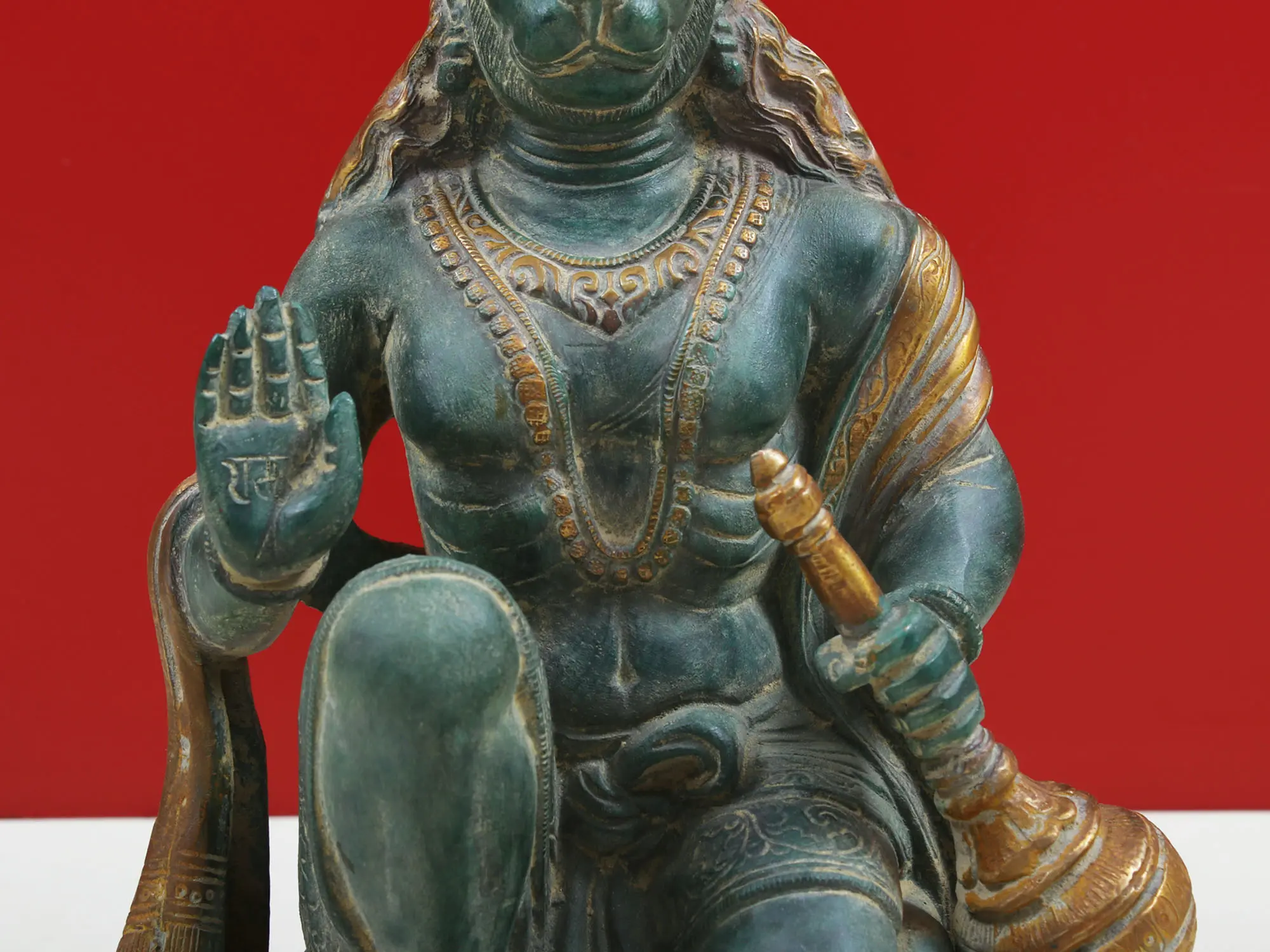 The traditional green and gold patina of the brass evokes a sense of antiquity and spiritual aura, making it a perfect centerpiece for any altar, meditation room, or living space. The craftsmanship ensures that each statue is a unique work of art, carrying with it the blessings and energy of its maker. Whether you are a devout follower or an admirer of exquisite spiritual art, this Lord Hanuman brass statue promises to be a cherished possession, radiating peace, strength, and divine grace. This handmade piece, originating from India, carries with it the deep cultural and spiritual heritage of a land that celebrates devotion in its most profound forms.