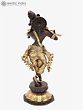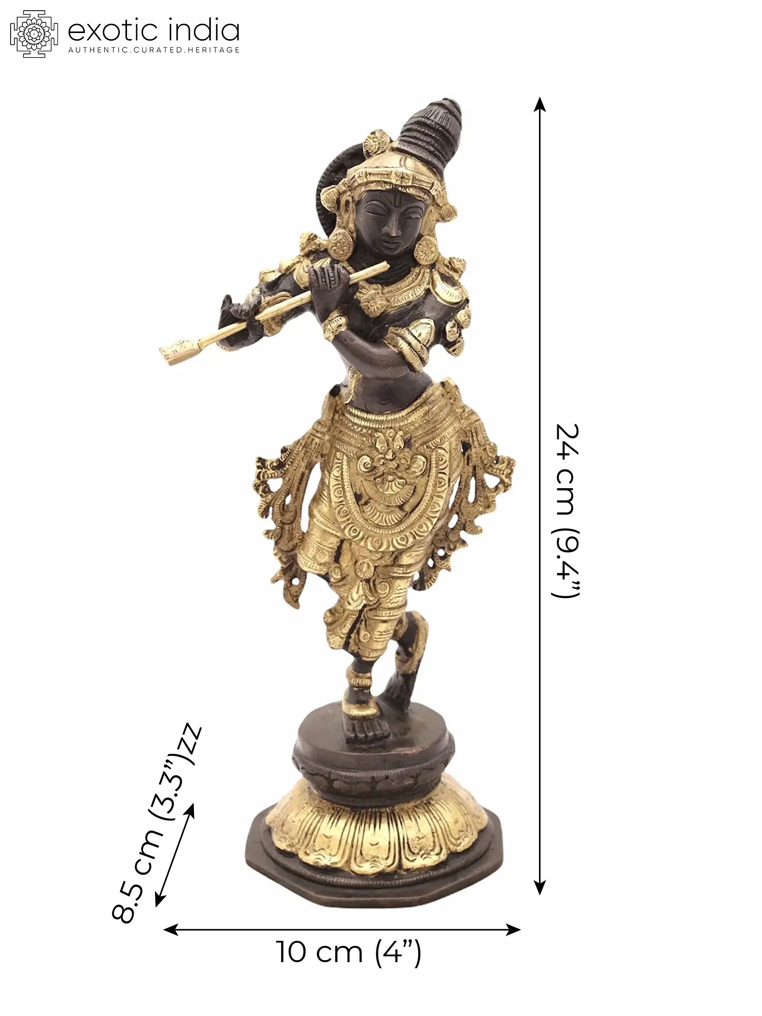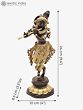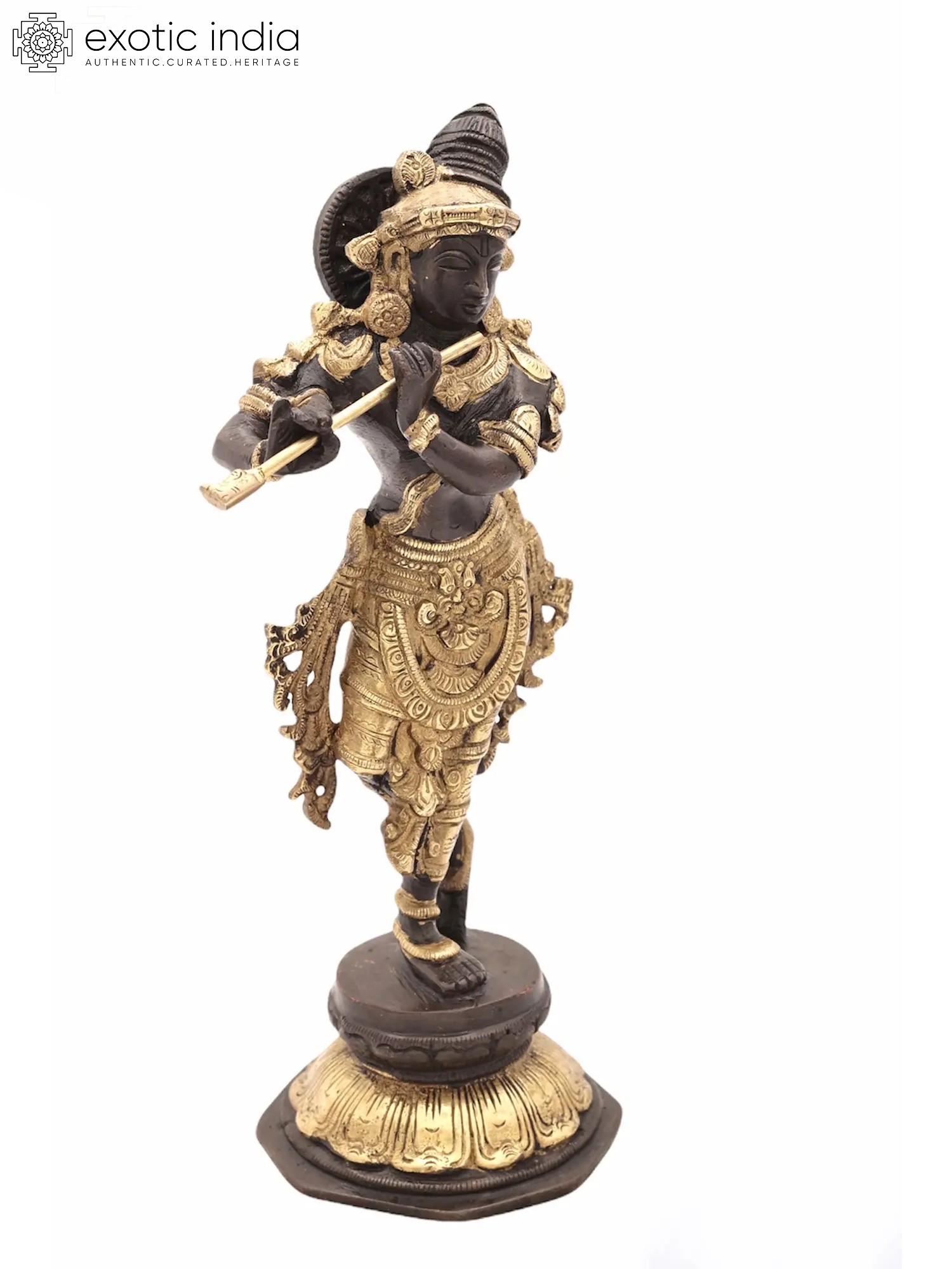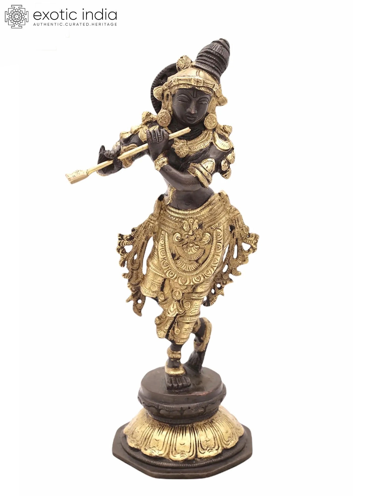 The Lord in this sculpture is shown like a silent ocean filled with ecstasy and tranquility. His dark complexion appears just like a fresh dark cloud carrying a huge amount of mercy within it to be showered upon the surrendered souls. His moonlike face contains eyes resembling the lotus petals and all the gopis are allured by the soft and gentle smile on His face. He places His divine flute Venu on to His sweet lips and plays upon it, and the sound of which nourishes the hearts of His devotees.