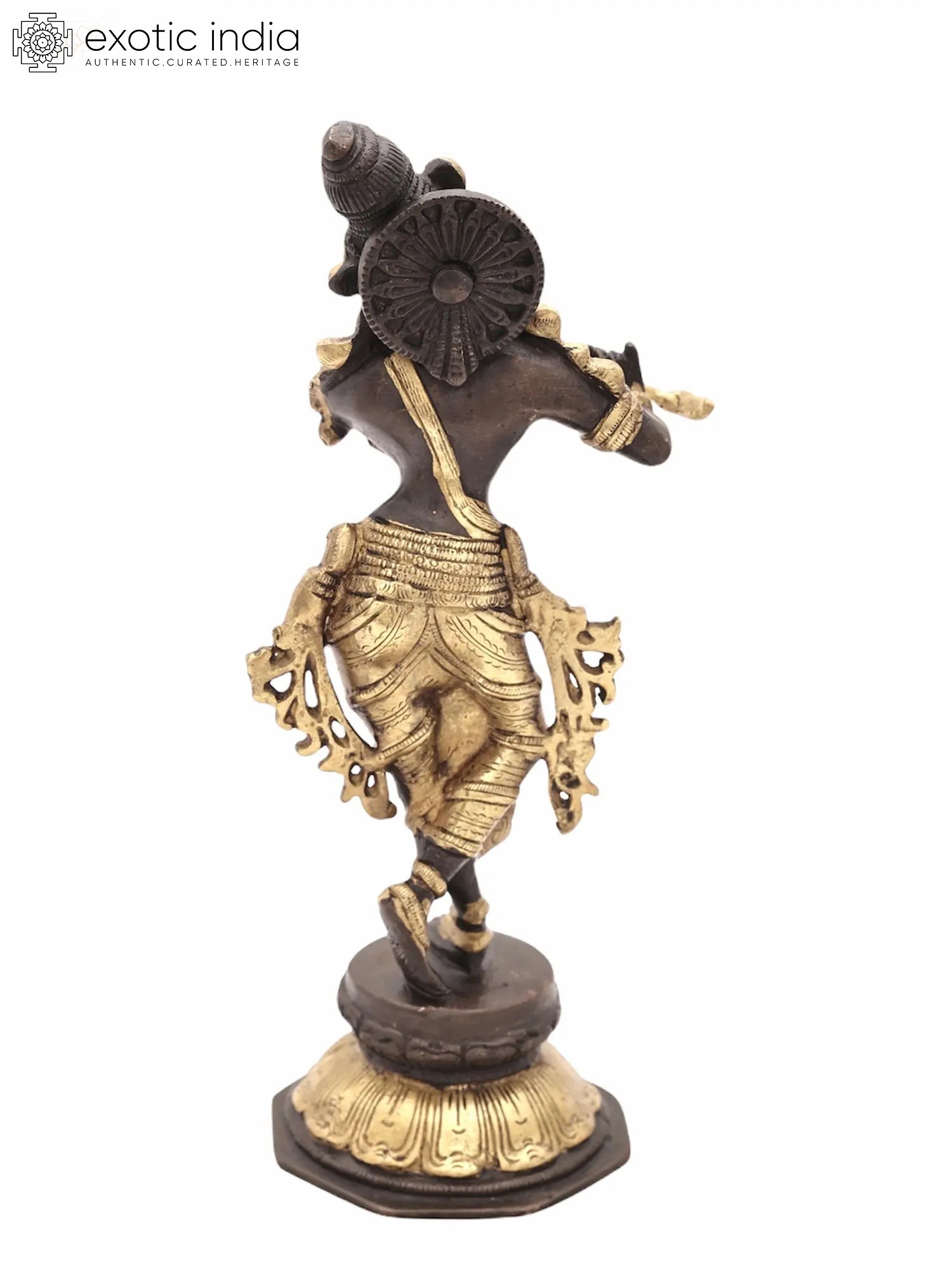 Here stands the Supreme Lord Krishna on a small upturned lotus pedestal in His most attractive three-fold bending form (tribhanga). Krishna is the source of all pleasure and also the cause of all causes. What to speak of His beautiful bodily features and wonderful activities in the land of Vraja that stole the hearts of all the inhabitants of Vrindavan. Although He is the Supreme Personality of Godhead, He appeared like an ordinary boy and all the damsels and cowherd boys loved to play with Him.