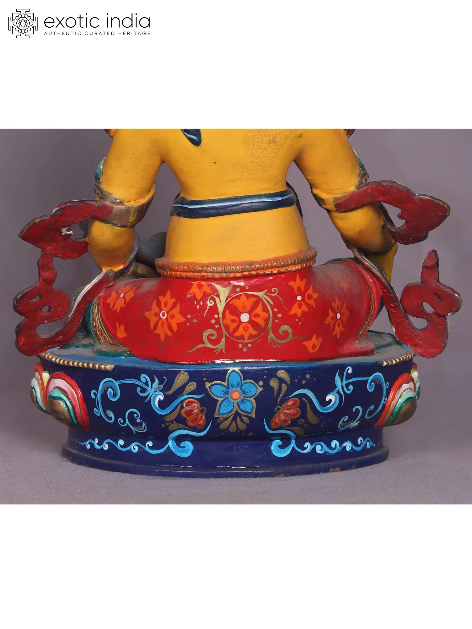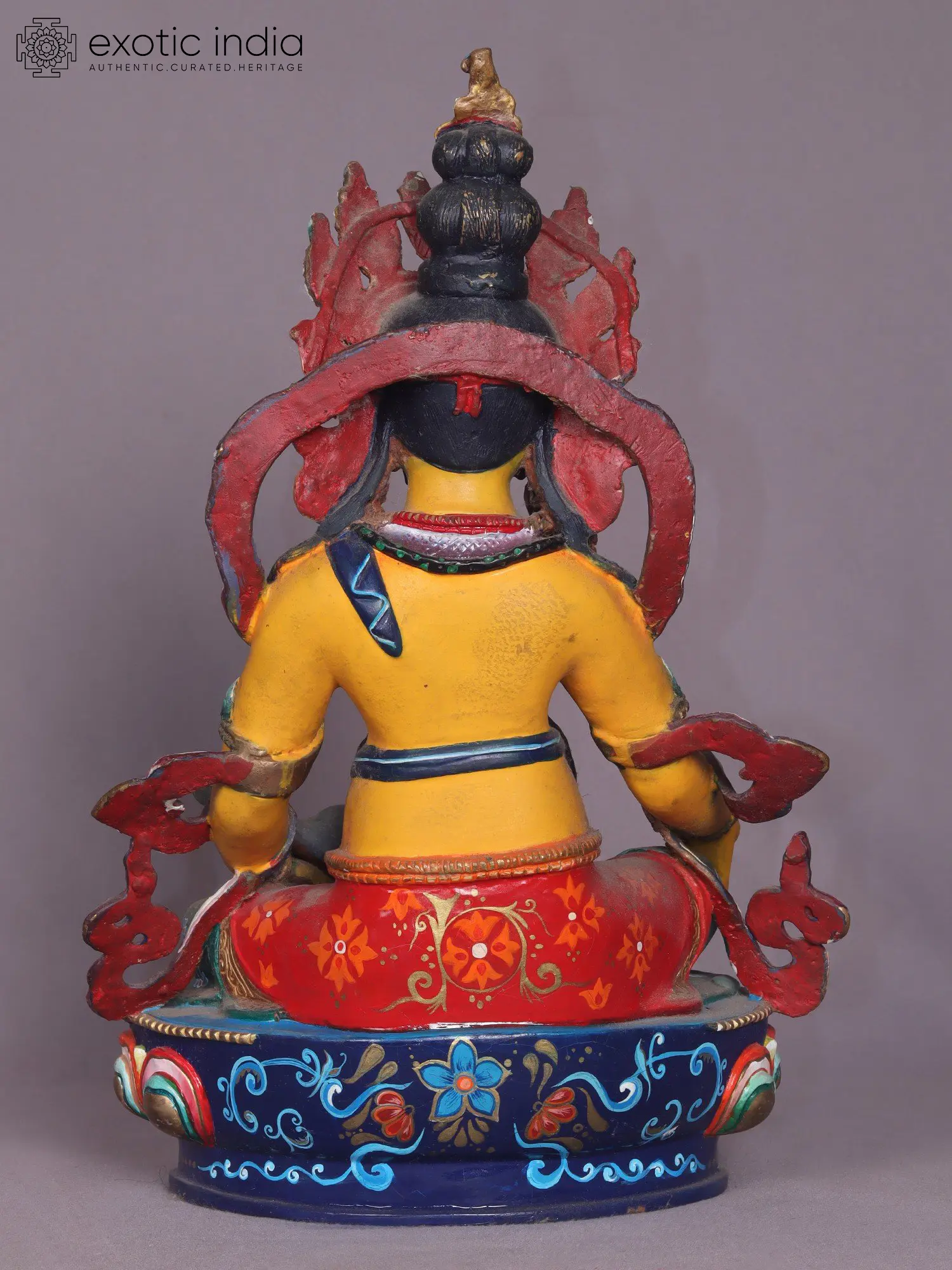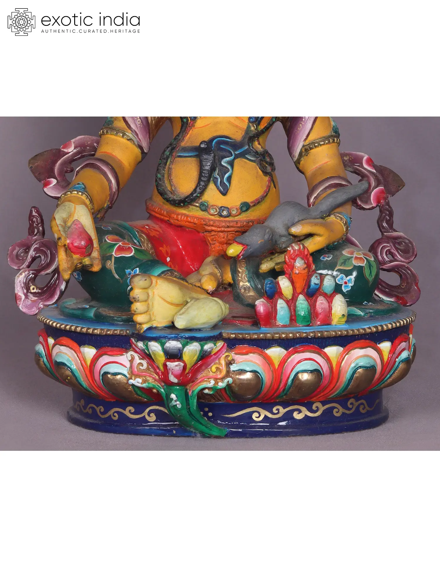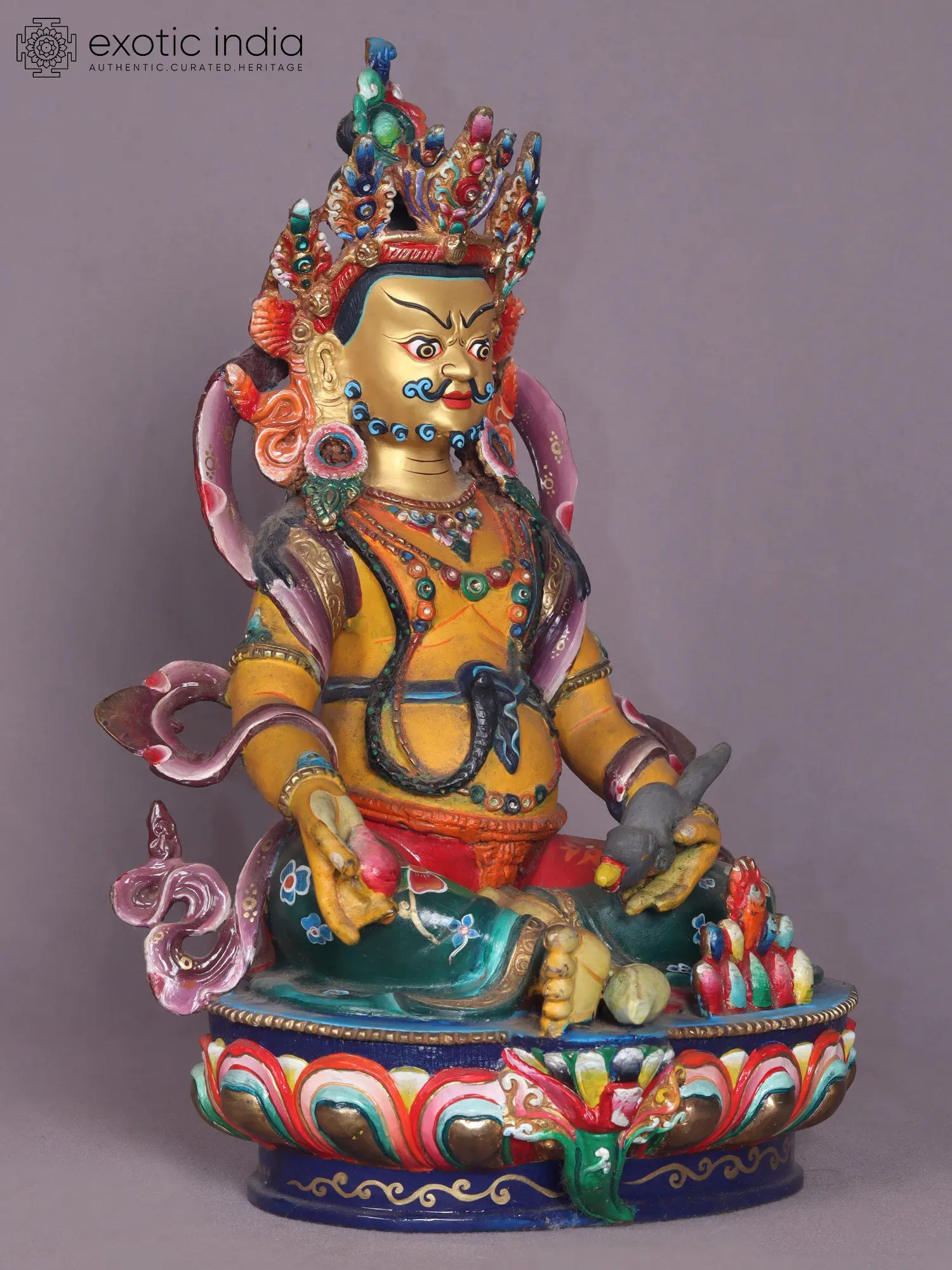 He adorns himself with various colorful gemstone jewelry, enhancing his regal appearance. In his left hand, Kubera cradles a mongoose, which continuously releases jewels, symbolizing his triumphant dominion over the Nagas. Seated in a relaxed posture atop a vibrant lotus pedestal, Kubera extends his right leg slightly outward, exuding an air of ease and comfort.