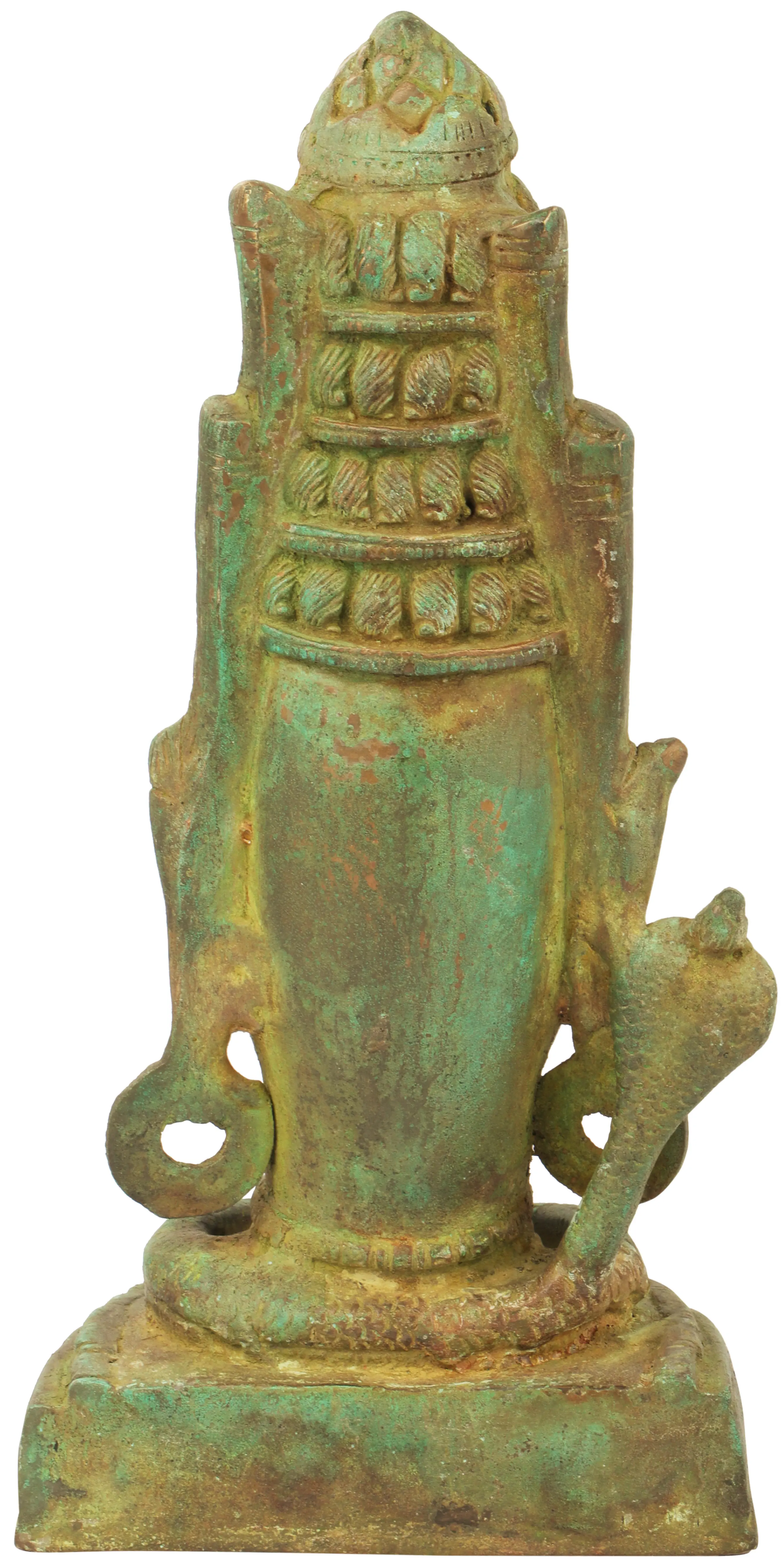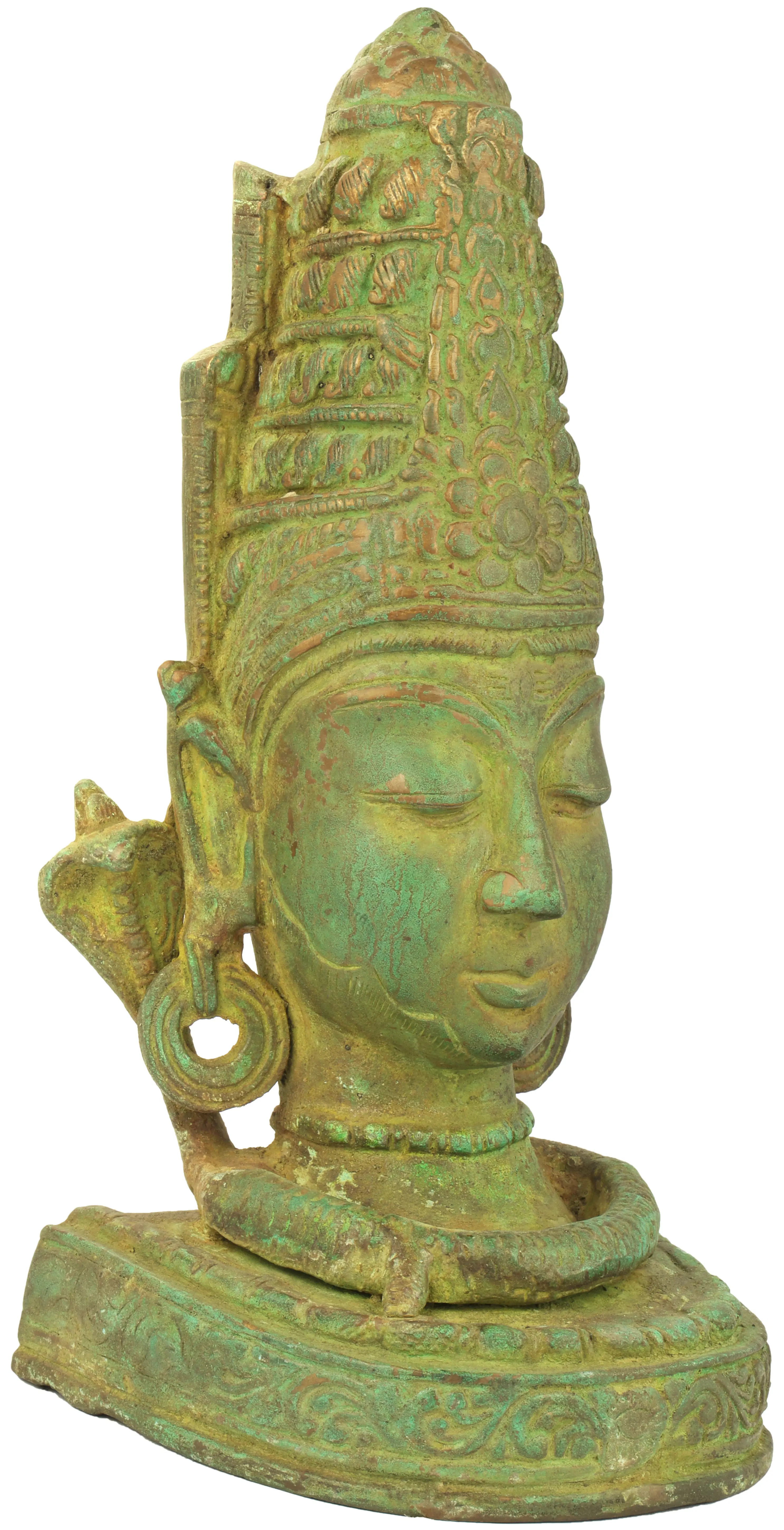 This exquisite brass statue embodies the divine presence of Lord Shiva as Mukha Linga, a form that represents the omnipresent and all-pervading nature of the Supreme Being. The term "Mukha Linga" translates to "face Linga," signifying the divine face adorned upon the abstract, cylindrical form of the Linga. This iconography is deeply rooted in ancient Hindu traditions, symbolizing Shiva as the creator, preserver, and destroyer of the universe, the ultimate consciousness that pervades all existence. Crafted with remarkable skill by artisans in India, this handmade piece radiates an aura of timeless spirituality. The verdigris patina that graces the brass lends it an antique charm, hinting at ages of devotion and the passage of time. Each detail, from the serene expression on Shiva's face to the intricate ornamentation of the crown and the coiled cobra adorning his ear, speaks of meticulous craftsmanship and artistic dedication.