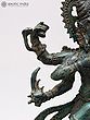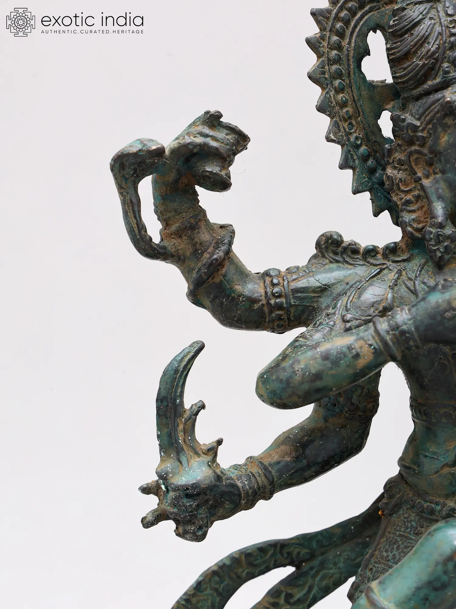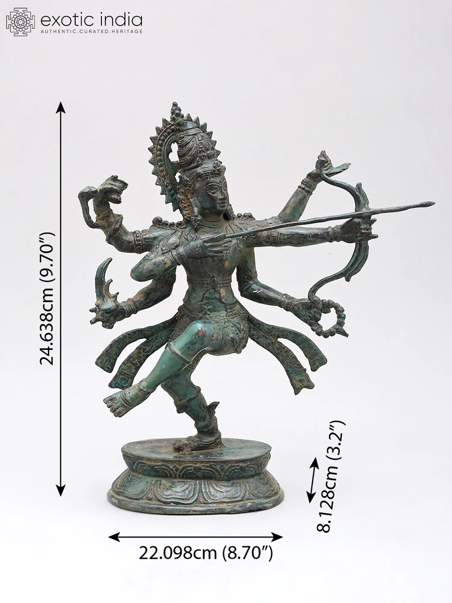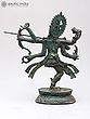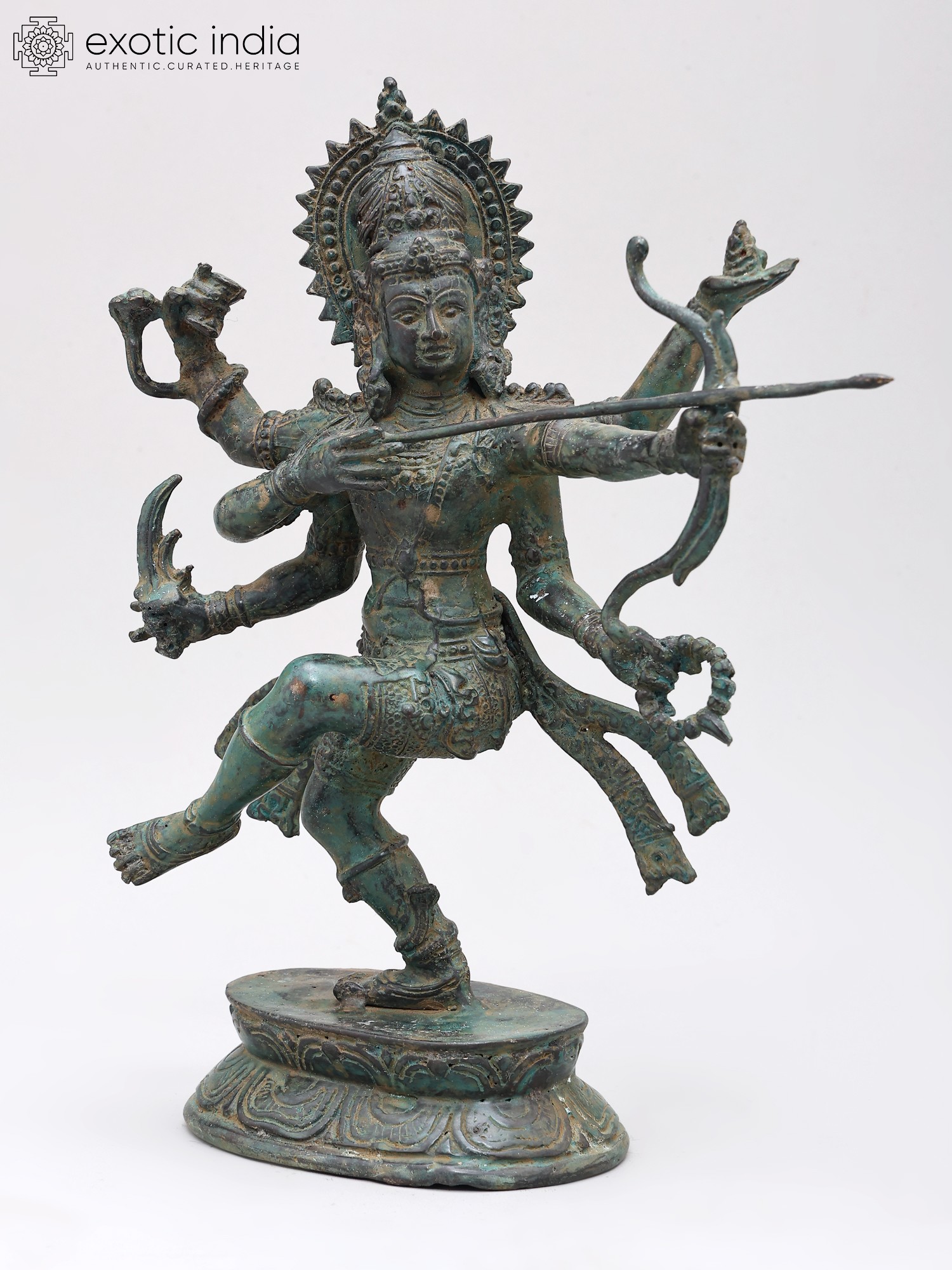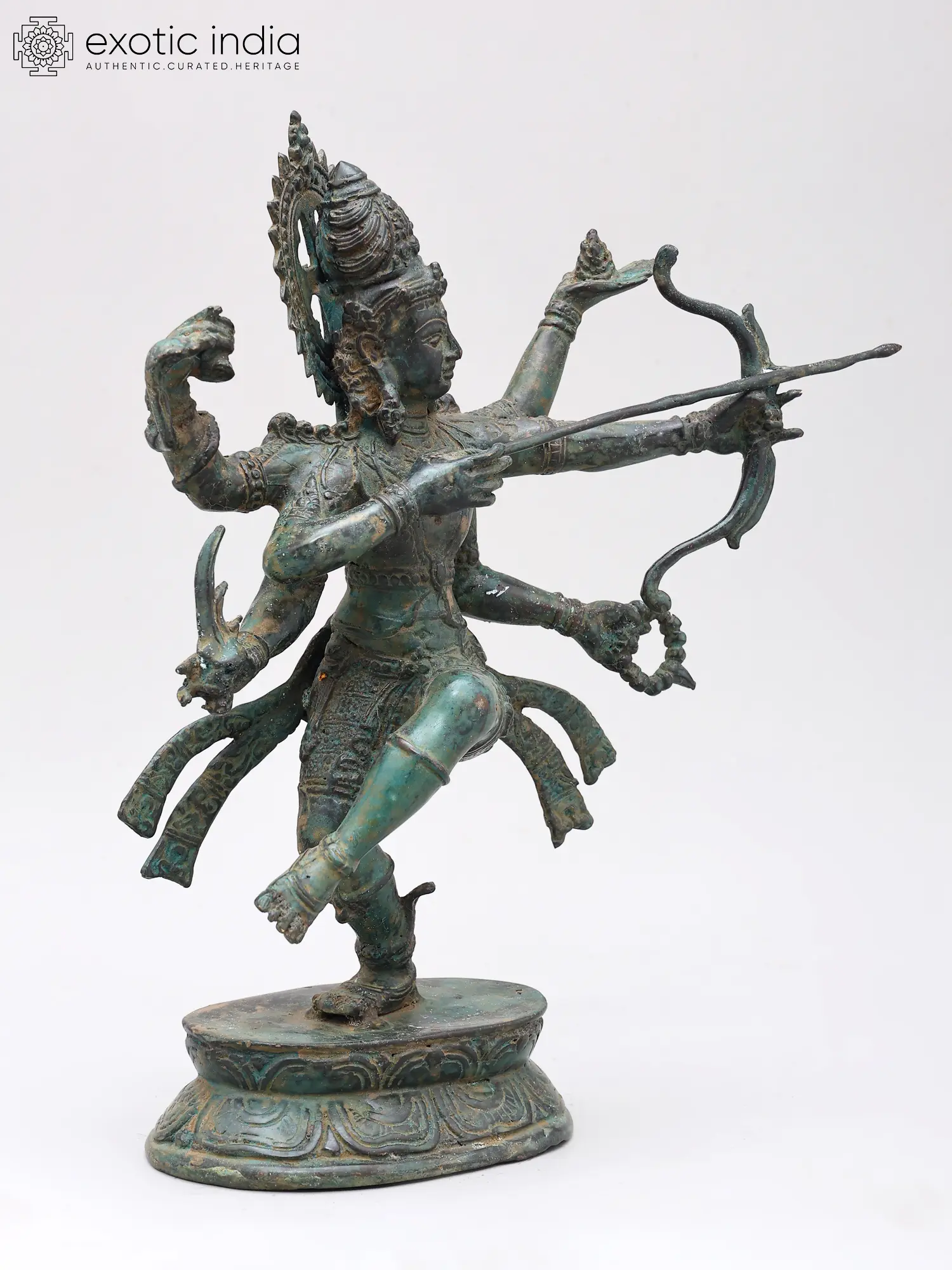This magnificent brass statue captures Lord Shiva in his formidable aspect as Pinakadhari, the wielder of the Pinaka bow. Depicted with multiple arms, each poised for action, this representation embodies Shiva’s power as the destroyer and transformer, a deity who upholds cosmic balance through decisive force. The Patrikalpa, the ritualistic bow, is strung and ready, symbolizing Shiva’s readiness to confront evil and dismantle illusion. The artistry of this piece is evident in the meticulous lost wax casting technique, a time-honored method that imbues the brass with a lifelike presence. The patina, a testament to the passage of time and the elemental forces it represents, lends an ancient aura to the deity. Each detail, from the sharp contours of the bow and arrow to the fierce expression on Shiva's face and the divine adornments, speaks of the skilled craftsmanship involved. The energetic pose, with Shiva’s dynamic stance and swirling drapery, suggests immense power and movement, as if the divine archer is caught in the very act of releasing his celestial arrow. ––––––––––