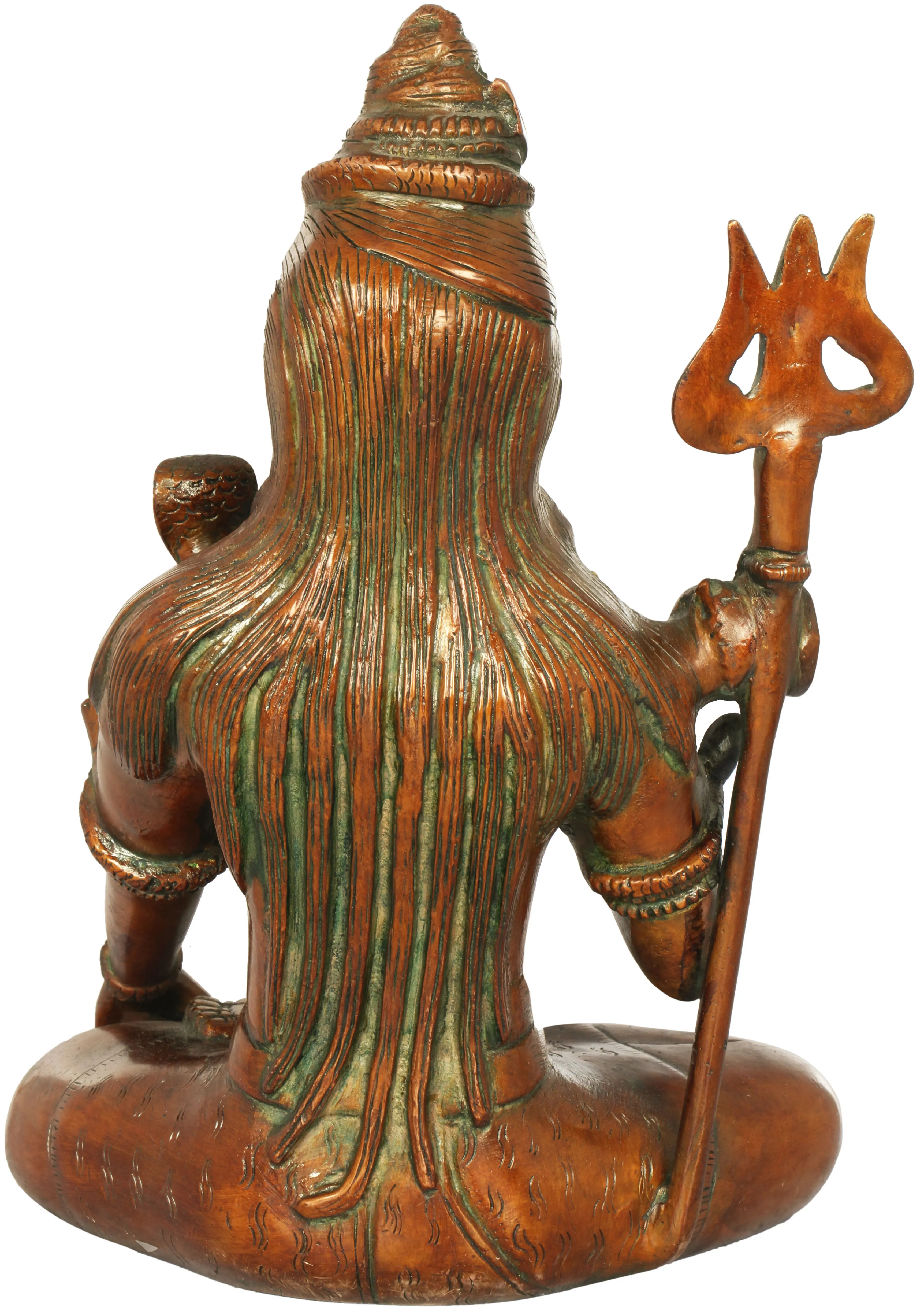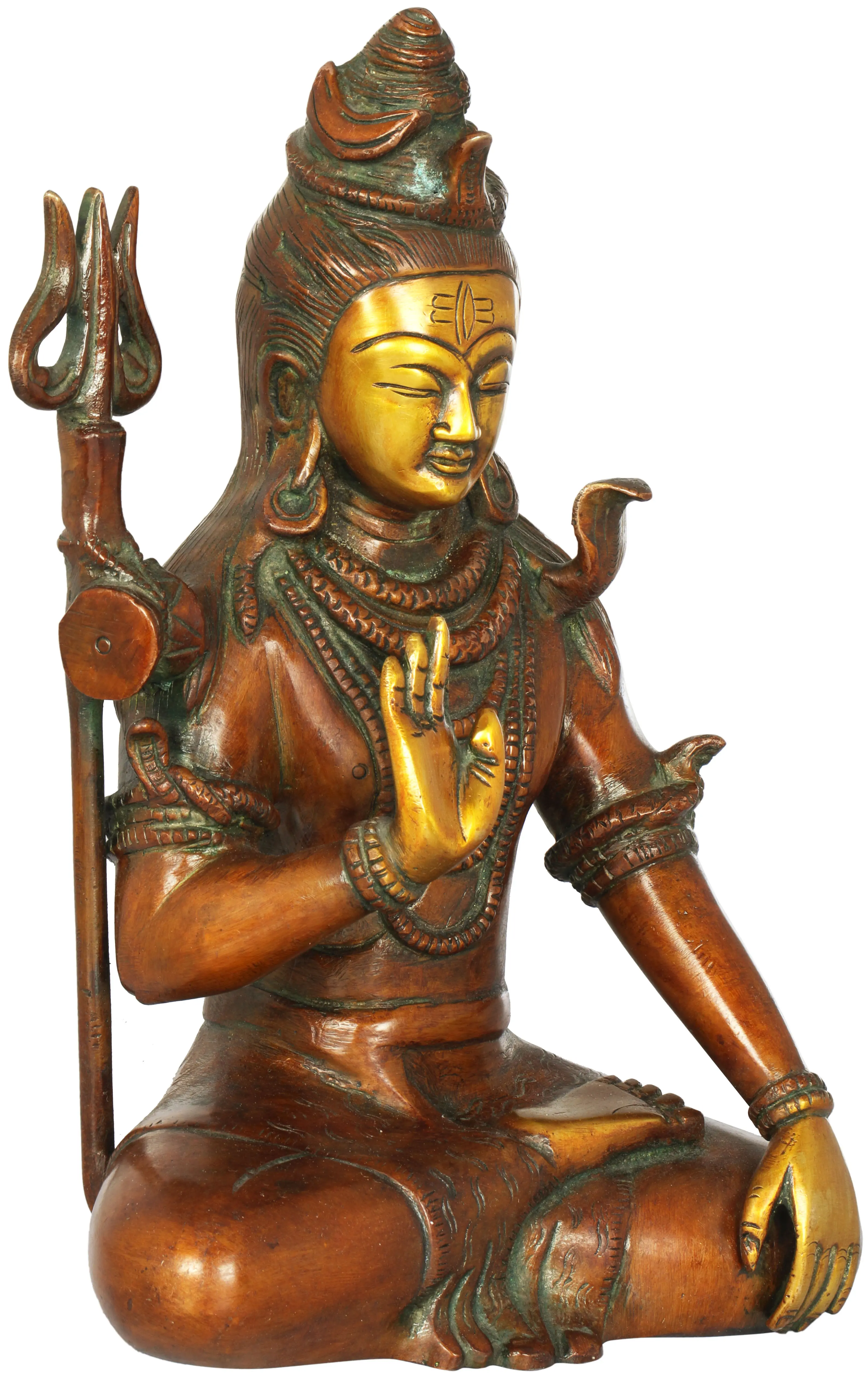 This exquisite brass statue captures the divine presence of Lord Shiva, one of the principal deities of Hinduism and the Supreme Being in Shaivism. Crafted with meticulous detail and artistic flair by skilled artisans in India, this representation embodies the multifaceted nature of Shiva, the destroyer and transformer, the ascetic and the householder, the meditator and the cosmic dancer. The lustrous brass material lends a timeless aura, suggesting the eternal and unchanging aspect of the divine. The posture of the figure, seated in a serene meditative pose, evokes a sense of profound peace and spiritual depth. Lord Shiva is often depicted in Padmasana, the lotus pose, symbolizing purity and spiritual awakening. The serene expression on his face, with closed eyes, suggests deep contemplation and inner tranquility, reflecting his role as the meditator par excellence. The third eye on his forehead, a potent symbol of spiritual insight and wisdom, is intricately rendered, hinting at his omniscience and ability to perceive the universe beyond the mundane. The tilak, a sacred mark, further adorns his forehead, signifying his divine authority.