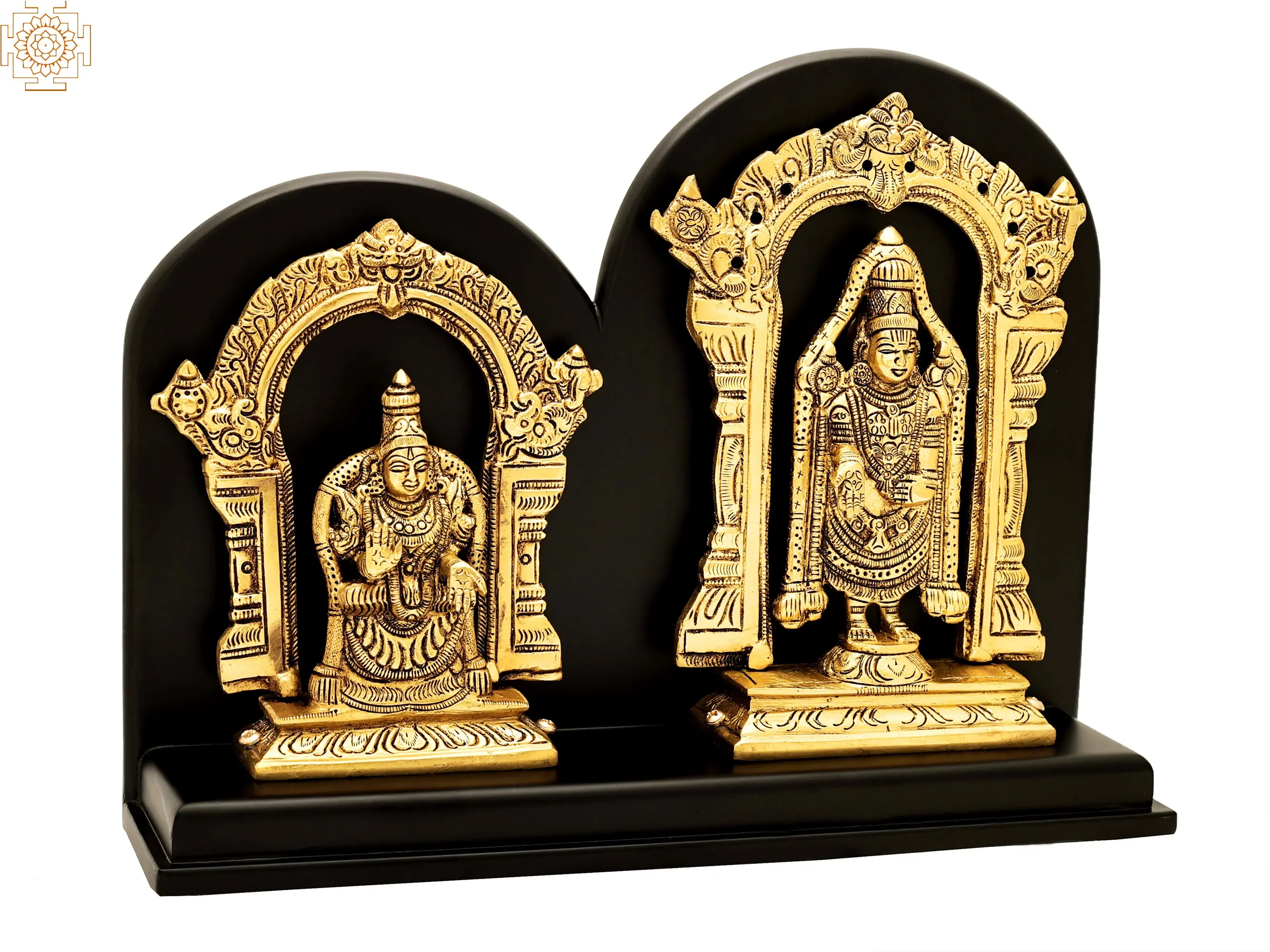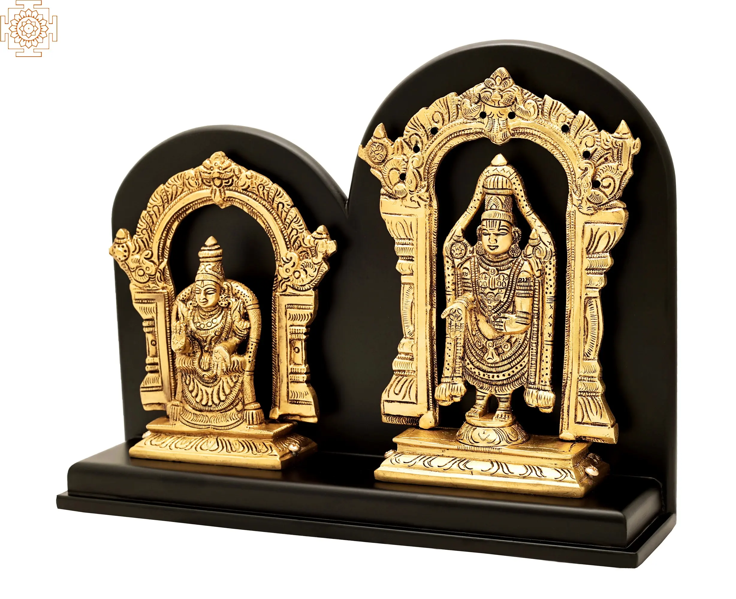 This Lord Venkateswara as Balaji at Tirupati with Goddess Lakshmi is a divine brass statue adorned with wood, meticulously handmade in India. This sacred representation showcases Lord Venkateswara, a revered deity in Hinduism, alongside Goddess Lakshmi, the goddess of wealth and prosperity. The intricate craftsmanship reveals the fine details of the brass sculpture, emanating a sense of spiritual presence.