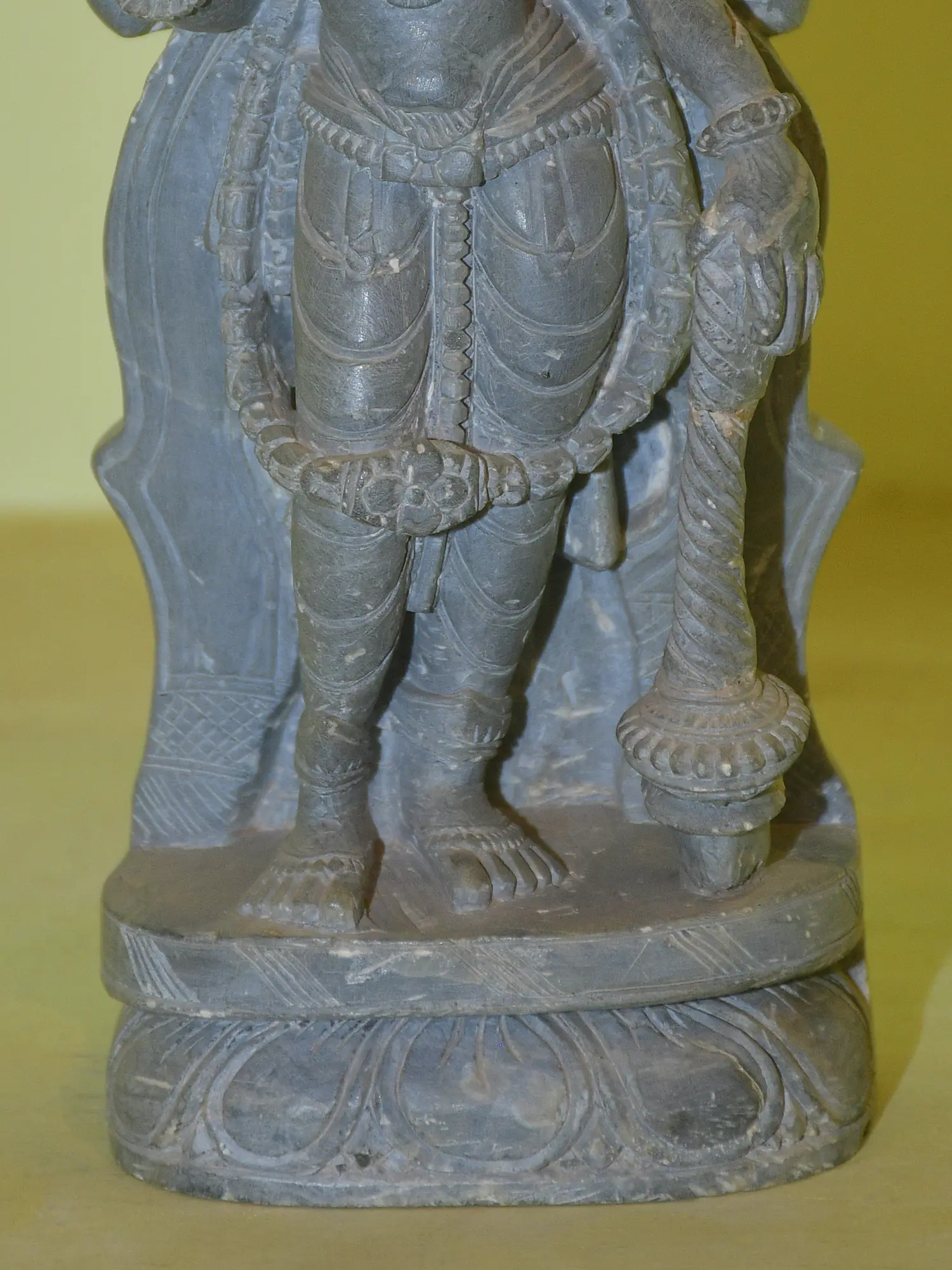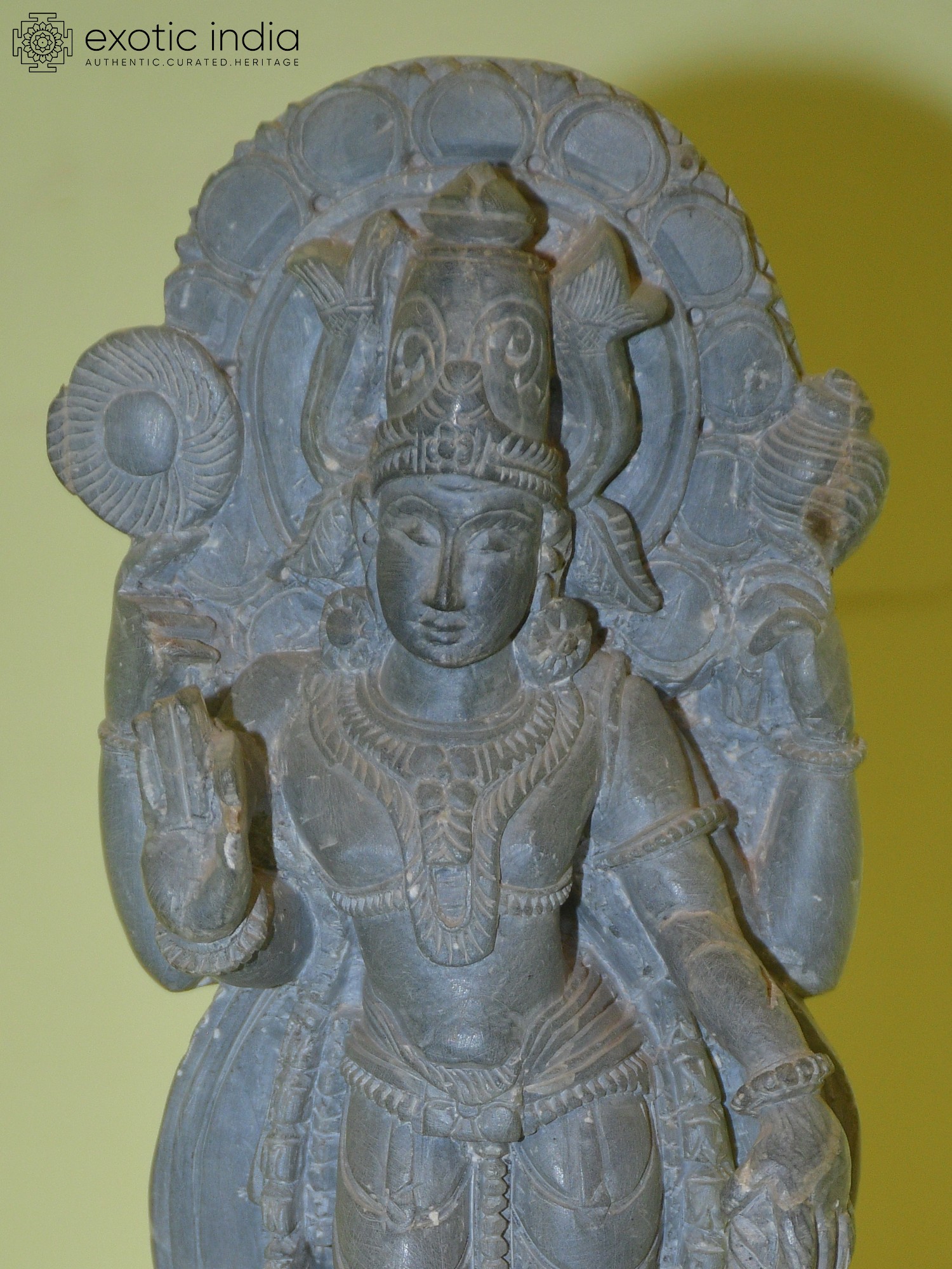 This exquisite stone carving brings to life Lord Vishnu, the supreme protector and preserver of the universe in Hindu mythology. Crafted with meticulous detail from Orissa stone, this statue captures the divine essence of Vishnu in a posture of serene authority. His iconic attributes are prominently displayed: the mace (Gada), symbolizing strength and power; the conch shell (Shankha), representing the primordial sound of creation; and the discus (Chakra), a celestial weapon signifying cosmic order and destruction of ignorance. Each element is rendered with a precision that speaks to the sculptor's deep understanding of the deity and their artistry. The posture of the statue is significant. Vishnu's primary hands are often depicted in a gesture of blessing or reassurance, while the secondary hands hold his sacred weapons. This particular depiction showcases Vishnu in his quintessential form, ready to uphold dharma and restore balance to the cosmos. The Gada, held firmly, signifies his ability to crush evil, while the Shankha, often shown emitting its resonant sound, is a reminder of the eternal cycle of creation, sustenance, and dissolution. The powerful Chakra, a symbol of his unwavering vigilance, is a testament to his omnipresence and his role in maintaining universal harmony.