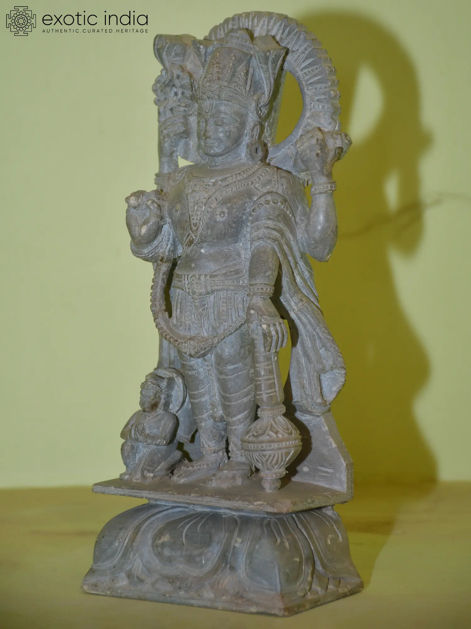 This exquisite hand-carved stone statue captures a profound moment of divine presence and unwavering devotion. At its center stands Lord Vishnu, the preserver of the cosmos, a central deity in Hinduism, renowned for his role in maintaining cosmic order and righteousness. He is depicted in his majestic form, embodying serenity and omnipotence. Lord Vishnu is known to descend to Earth in various avatars to protect dharma and vanquish evil, a testament to his boundless compassion and commitment to the universe's well-being. His presence in this sculpture evokes a sense of peace and stability, a reminder of the divine hand that guides and sustains all. ––––––––––
