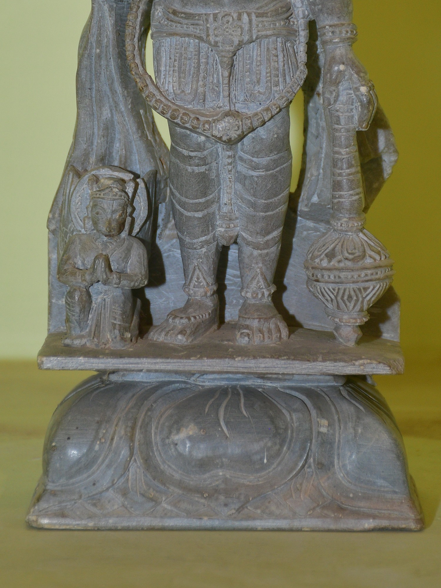 To the left of Lord Vishnu, in a posture of humble supplication, is Lord Hanuman. This beloved deity, an ardent devotee of Lord Rama, is the epitome of strength, loyalty, and selfless service. Hanuman's devotion is legendary, famously demonstrated when he leaped across the ocean to Lanka in search of Sita and carried the entire Sanjeevani mountain to save Lakshmana. His presence alongside Vishnu underscores the interconnectedness of divine powers and the importance of steadfast devotion. Hanuman represents the ideal servant, always ready to aid and protect, his faith an unshakeable pillar. ––––––––––
