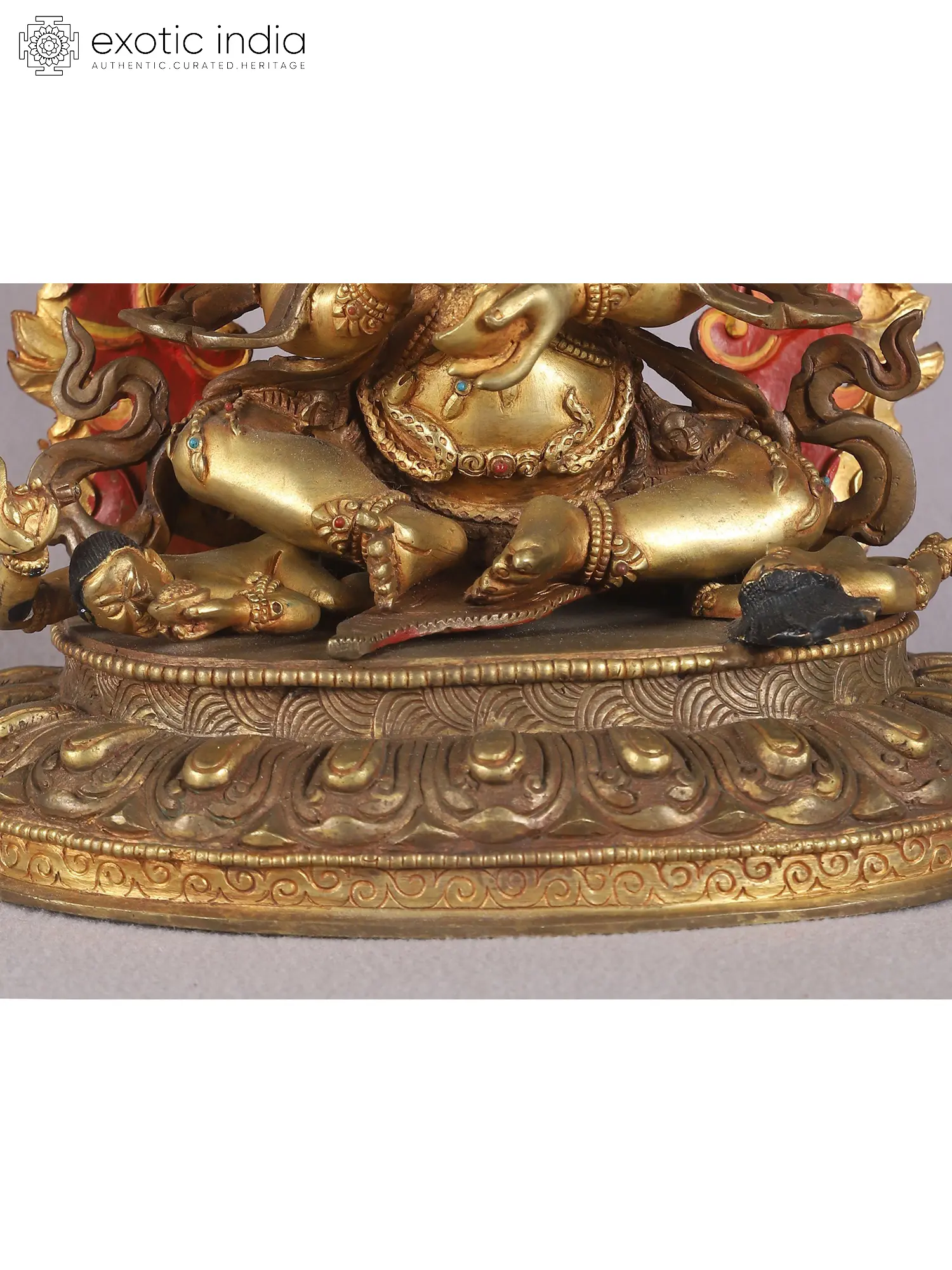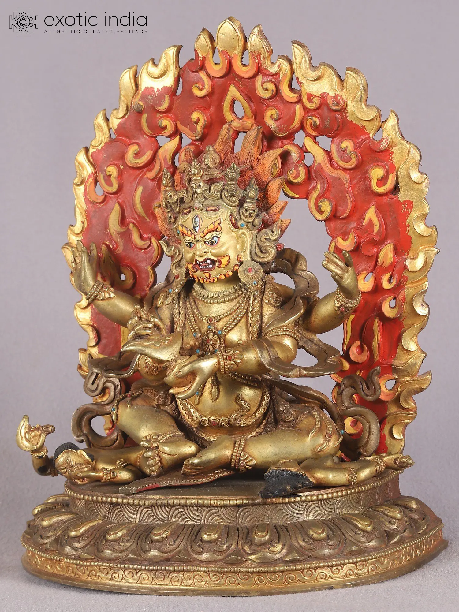Adorned with intricate ornaments, the flaming aureole around Mahakal has been delineated with immense beauty, coloured in brilliant red, yellow and golden to capture the light of wisdom it represents. Mahakala is the protector or guardian god in Buddhism. Mahakala is also known as a Dharmapala, an angry god or a fierce deity whose job is to protect or uphold the law. The term “angriness” is used to describe their ability to protect Buddhist followers from harm and enemies. He has three eyes, which symbolize his clear understanding of the three times.