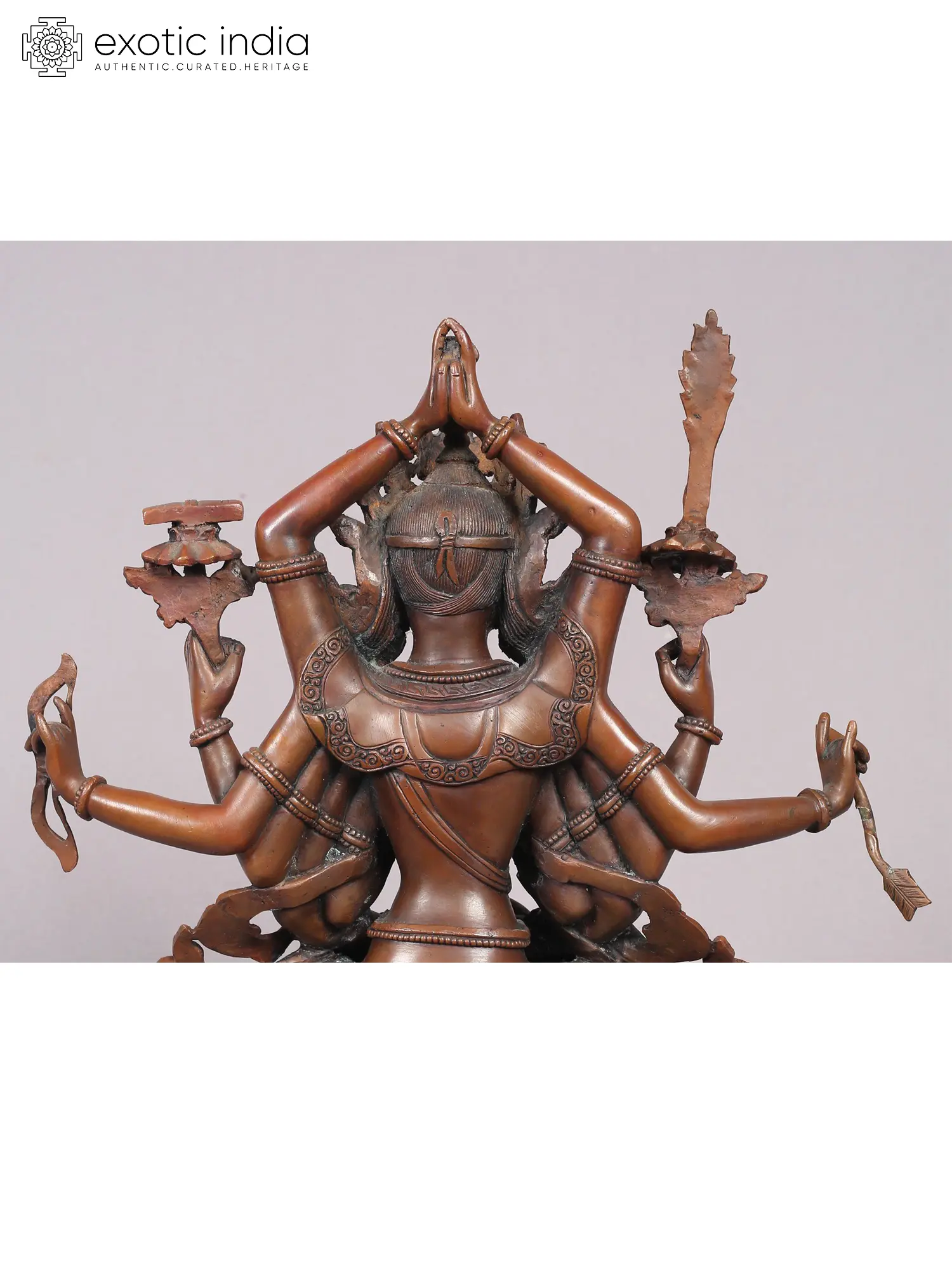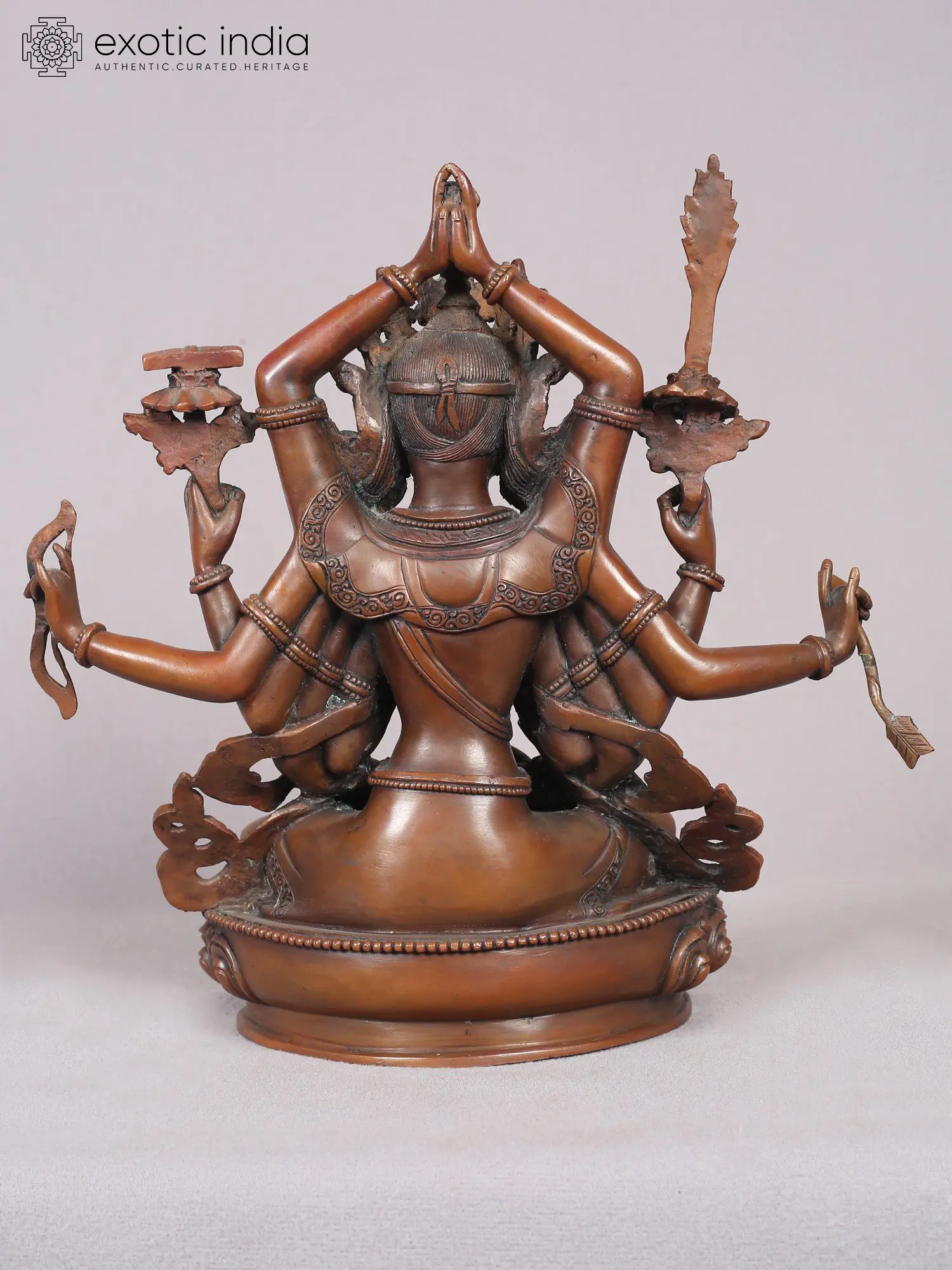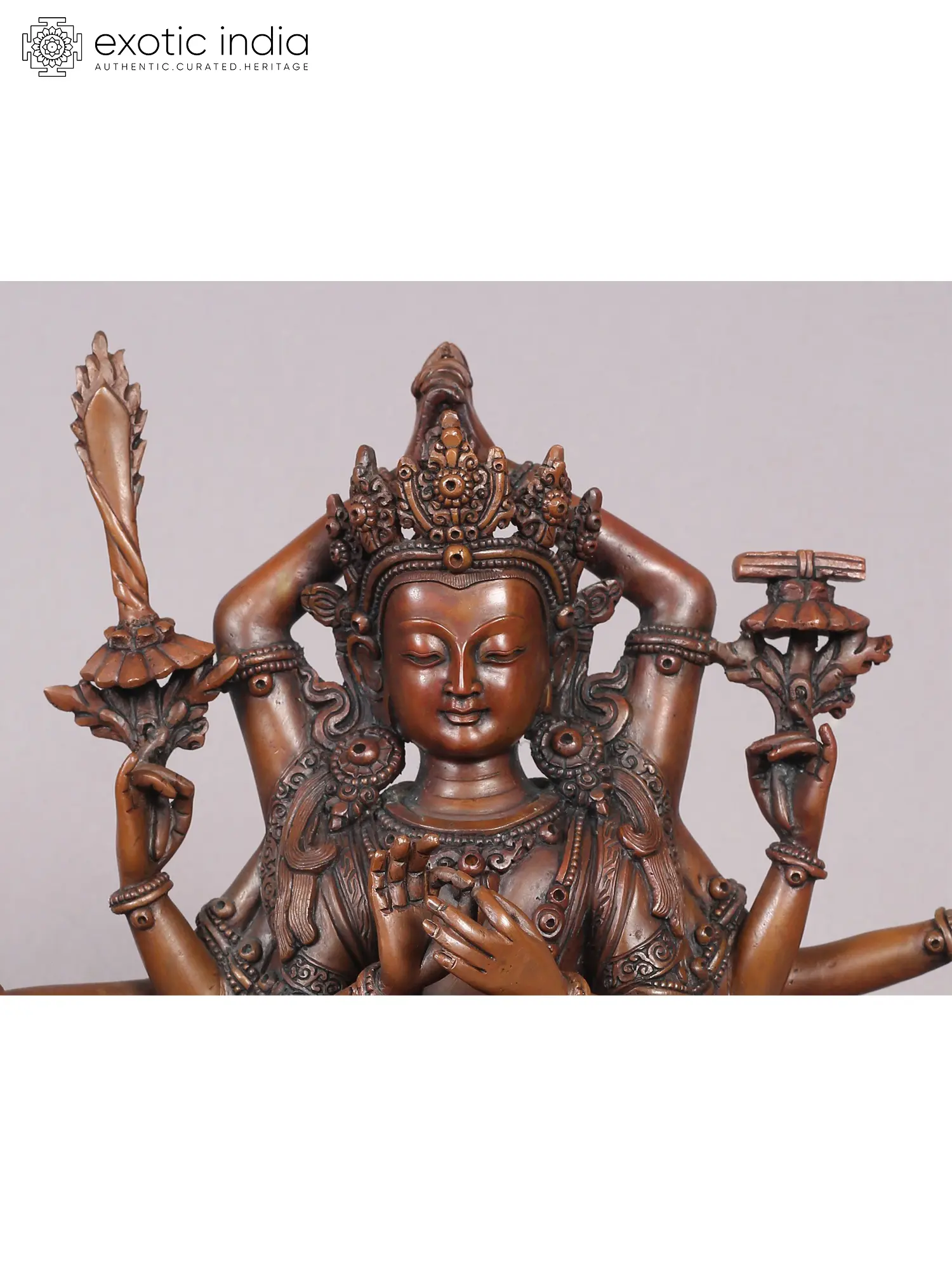 The Manjushri Nama-Samgiti sculpture embodies the essence of the Bodhisattva Manjushri. The finely crafted statue portrays Manjushri with ten graceful hands, poised upon a delicate lotus throne. In his right hand, he wields a fiery sword of wisdom, symbolizing the power to sever ignorance and illuminate the path to enlightenment. In his left hand, he holds a lotus with a bow and arrow, representing purity and precision in spiritual journey. Two hands gracefully cradle an alms bowl resting on his lap, while the remaining two hands grace the space behind his head.