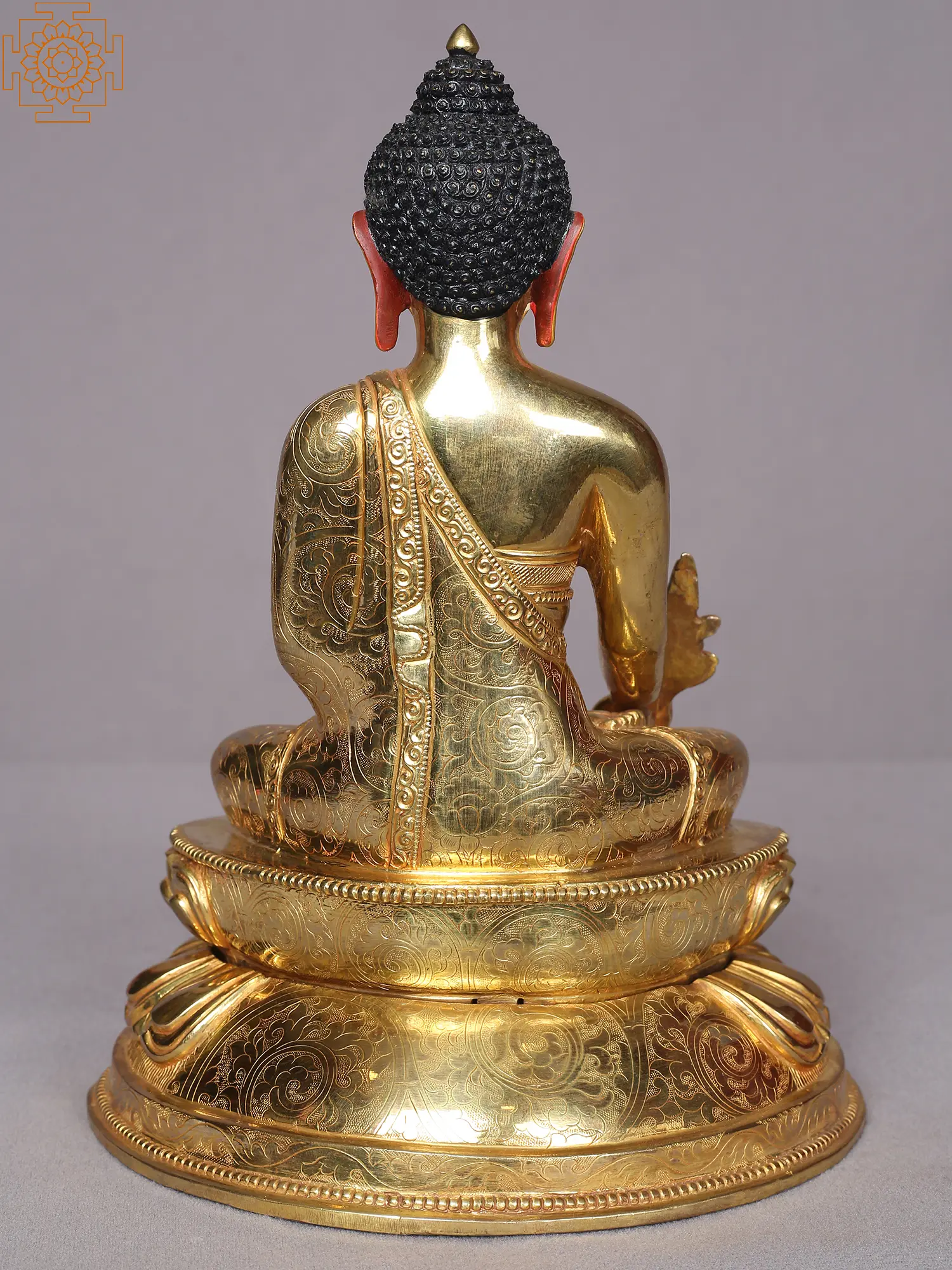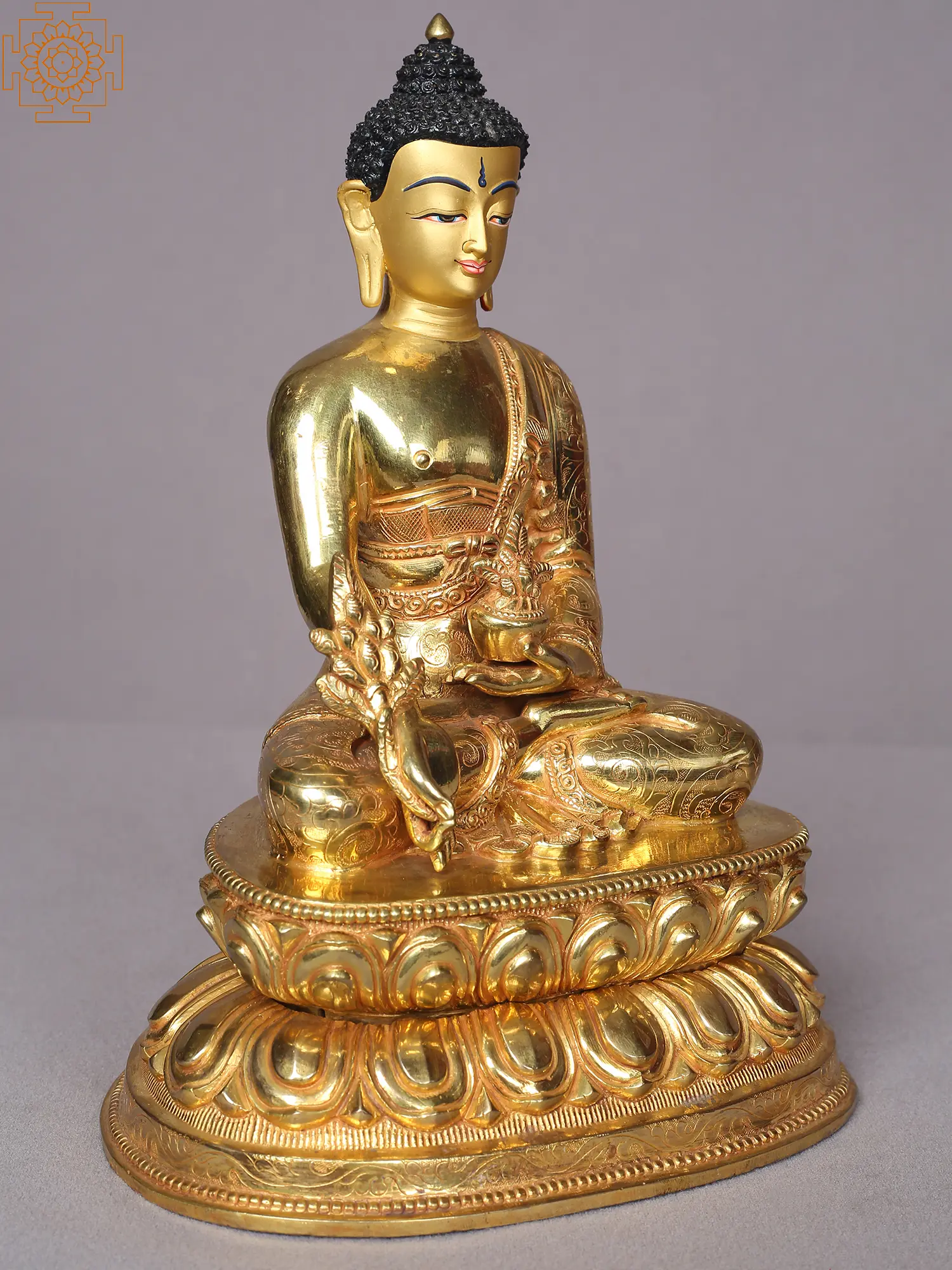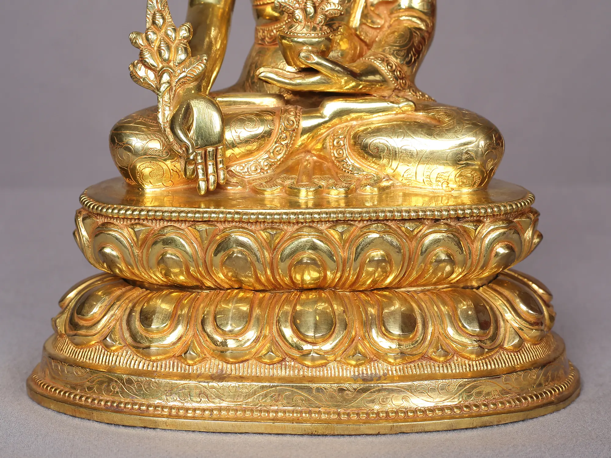 Buddhism lays out the road a person must take to achieve spiritual success with a single-minded focus on the ultimate objective of human life—Enlightenment. The follower turns to the Medicine Buddha, also known as Buddha Bhaisajyaguru, for protection against the negative effects of the visible and unseen evil forces because obstacles and difficulties that wear down the soul are a natural part of this pious path. This copper Medicine Buddha from Nepal embodies the forces that may purify the environment both within and outside of your body and psyche.