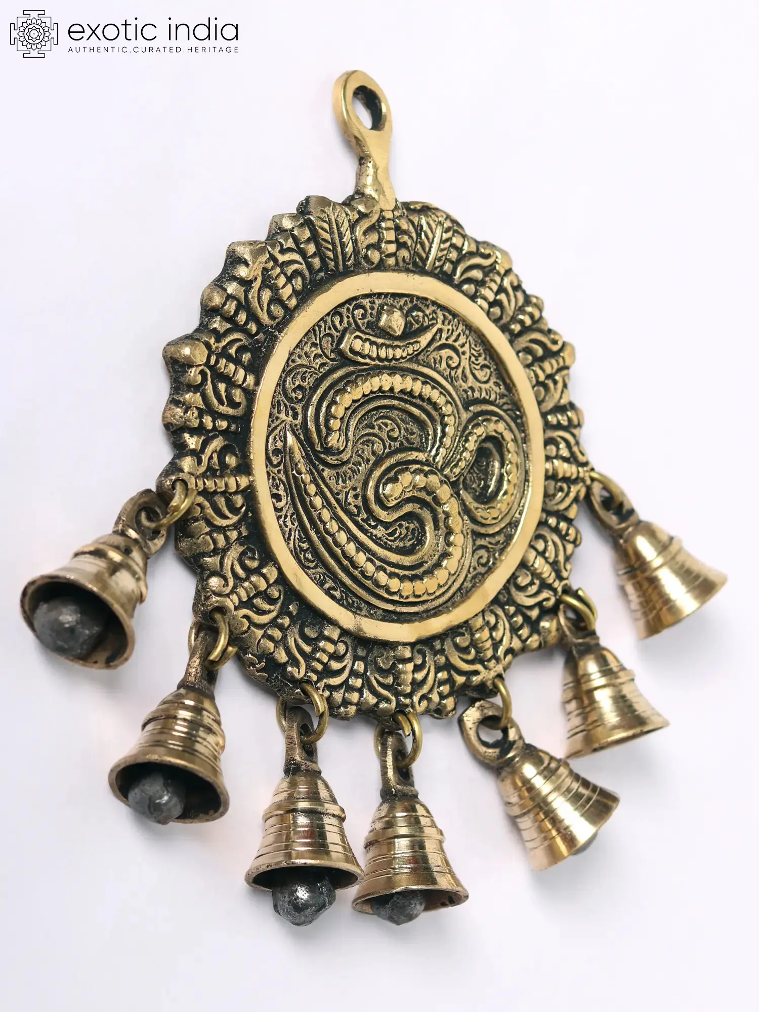 This brass wall hanging OM (AUM) exudes peace and charm. It is created like a bloomed flower surrounding a central Om symbol made with brass-colored dots for extraordinary divine beauty. The wall-hanging base is adorned by six bell-like objects, which produce a pleasant melody when tinkle. On the exterior, it would look wooden but be brass, combining beauty and strength. This wall hanging is not just an eye-catching addition to your space but also has spiritual connotations. It is, therefore, a perfect addition to the decor and oneself as it can be used for both decoration and introspection.