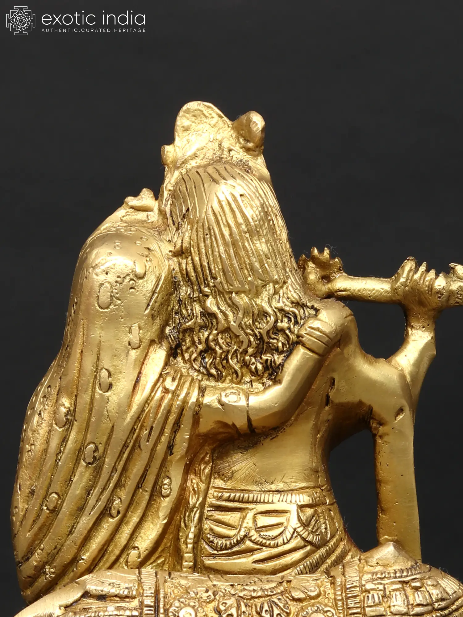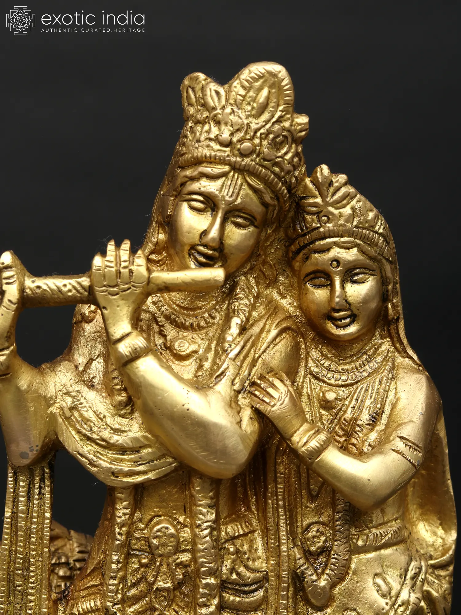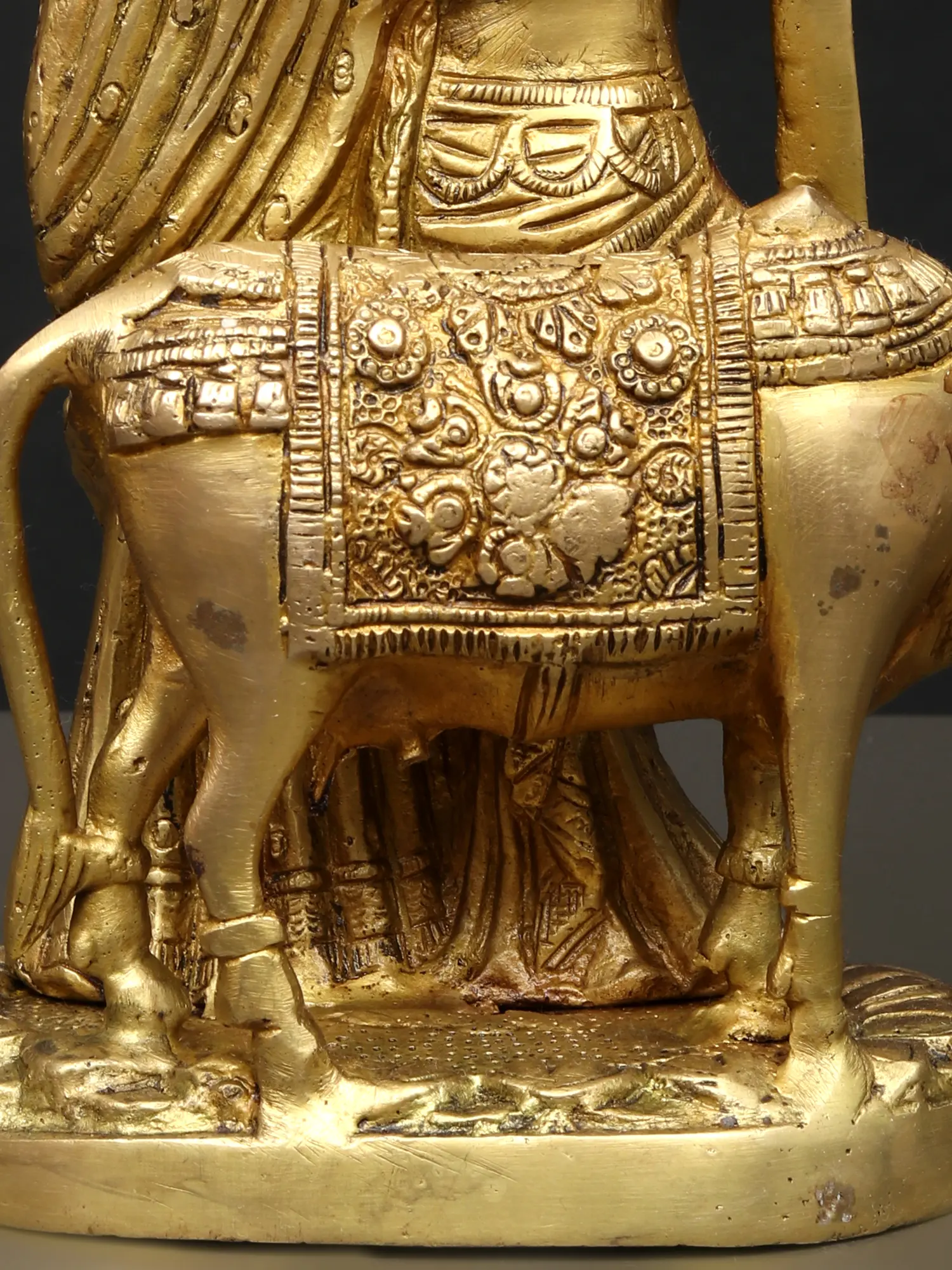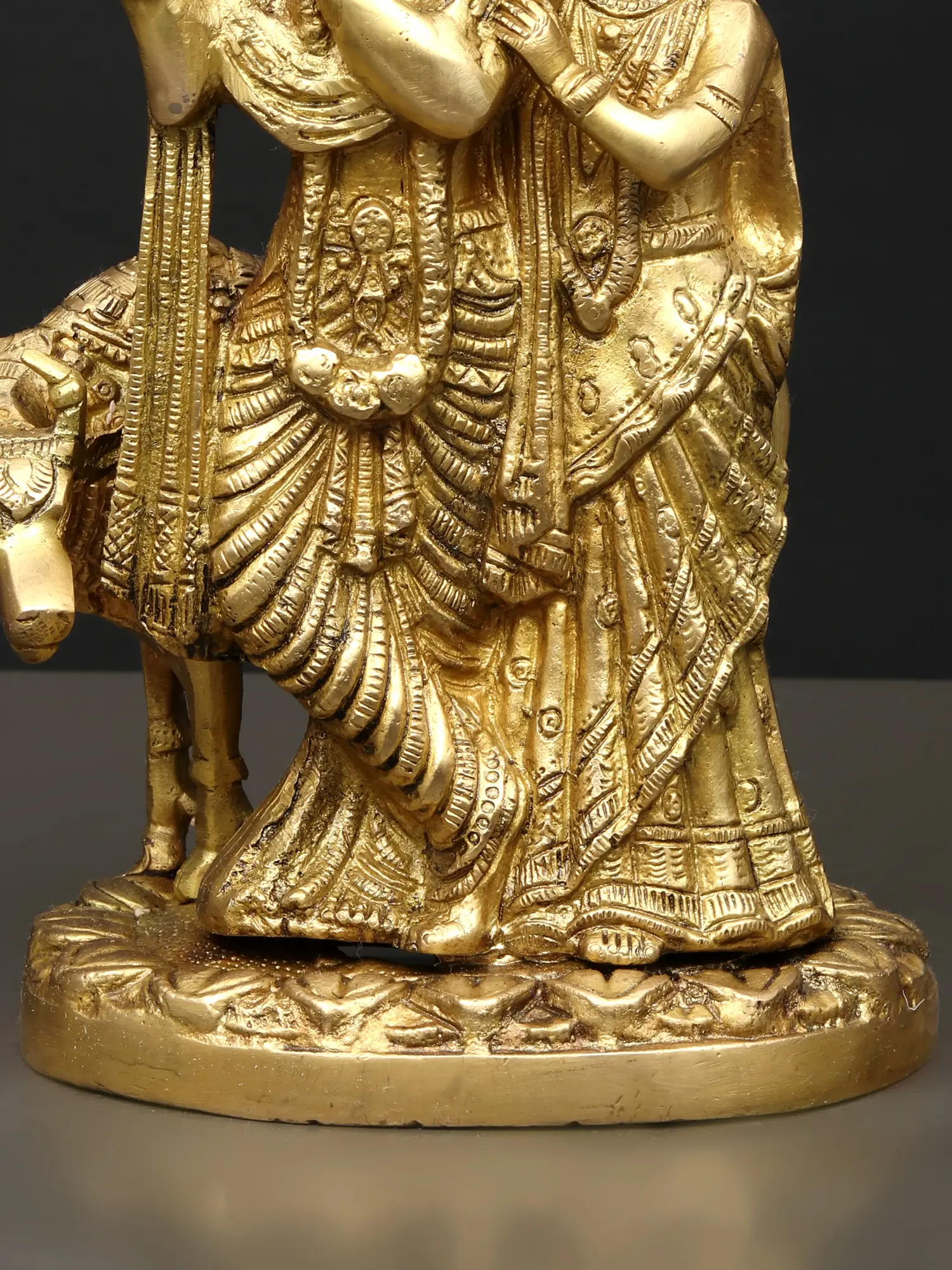 Lord Krishna, the embodiment of celestial love, stands poised, a melody flowing from his enchanting flute. His radiant form beckons the very essence of divinity. Beside him, Radha, the epitome of devotion, graces the scene with ethereal beauty. Her hand, adorned with grace, rests gently on Krishna’s shoulder, symbolising their eternal bond. The sacred cows, their benevolent presence, mirror the tranquillity of the universe. This idyllic brass tableau, bathed in the golden hues of devotion and purity, encapsulates the eternal love story of Radha and Krishna, a divine love that knows no bounds.