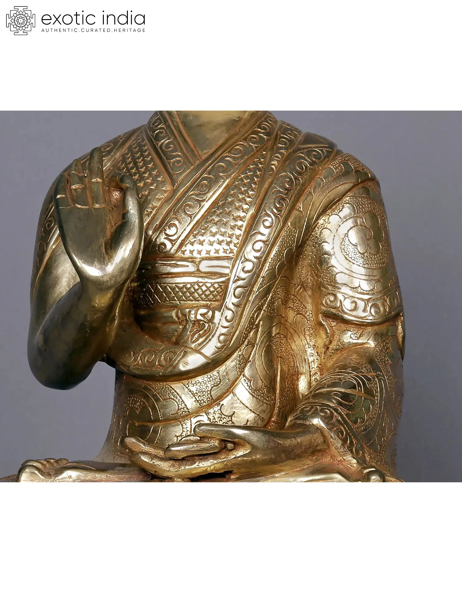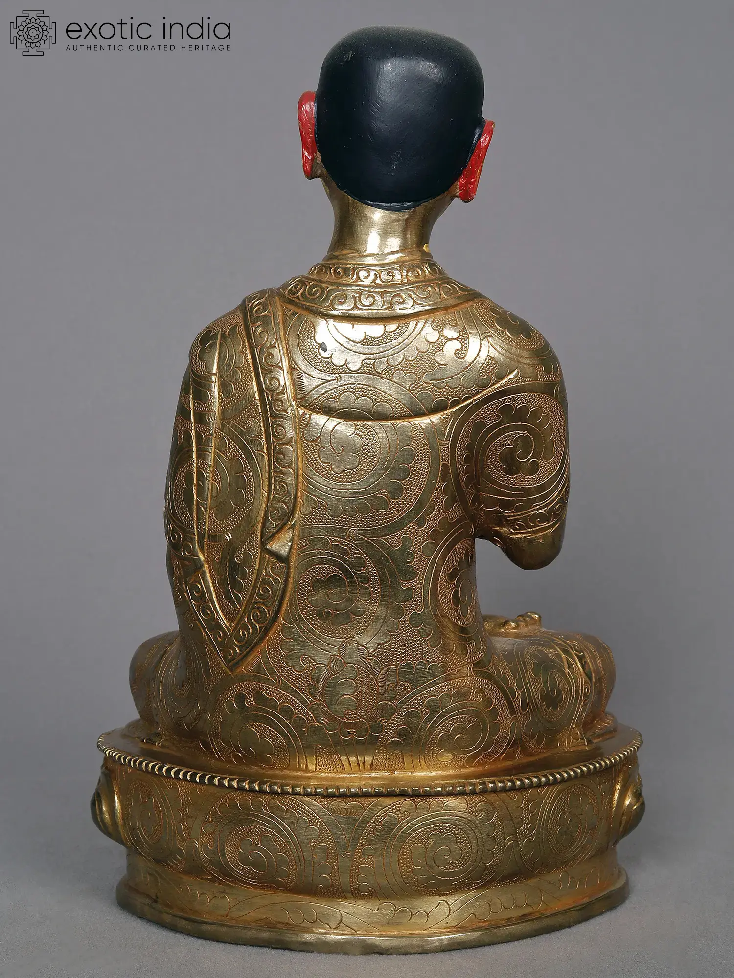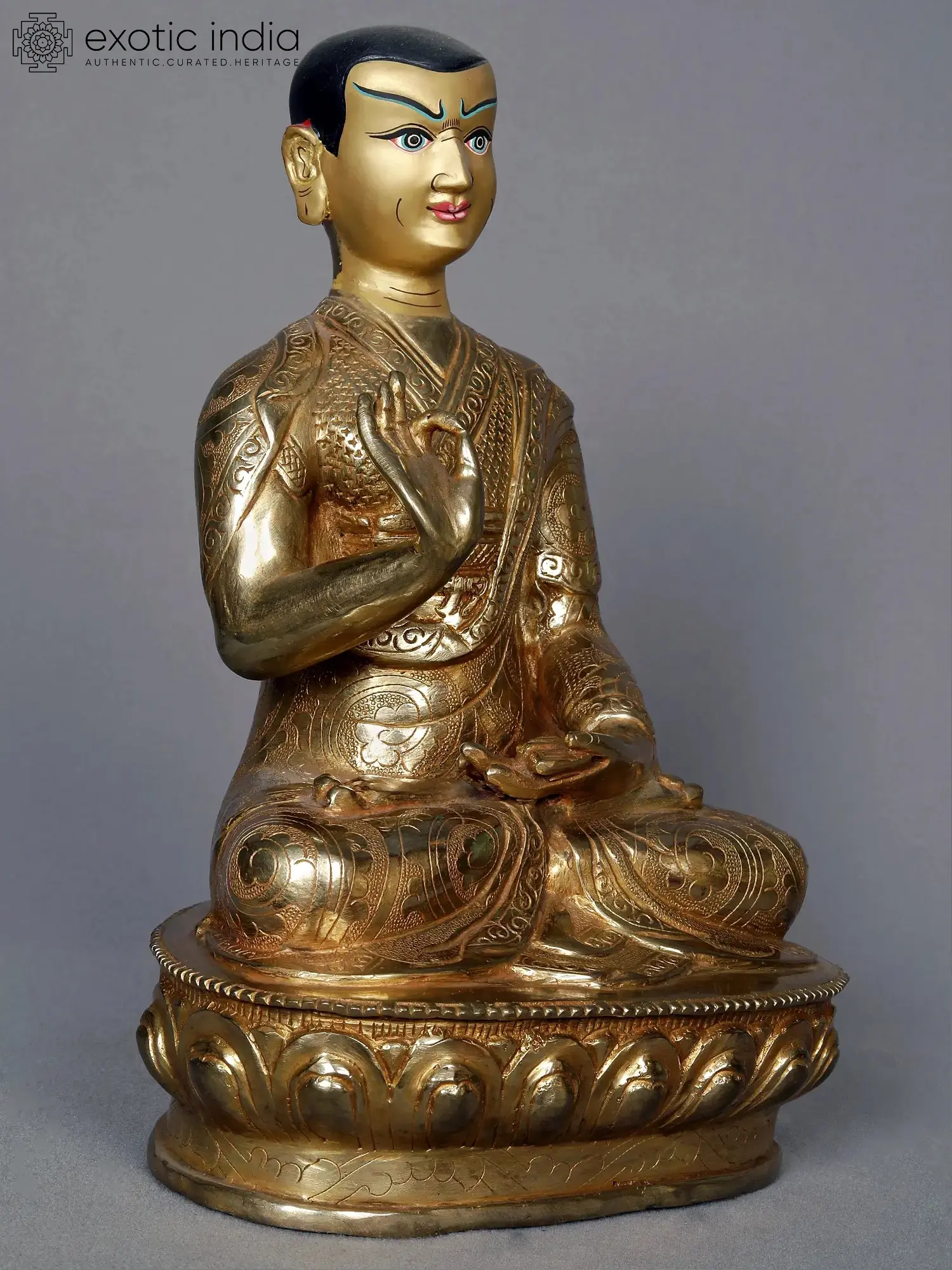 Founder of the Order of the Virtuous or the Gelugpa sect, Guru Tsongkhapa is an eminent persona in the culture of Nepalese and Tibetan Buddhism. The three gilded copper statues of Tsongkhapa from Nepal present the great Vajrayana master on the blooming lotus of enlightened wisdom, in the act of imparting knowledge to his followers. The facial expressions of Tsongkhapa in each statue are that of an astute master, firm in his will to resolve the troubles of his followers.
