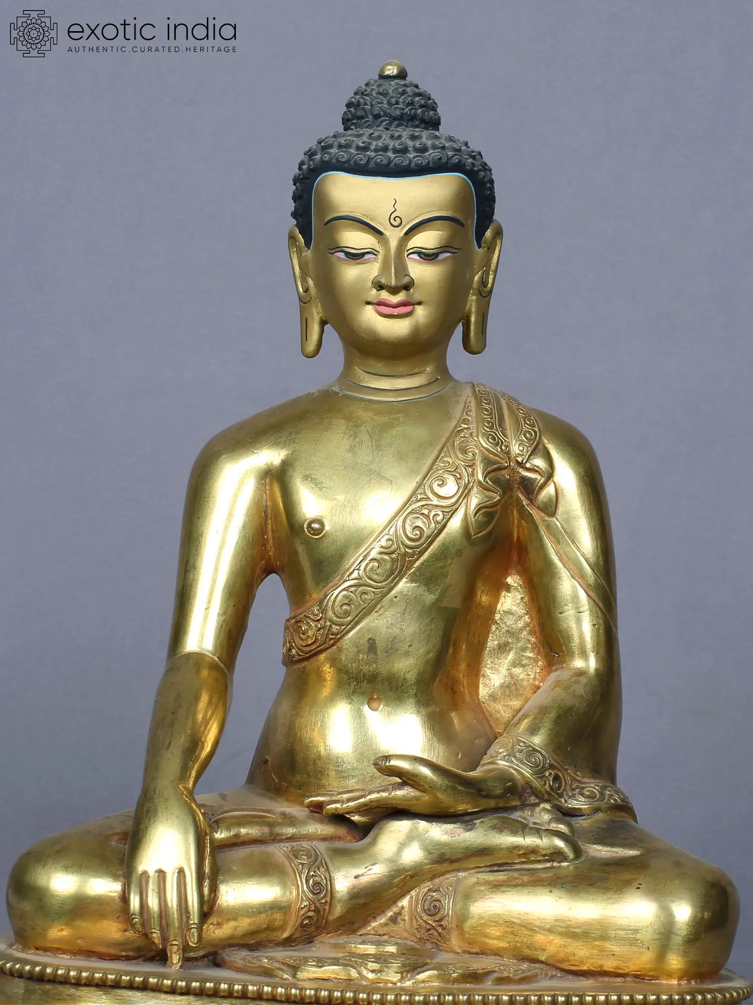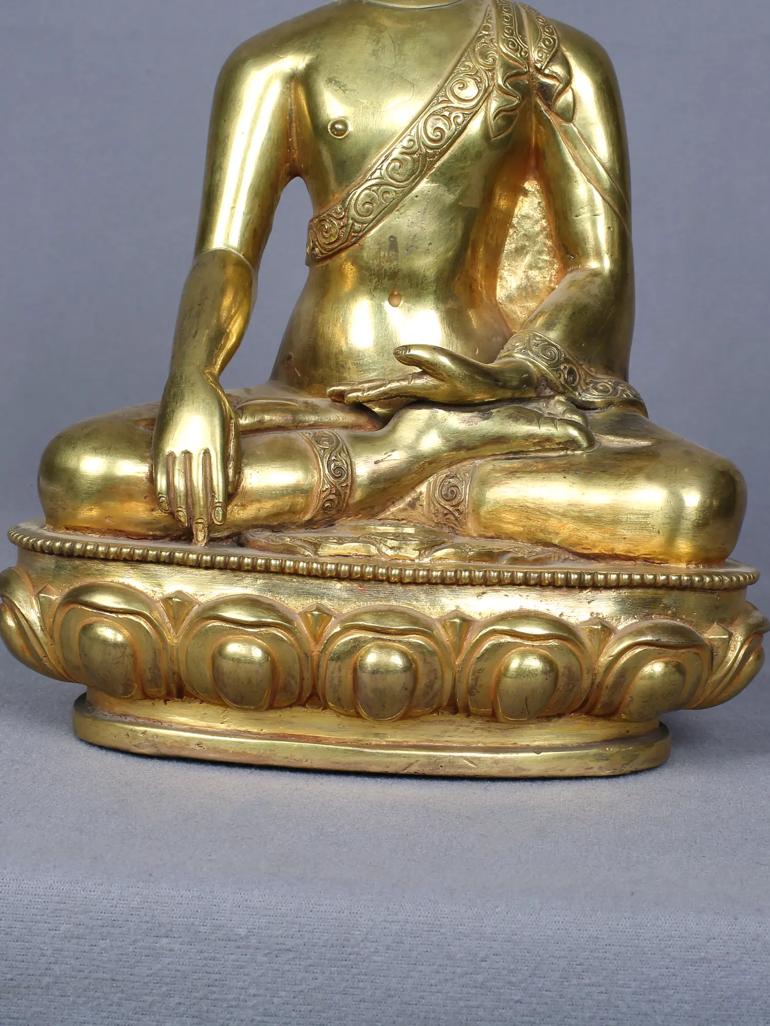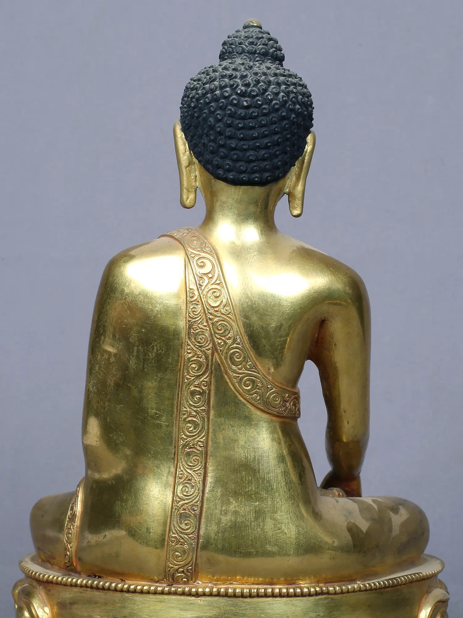 This exquisite piece is fashioned from copper, a metal revered for its conductivity and association with the divine. The statue is then gilded with gold, a precious metal symbolizing purity, enlightenment, and the radiant nature of Buddhahood. This meticulous process, carried out by skilled artisans, imbues the statue with a palpable sense of reverence and dedication. The gold finish catches the light, illuminating the Buddha's features and creating an aura of tranquility.