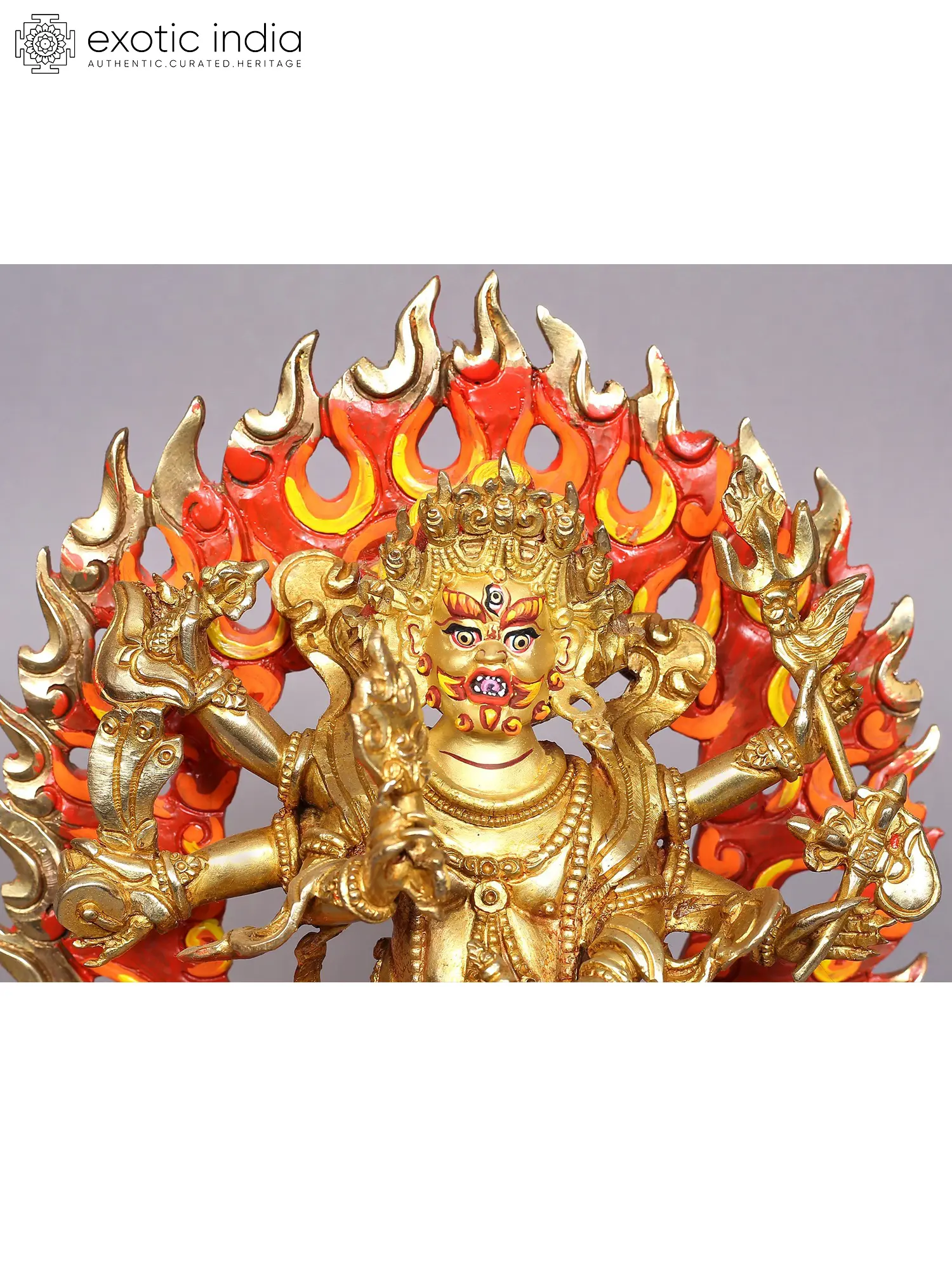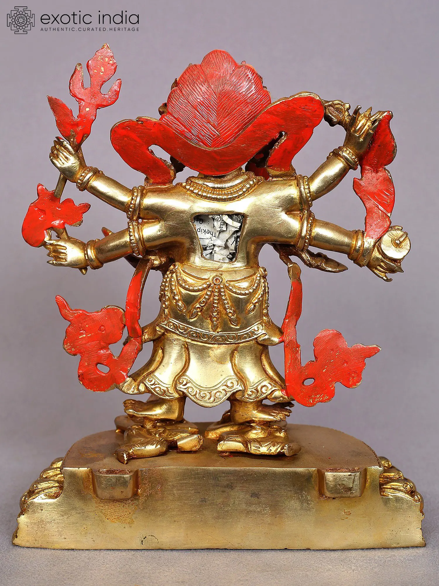 Mahakala's six arms and various attributes symbolize different aspects of his role and power. The five skulls adorning his crown represent the five poisons, namely Desire, Hatred, Ignorance, Jealousy, and Ego, which transform into wisdom under his influence.