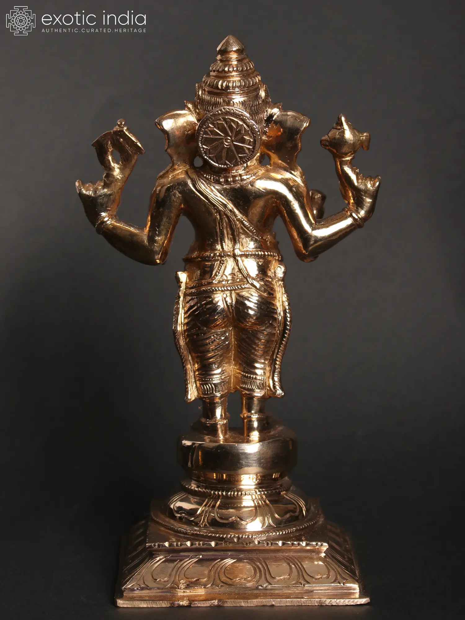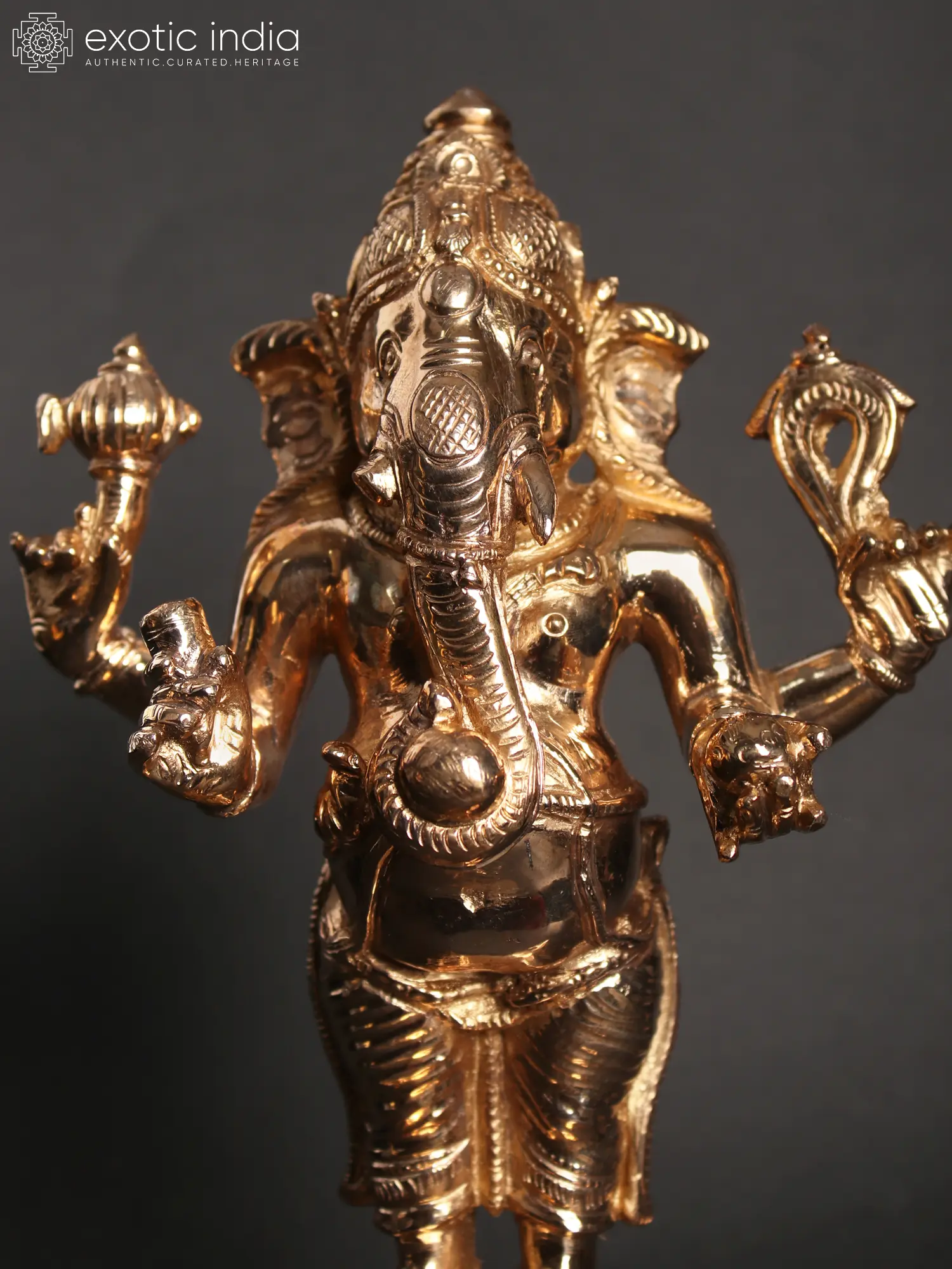 The beauty of Lord Ganesha, as described in the Ganesha Purana, is ineffable, capturing the essence of divinity and auspiciousness. This Standing Four-Armed Lord Ganesha bronze statue, embodying the Chaturbhuj form, is a splendid representation of the deity. With his upper hands gracefully holding the Pasha (noose) and Ankusha (goad), and his lower hands adorned with the broken tusk and bilwa fruit, the statue emanates a divine aura.