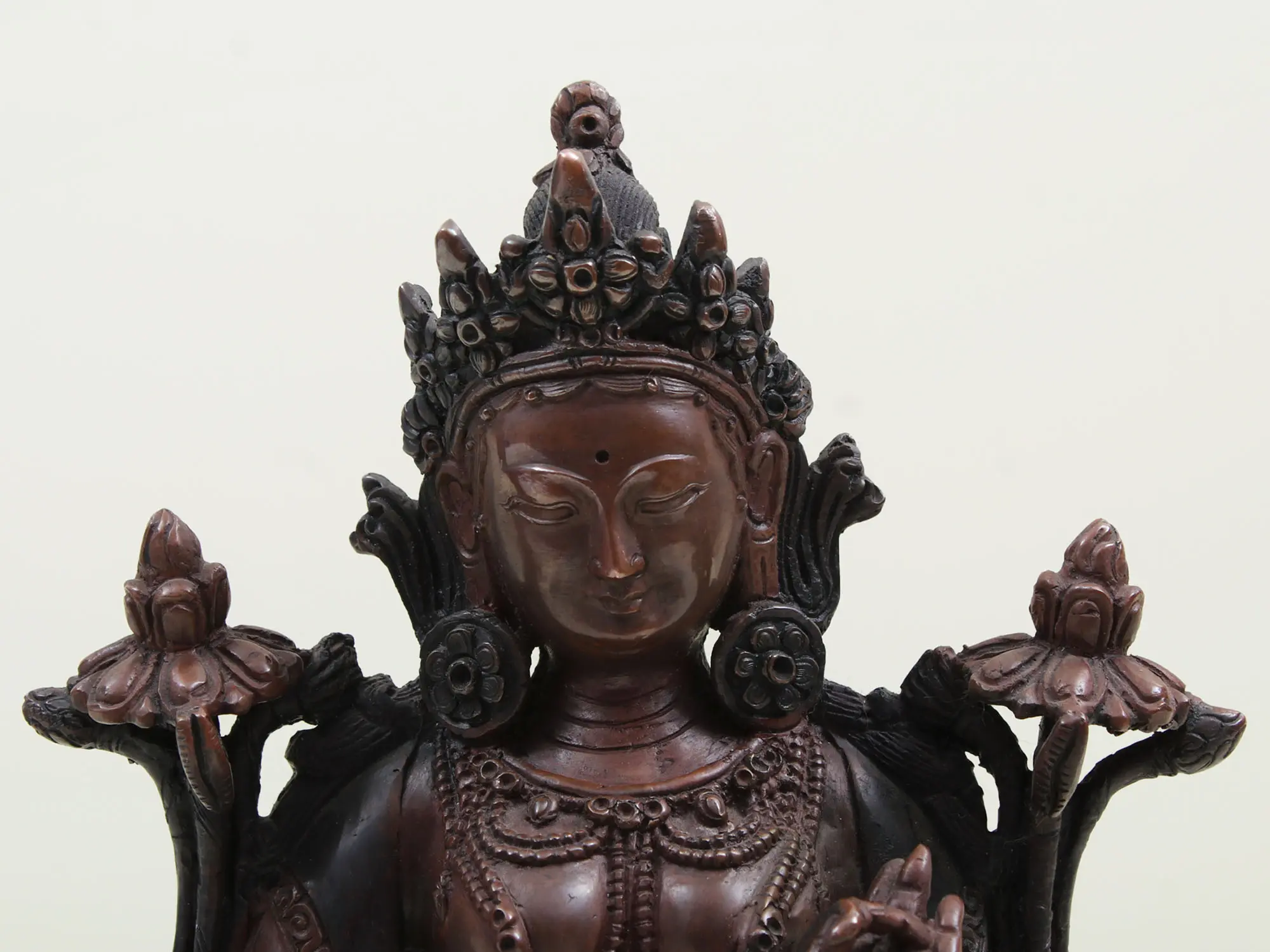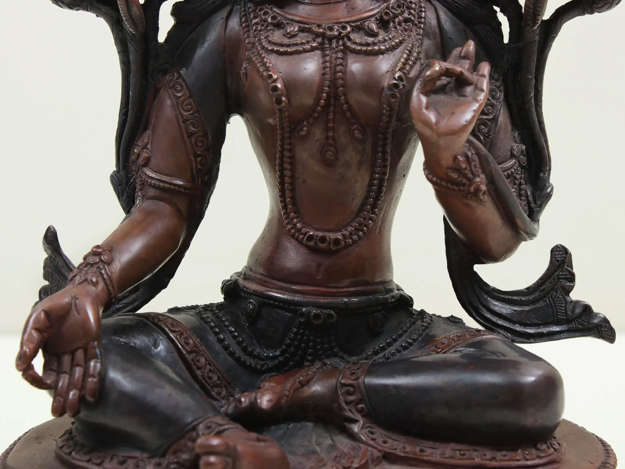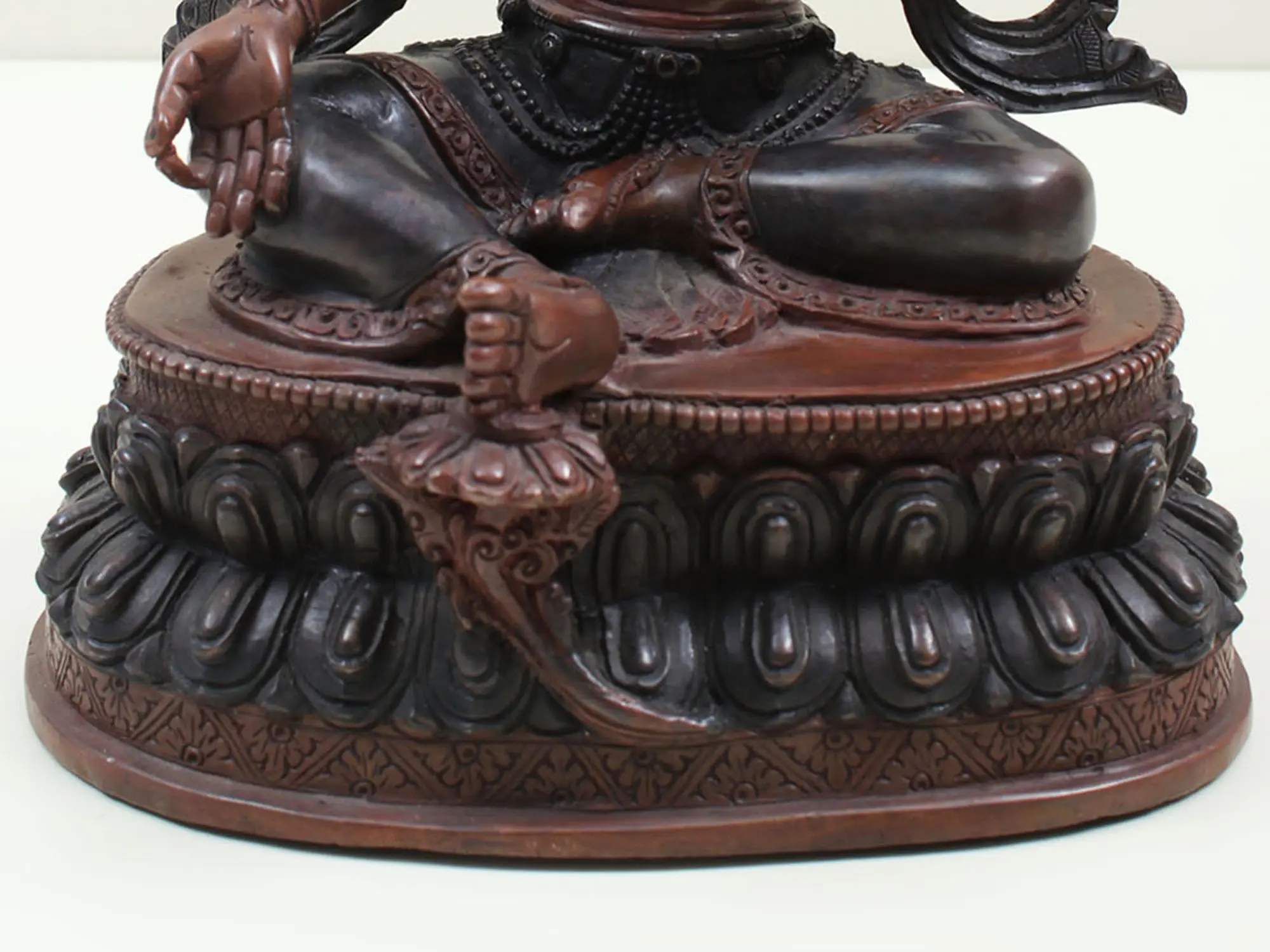 The work of art you are looking at is a beautiful statue of Green Tara crafted with the perfection of devotion by the artisans of Nepal. The five-pronged Buddhist crown, whose tassels produce lovely waves, exquisite traditional ornaments, and a luxurious polished texture gives the icon a beautiful appearance. The statue of Tara has ethereal features that are animated by her sparse eyebrows, serene eyes, pointed nose, and delicate mouth. Her silken clothing clings to and flows around her lithesome shape, and is expertly detailed. Enthroned on a lovely lotus seat, Green tara extends her leg into the realm of the humans, symbolizing her earnestness in answering the prayers of her devotees.