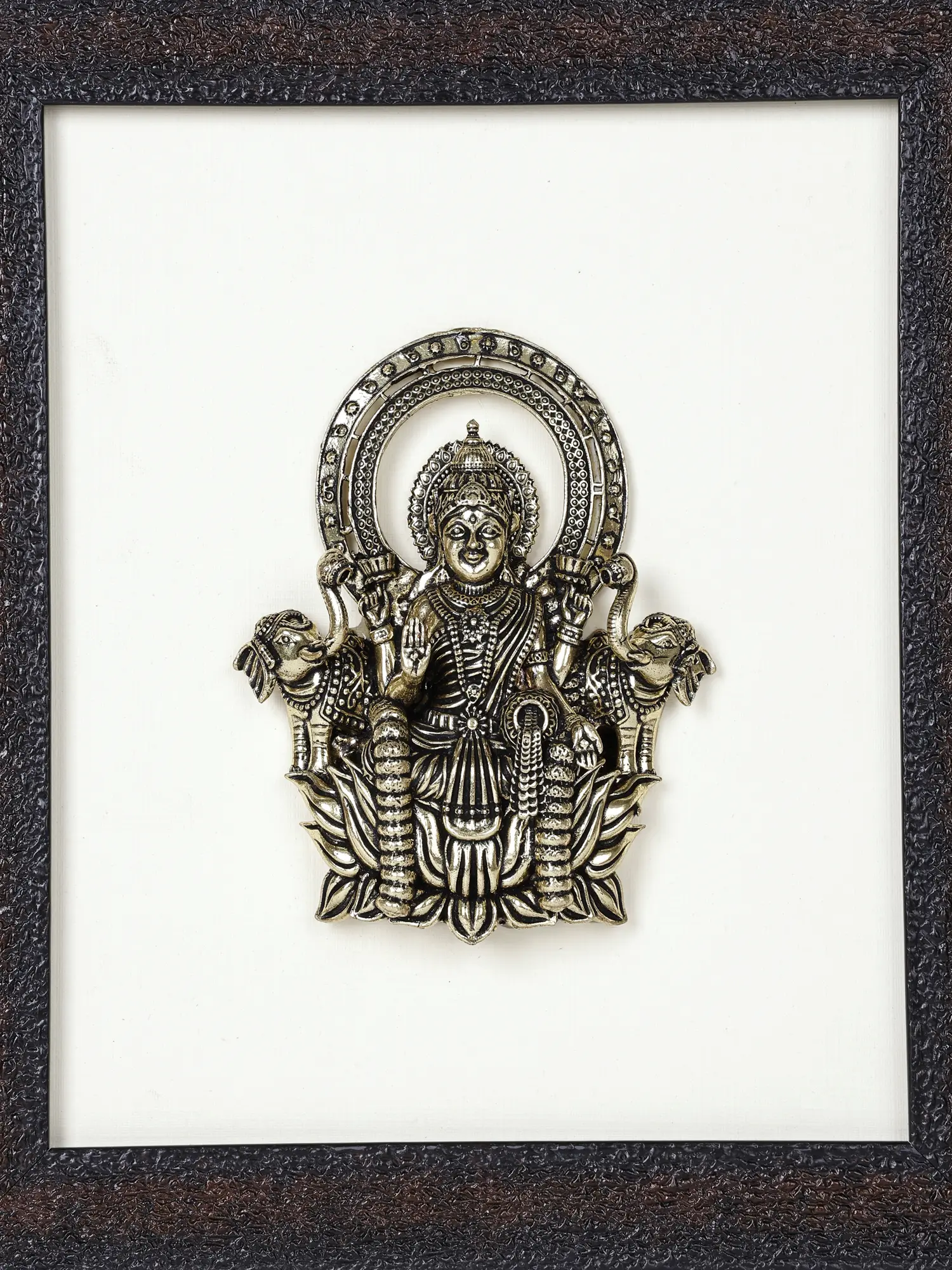 A plain white backdrop, symbolizing purity surrounds Gajalakshmi, whose divine beauty is perfectly captured by the intricately crafted icon.