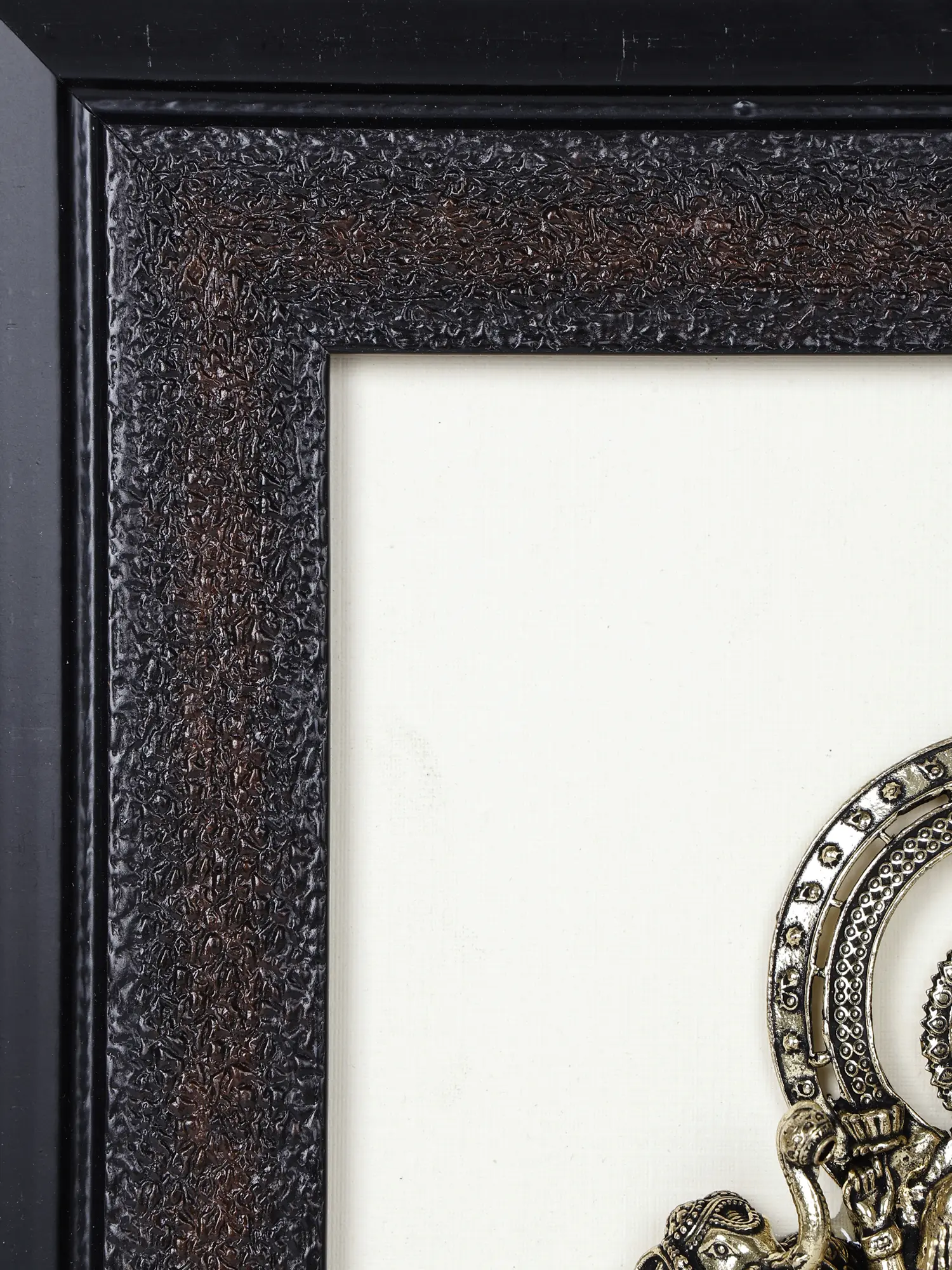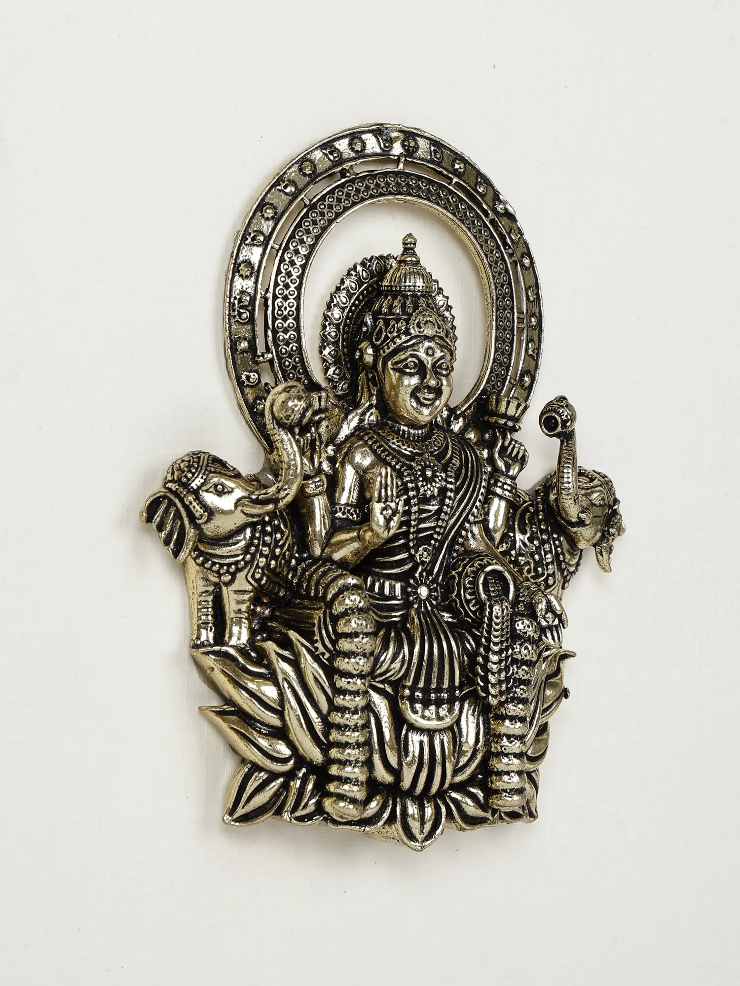 The maternal and powerful aura of the ancient form of the Hindu goddess of wealth-Gajalakshmi, is luxuriously depicted in this brass and wood wall hanging.