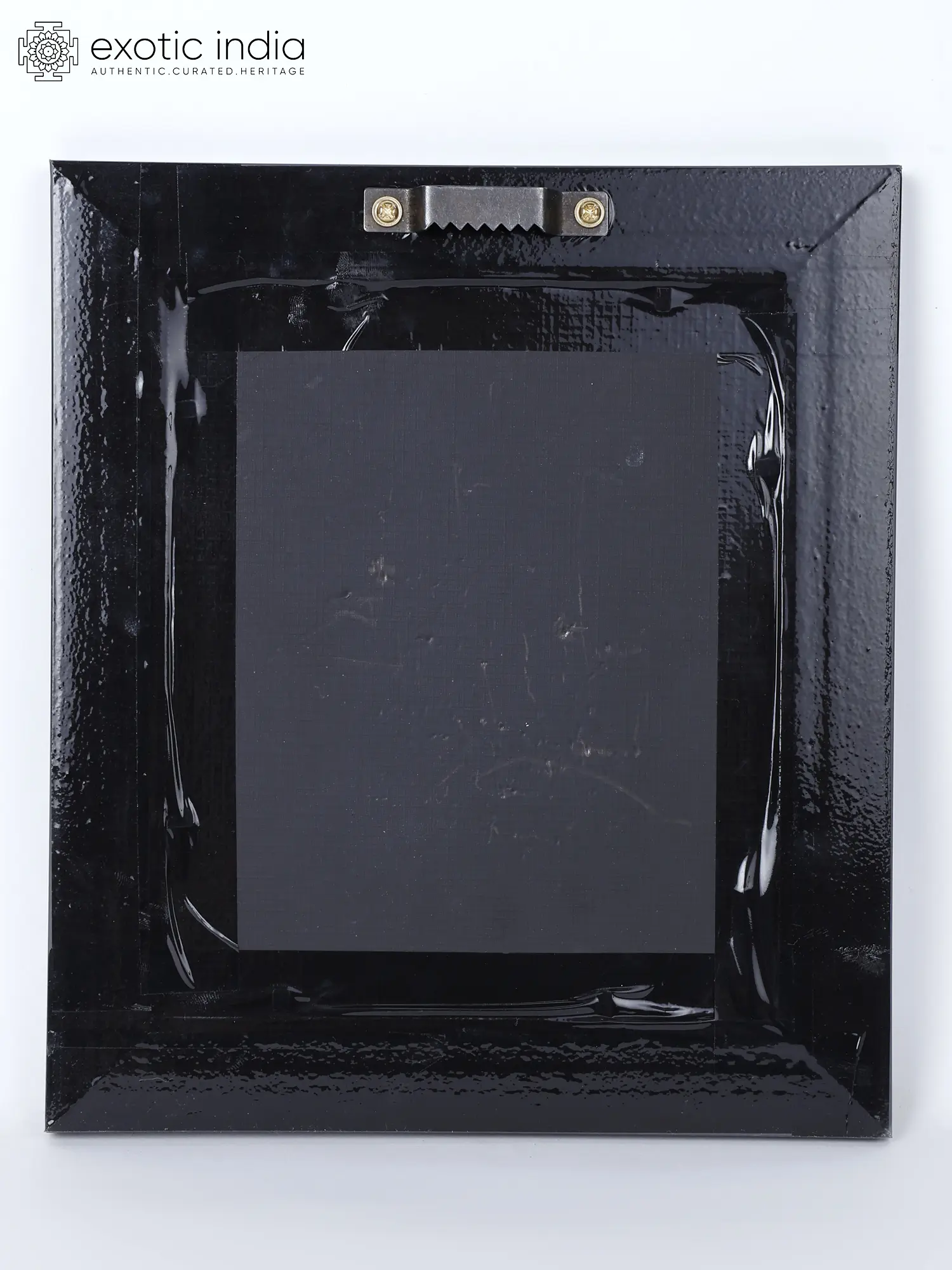 Under an aureole, adorned with crown, ornaments and floral garland, the superfine idol of Lakshmi appears to be the origin of auspiciousness in the microcosm of the wooden frame.