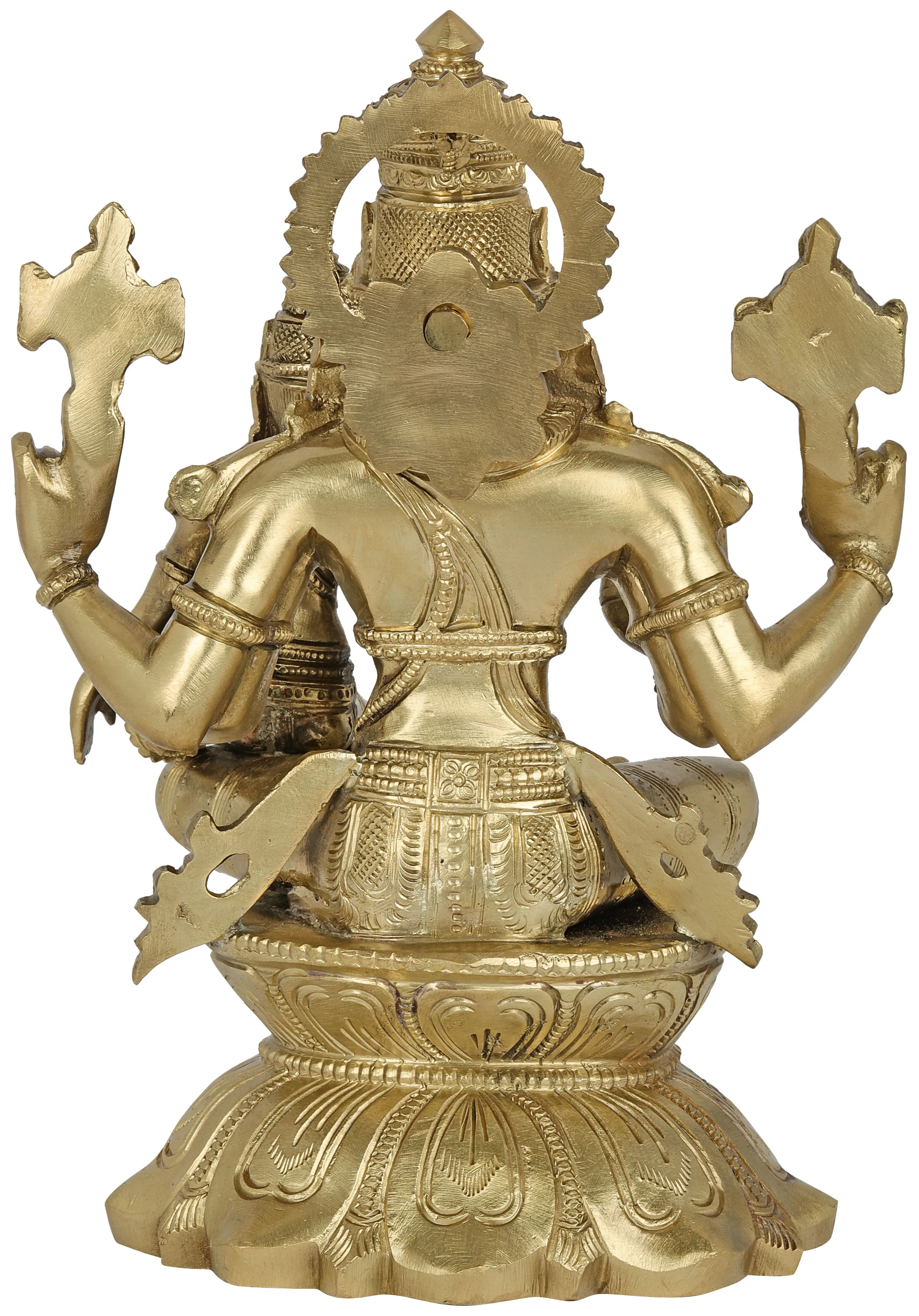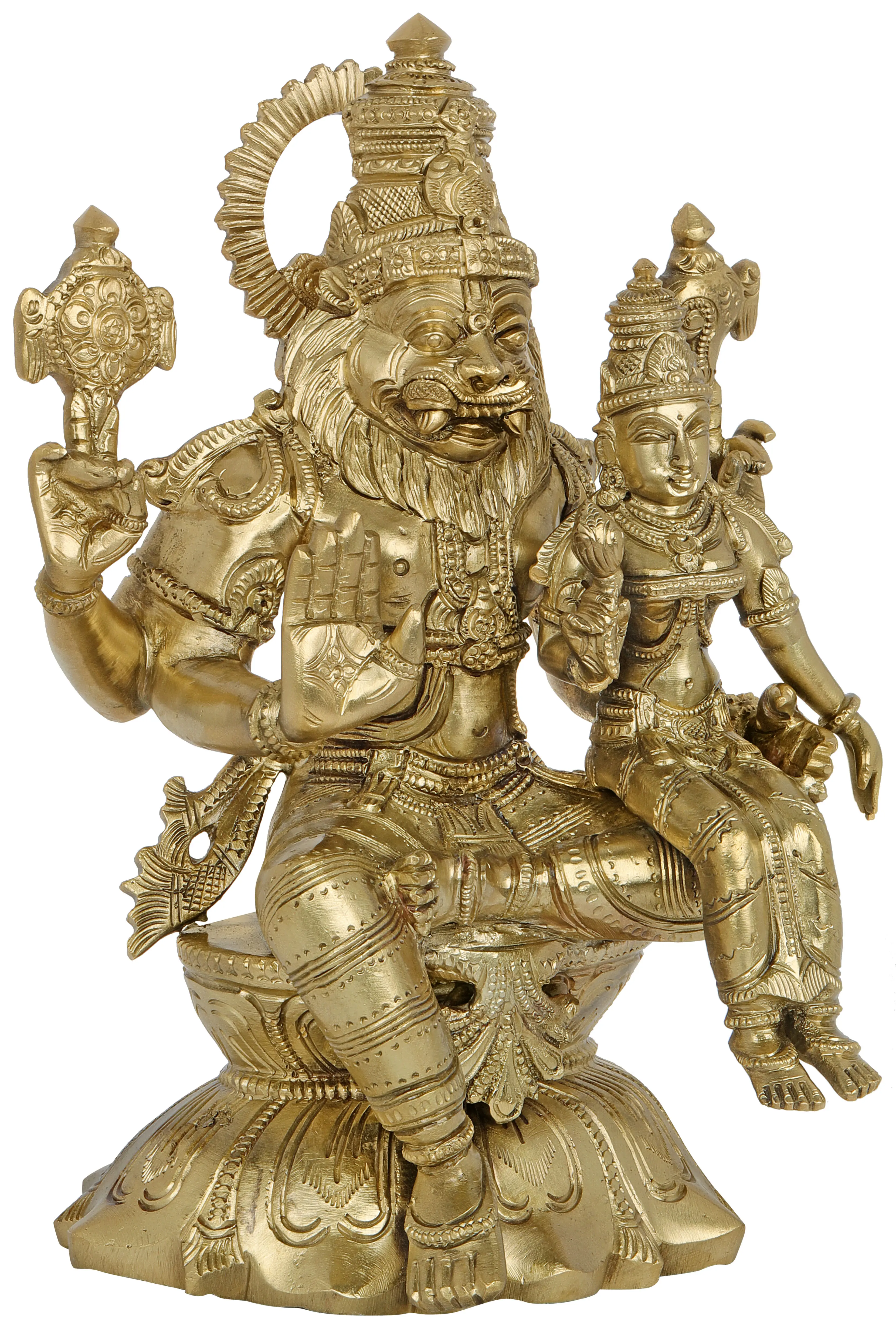 With a halo around his fierce head and Goddess Lakshmi seated on his left thigh, Lord Narasimha, the fourth incarnation of Lord Vishnu, sits atop an upturned lotus, triumphant and regal. Goddess Lakshmi, being his eternal consort, accompanies him here in the form of Narasimha. She is held by one of his lower arms while the other blooms open in a protective blessing to his devotees. His upper two arms hold a conch and a Sudarshana chakra, a sign of Lord Vishnu’s divine presence. It shows the unique and loving side of a usually ferocious Narasimha. His form is that of an anthropomorphic lion, taken shape when the asura (demon) Hiranyakashipu's scale of sins had tipped over. He had fathered a son named Prahalad, who became an ardent devotee of Lord Vishnu, praying to the lord whenever he had the chance. Hiranyakashipu was incredibly arrogant as he had been given the boon that no man, woman, animal, or weapon could destroy him, day or night. Thus, he felt as if he should be worshipped and was displeased with his son. After his repeated attempts at killing his progeny, who was saved by the Lord himself, Lord Vishnu took the form of Narasimha, half-man, and half-lion hauled Hiranyakashipu on his lap and ripped into him with his bare hands, destroying him effectively.