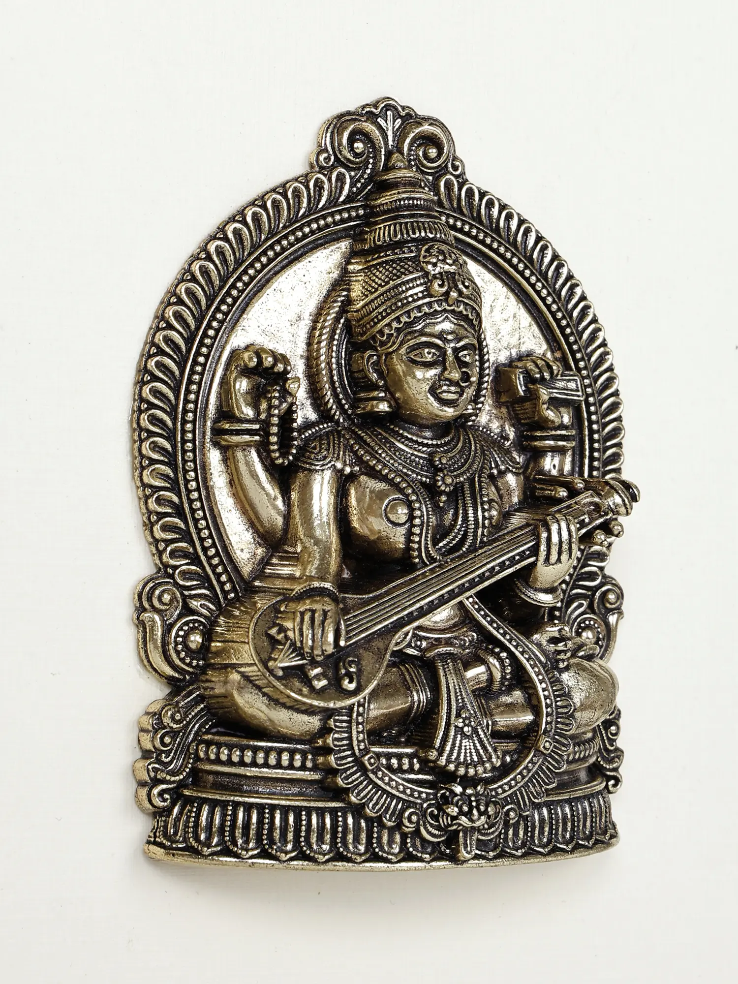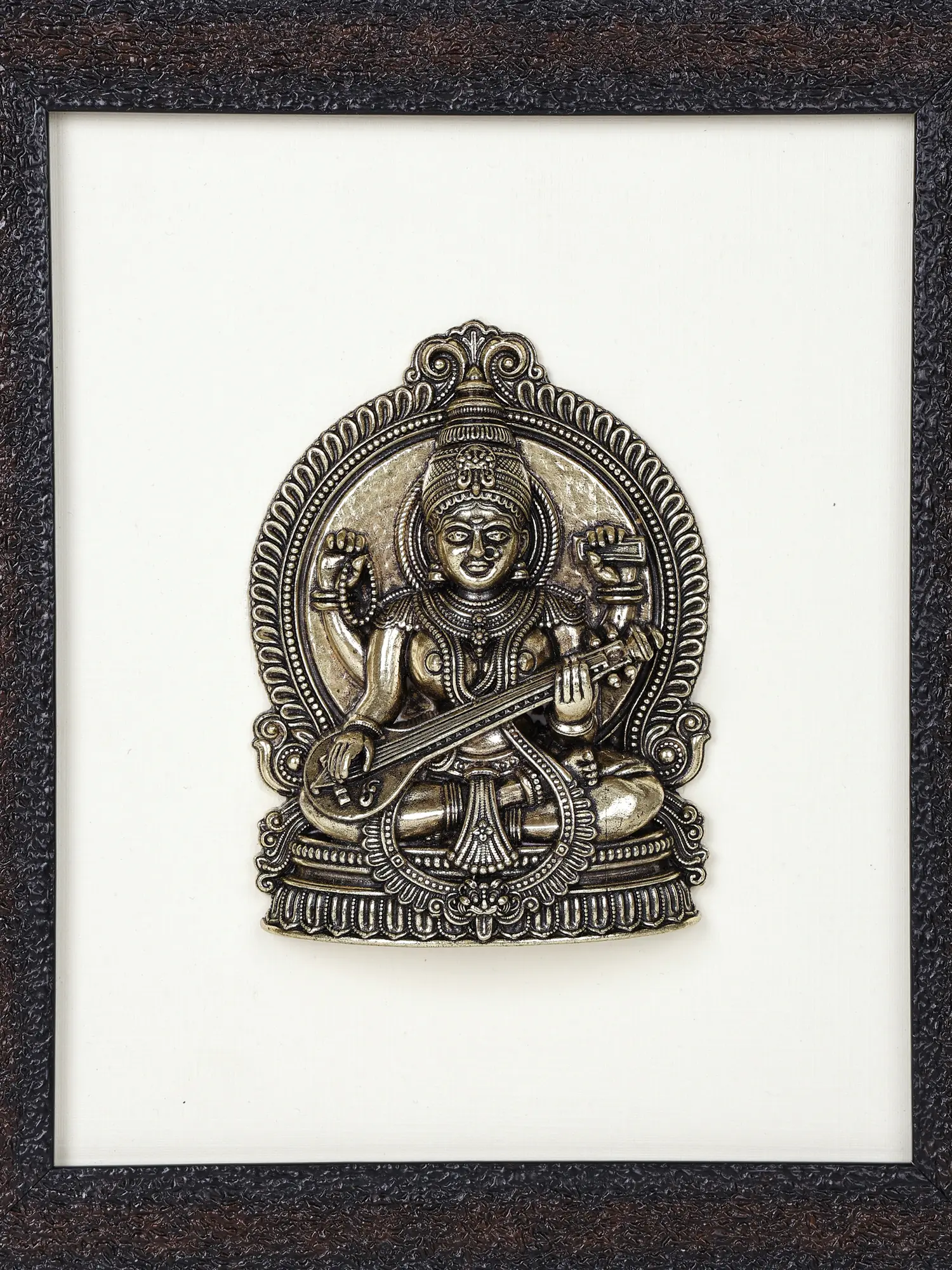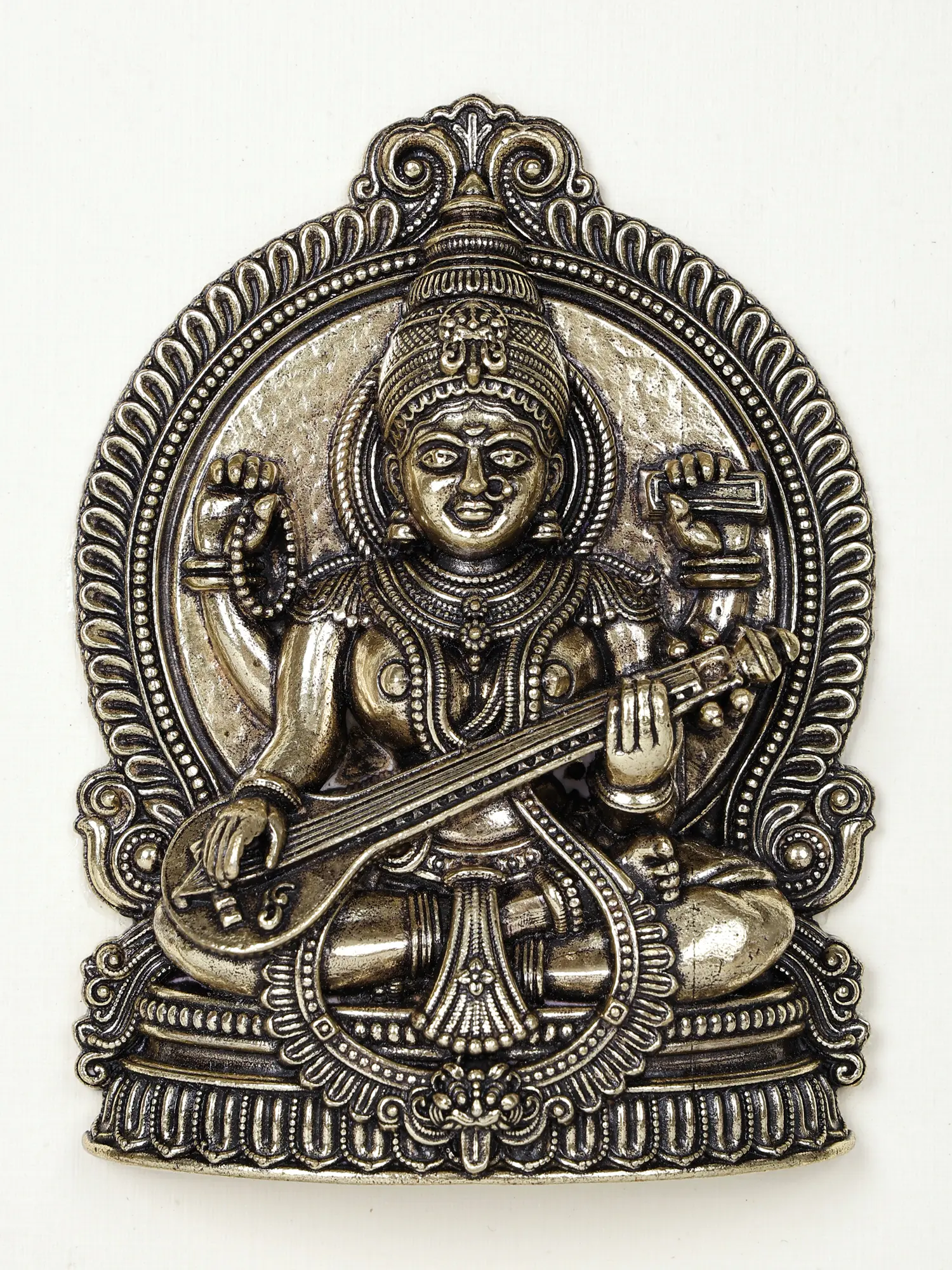 The icon of Maa Saraswati is intricately sculpted, with the finesse of the artist expressed in a beautiful aureole, exquisite lotus throne, and the divine form of Chaturbhuja Saraswati, who opens her lotus eyes, animating the wall hanging with her divine presence.