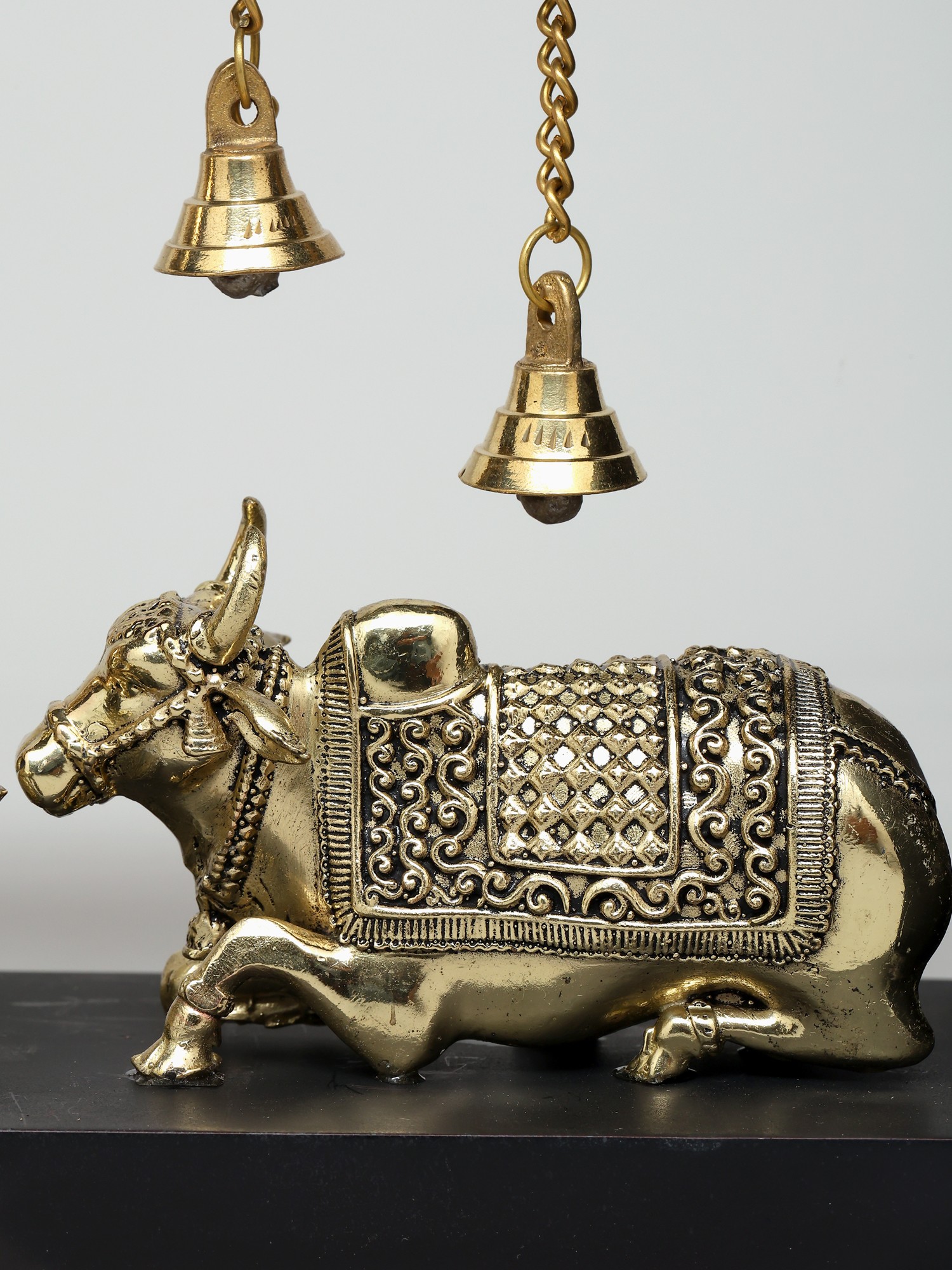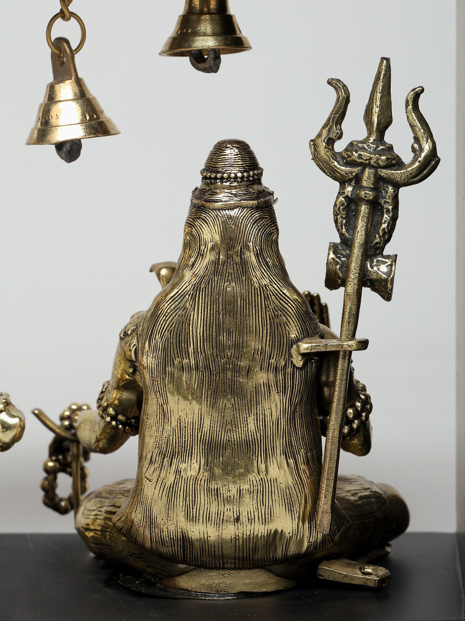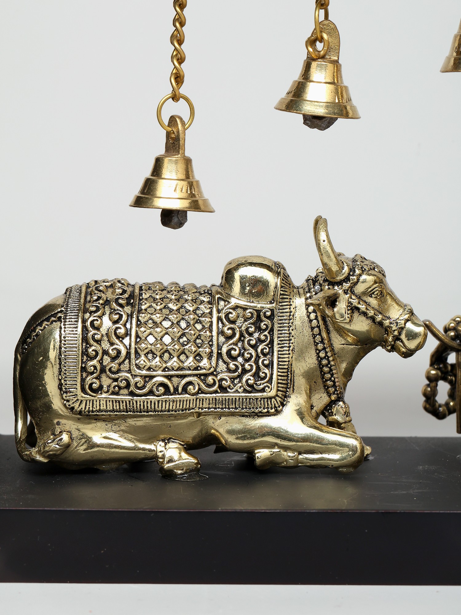Suspended gracefully above Shiva and Nandi are delicate brass bells, adding a sense of vibrancy and auspiciousness to the scene. Bells are an integral part of Hindu rituals, their ringing believed to dispel negative energies and invoke divine presence. The gentle chime of these bells evokes a sense of tranquility, creating a sacred atmosphere in any space where this piece is displayed. This handcrafted sculpture serves as a potent reminder of the eternal bond between the deity and devotee, offering a tangible representation of faith and devotion. Display this on your wall as an embodiment of protection, prosperity and spiritual growth.