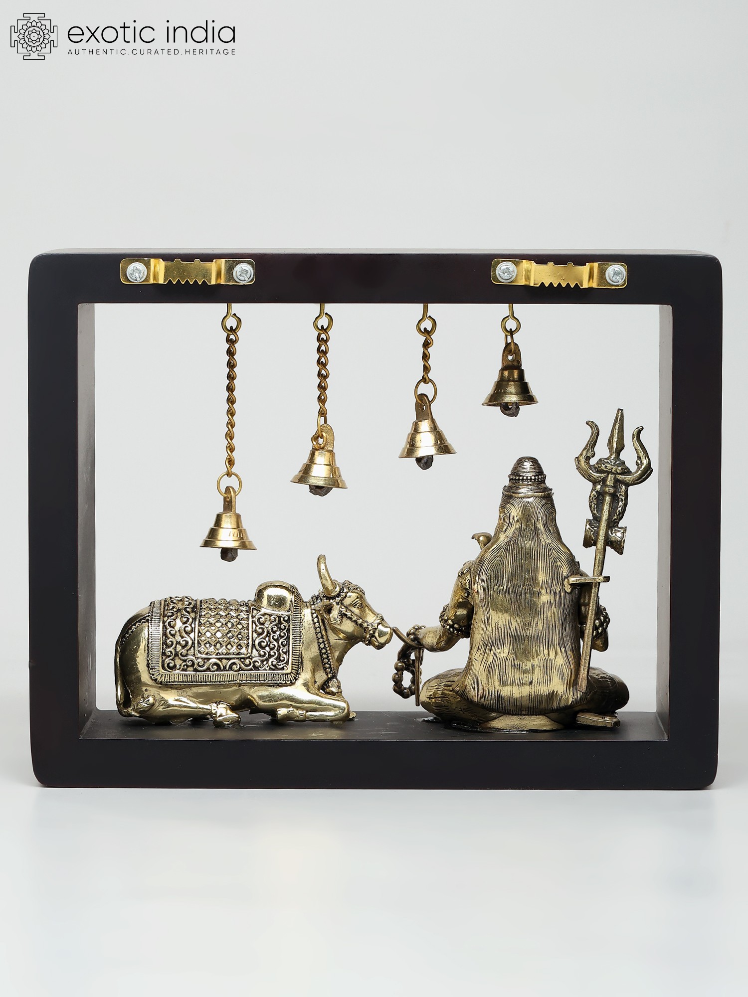 11" Superfine Standing Lord Shiva with Nandi | Wood Framed Brass Sculptures | Wall Hanging