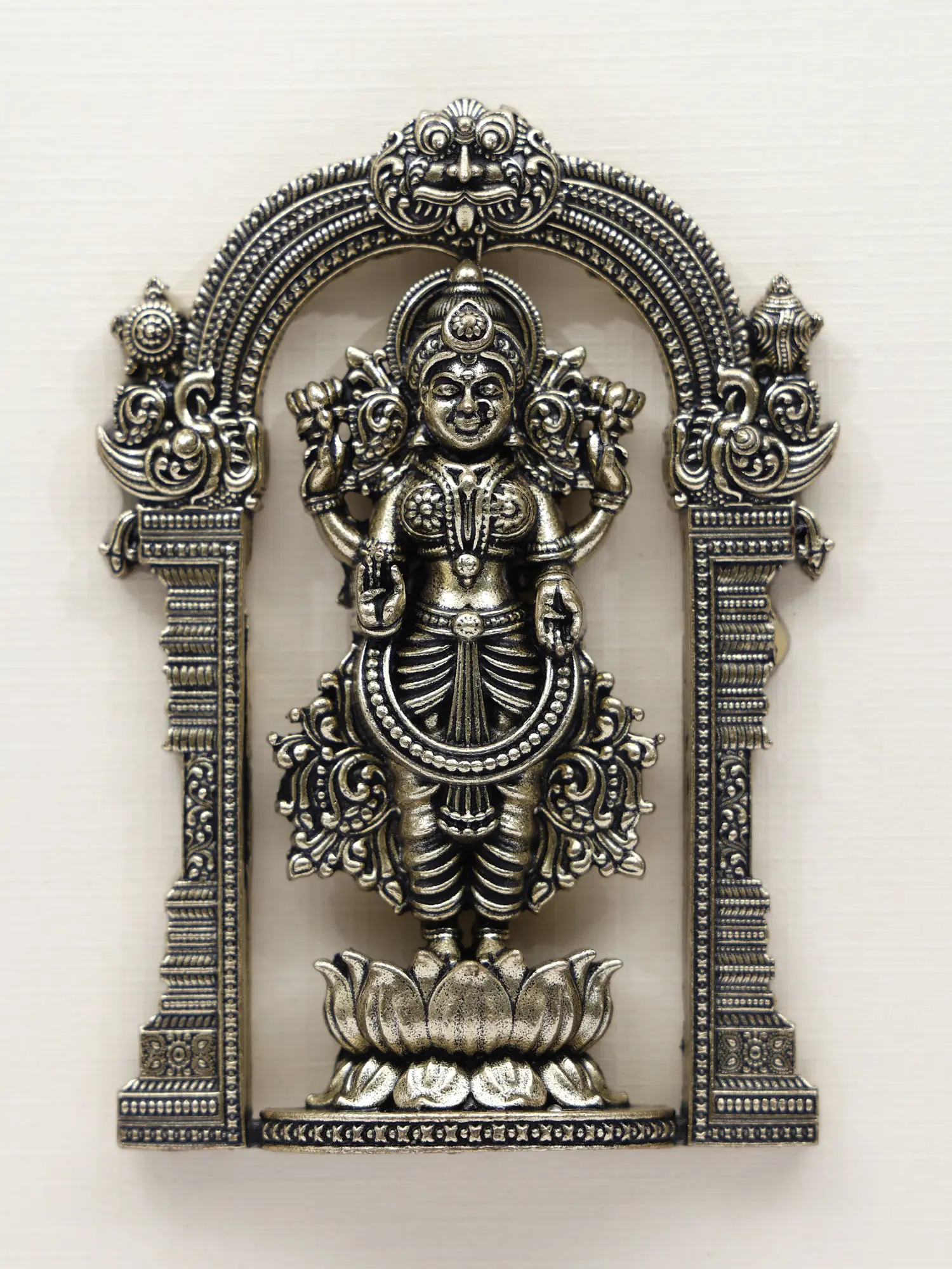An ornate Kritimukha prabhavali surrounds the icon, with the royal motif of Makara and Vaishnava Shankha and Chakra emblem on the pillars.