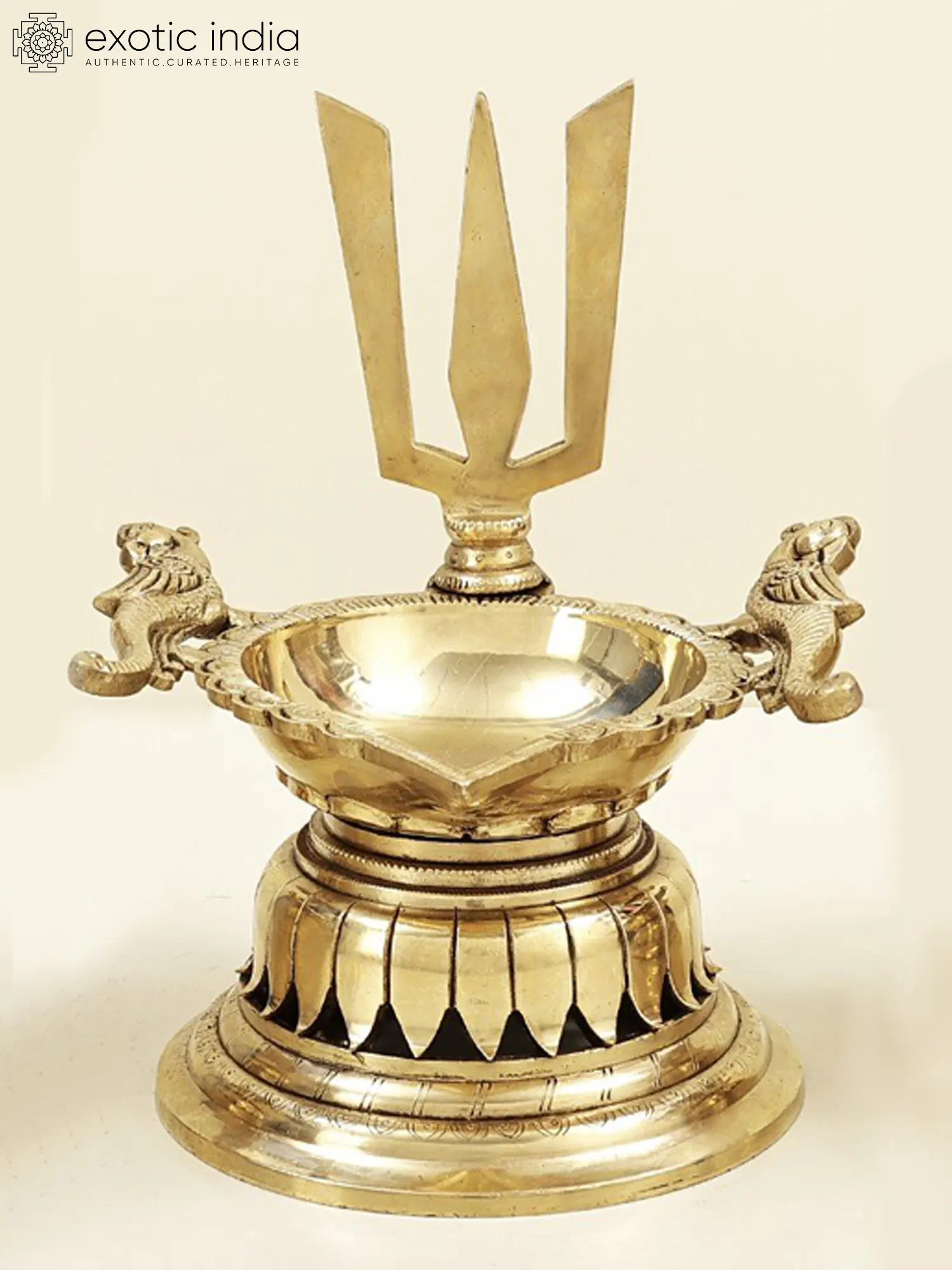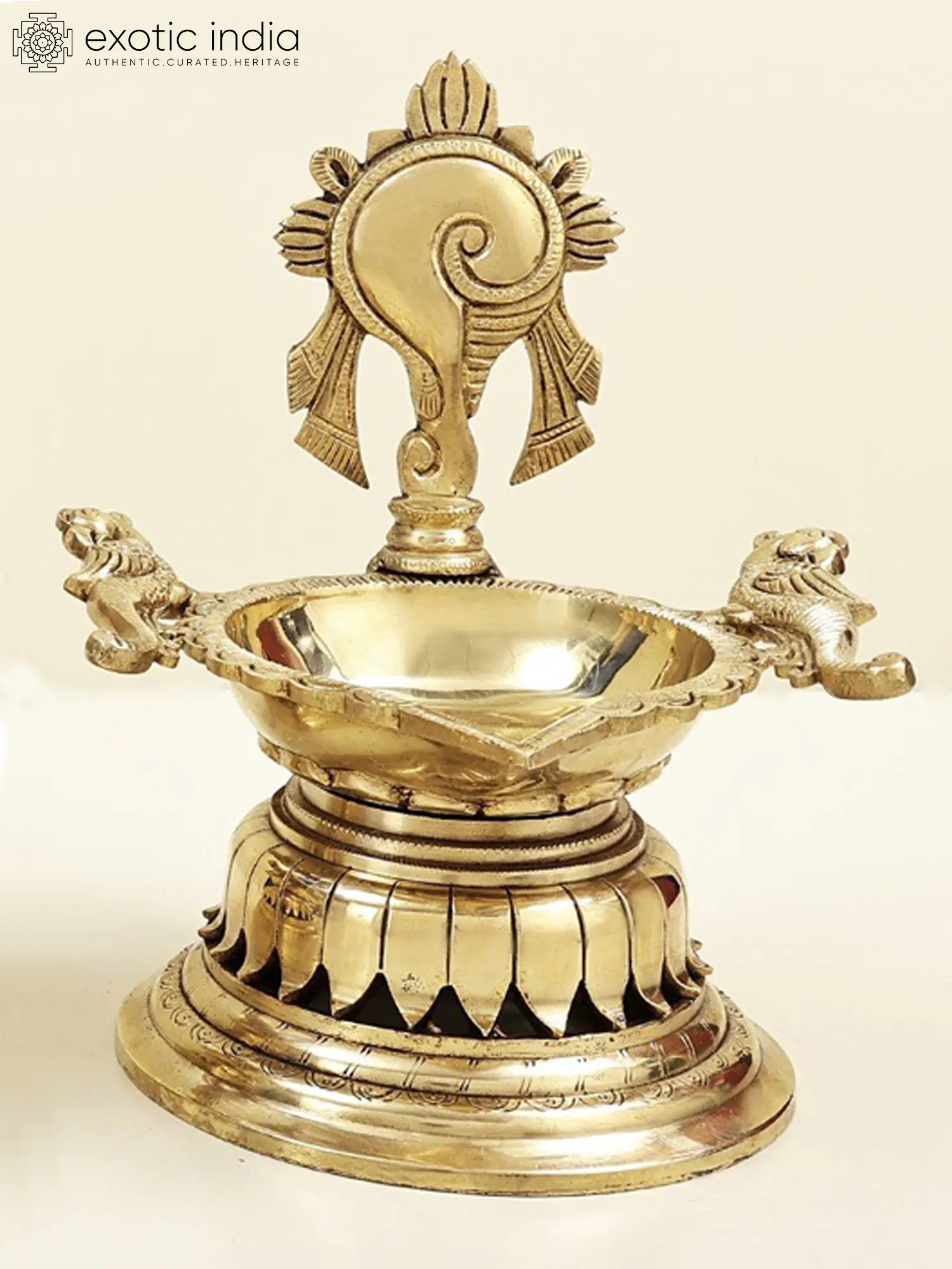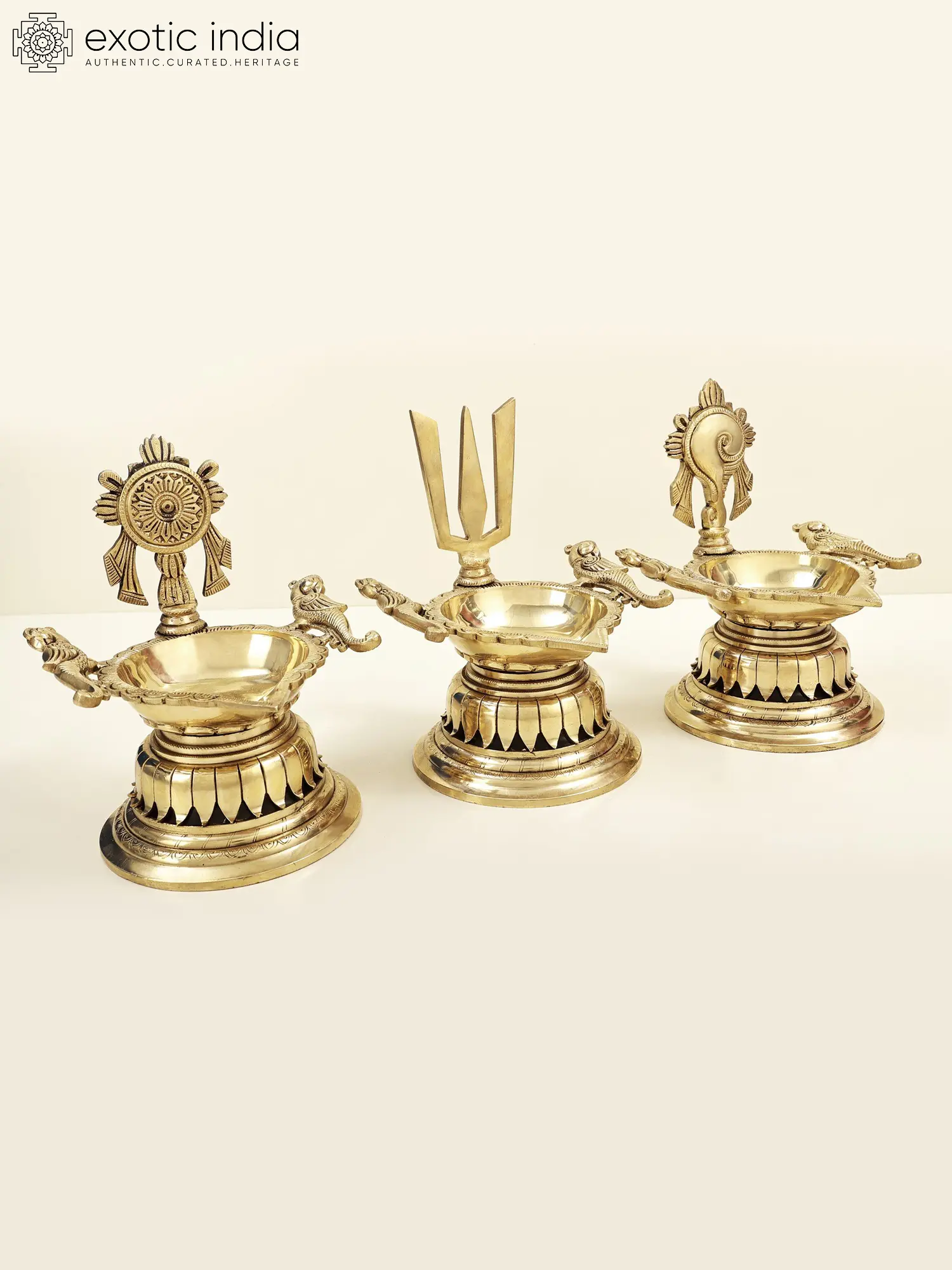 9" Superfine Vaishnava Symbols (Conch, Chakra and Tilak) Wick Lamp | Set of Three Wick Lamp | Brass Lamp | Handmade | Made In India