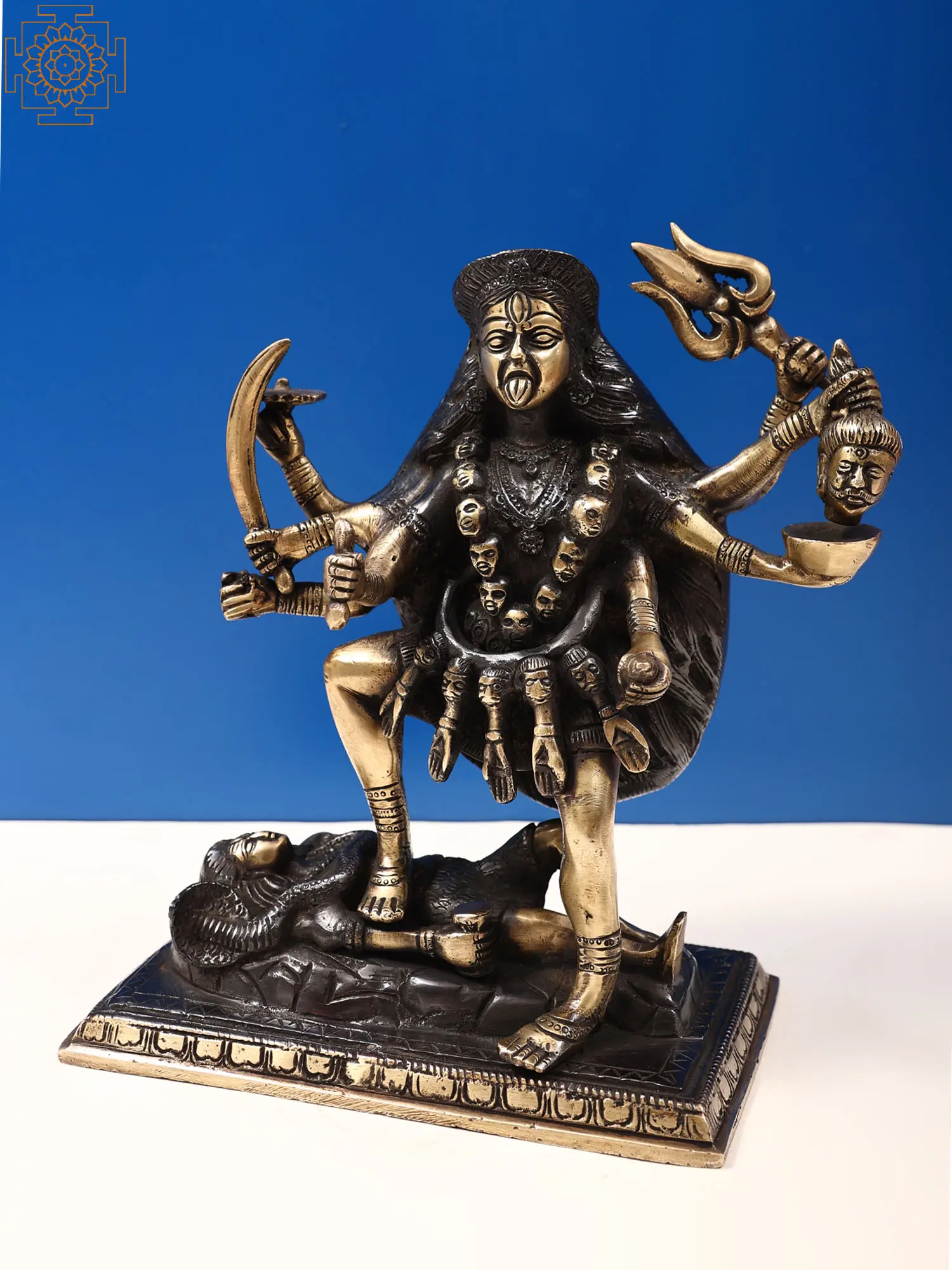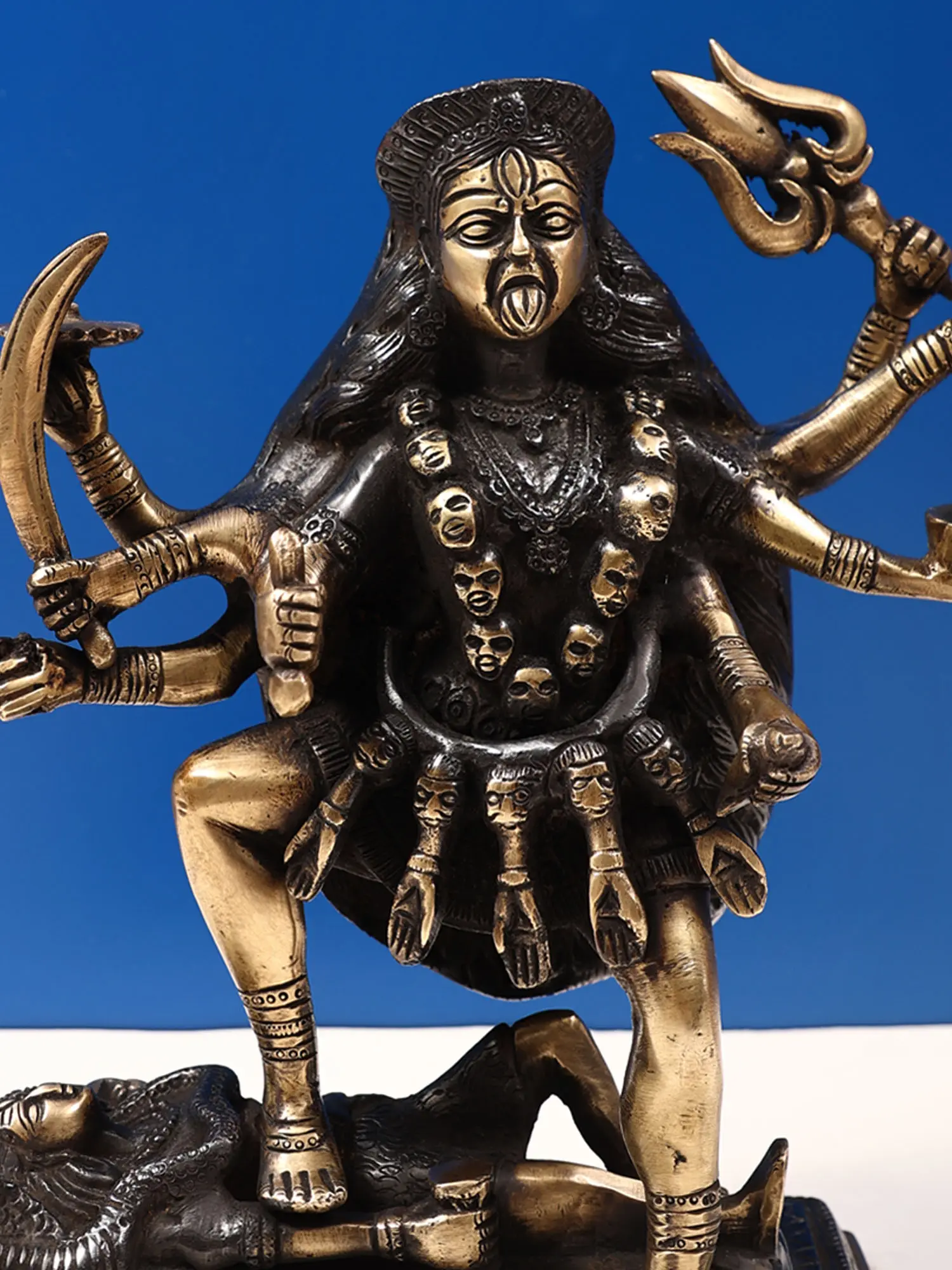 Crafted from brass, this statue possesses a timeless quality. The metal's durability ensures that this sacred representation will endure for generations, becoming a cherished heirloom or a powerful devotional object. The intricate detailing, from the delicate features of Kali's face to the fine carvings on her ornaments and the base, showcases the skill and dedication of the artisan. The warm, rich patina of the brass adds to its aesthetic appeal, making it a striking piece for any altar, meditation space, or home decor. This statue is more than just an object; it is an embodiment of divine power, a reminder of the strength found in facing and overcoming inner demons, and a beautiful representation of the untamed, liberating force of the Divine Feminine.