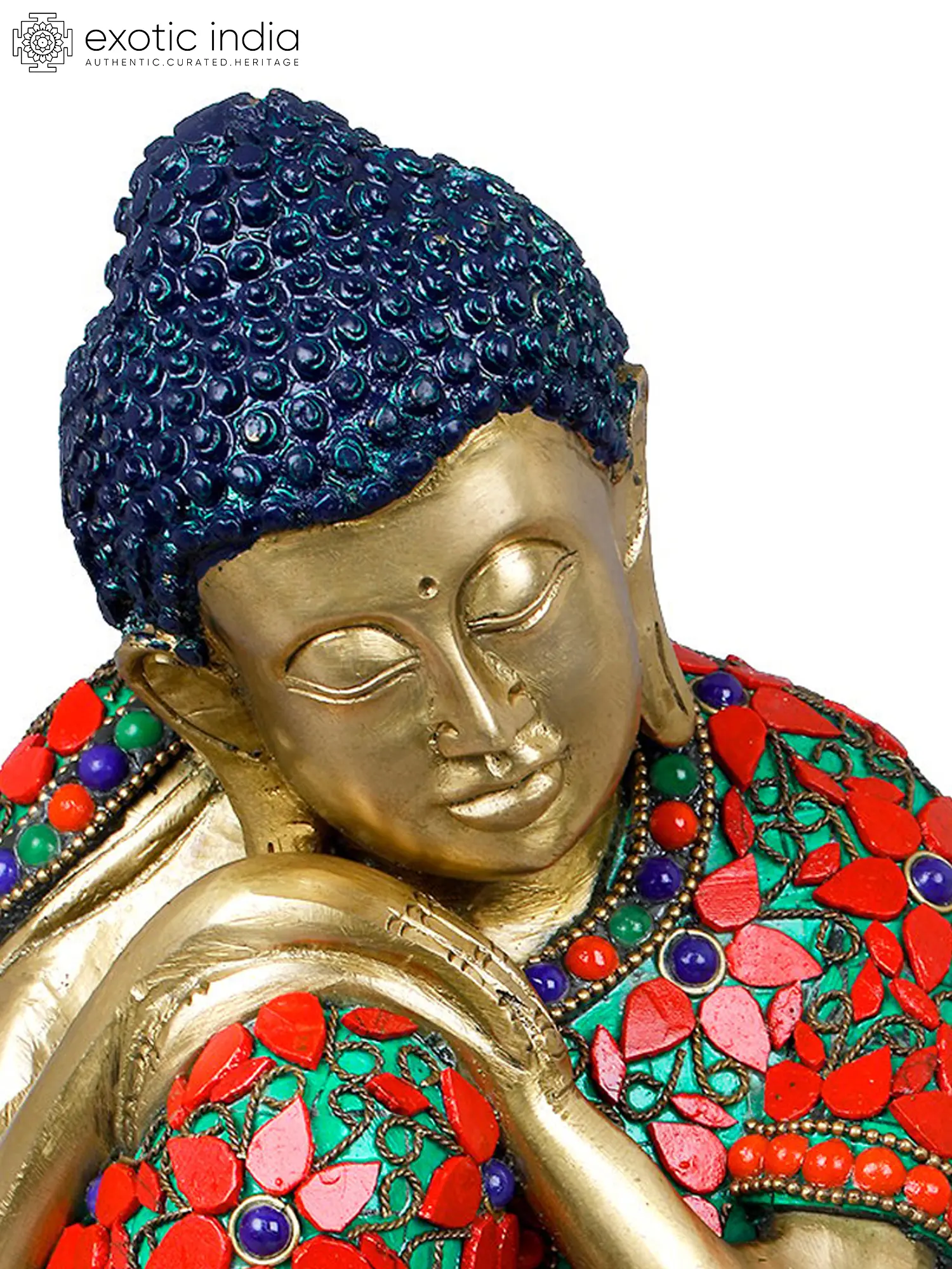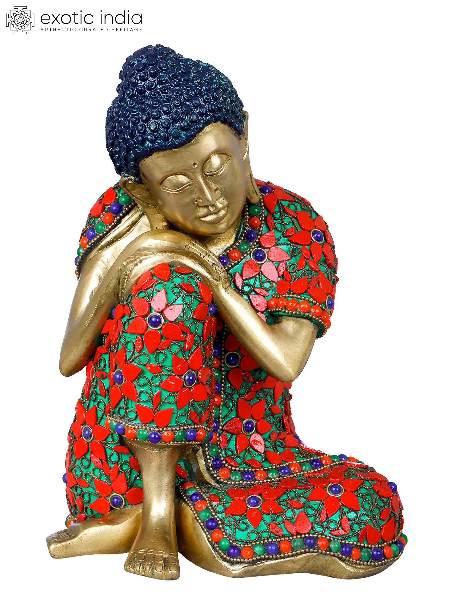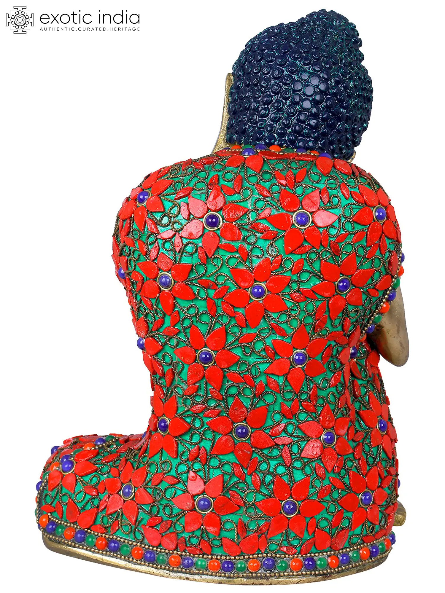 The inherent beauty of the brass is further enhanced by a breathtaking inlay of vibrant stones. The Buddha's robe is adorned with a mesmerizing pattern of red petals, reminiscent of blooming lotuses, set against a rich green background. These floral motifs, meticulously arranged, evoke the symbolism of purity and enlightenment, as the lotus flower, even when growing in muddy waters, remains unstained and beautiful. Surrounding these intricate designs are delicate beads in shades of blue, red, and green, creating a visually stunning and tactile experience. This vibrant ornamentation is not merely decorative; it is believed to represent the various facets of spiritual progress and the richness of the enlightened mind. The deep blue of the Buddha's hair, representing his wisdom and renunciation, adds a striking contrast to the golden hue of his skin, symbolizing spiritual illumination. The serene expression on his face, with eyes gently closed, invites the viewer to join in this quiet contemplation and find a sense of inner peace. This posture, often interpreted as one of deep thought or reflection on the suffering of the world and the path to its cessation, resonates with the core teachings of Buddhism.