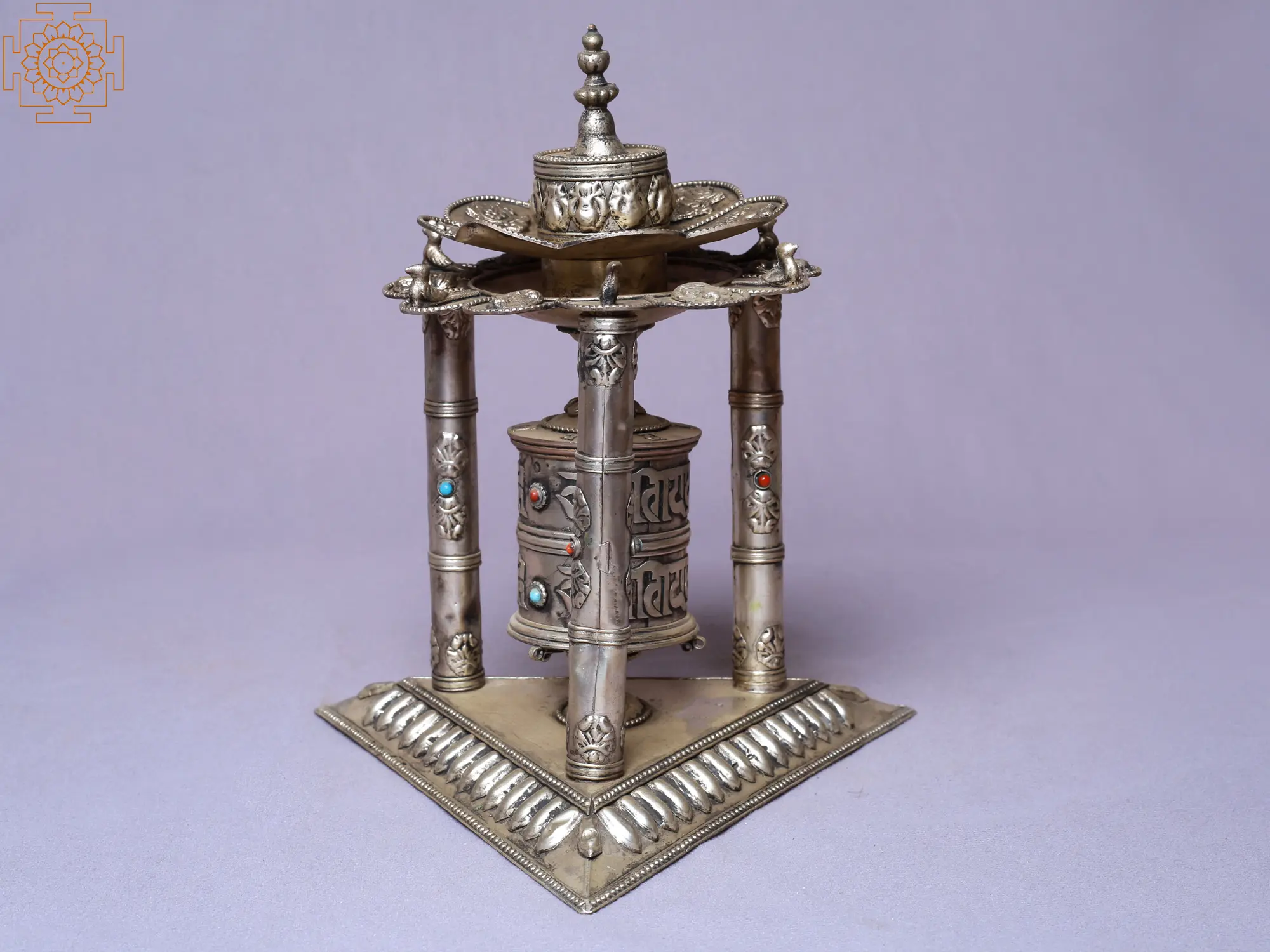 Serving a dual purpose this three-pillared copper prayer wheel is also an incense burner. The piece featuring three pillars is crafted by the highly skilled artisans of Nepal that symbolize spiritual strength and stability. On the holder of the incense, pious mantras are written, allowing practitioners to manifest their path of spirituality through prayer and incense offerings. The incense holds its symbolism, representing purification and offering in holy practices. The piece has been designed with robust copper and effortlessly showcases intricate traditional designs and embedded coral crystals, adding a touch of godliness and spiritual energy to the prayer experience.