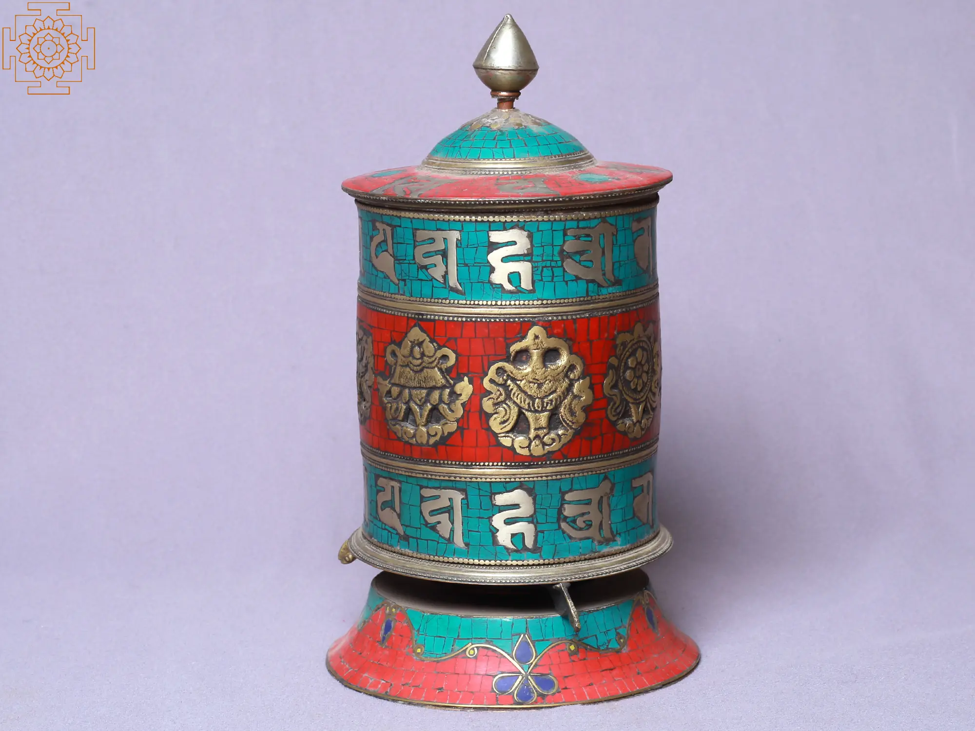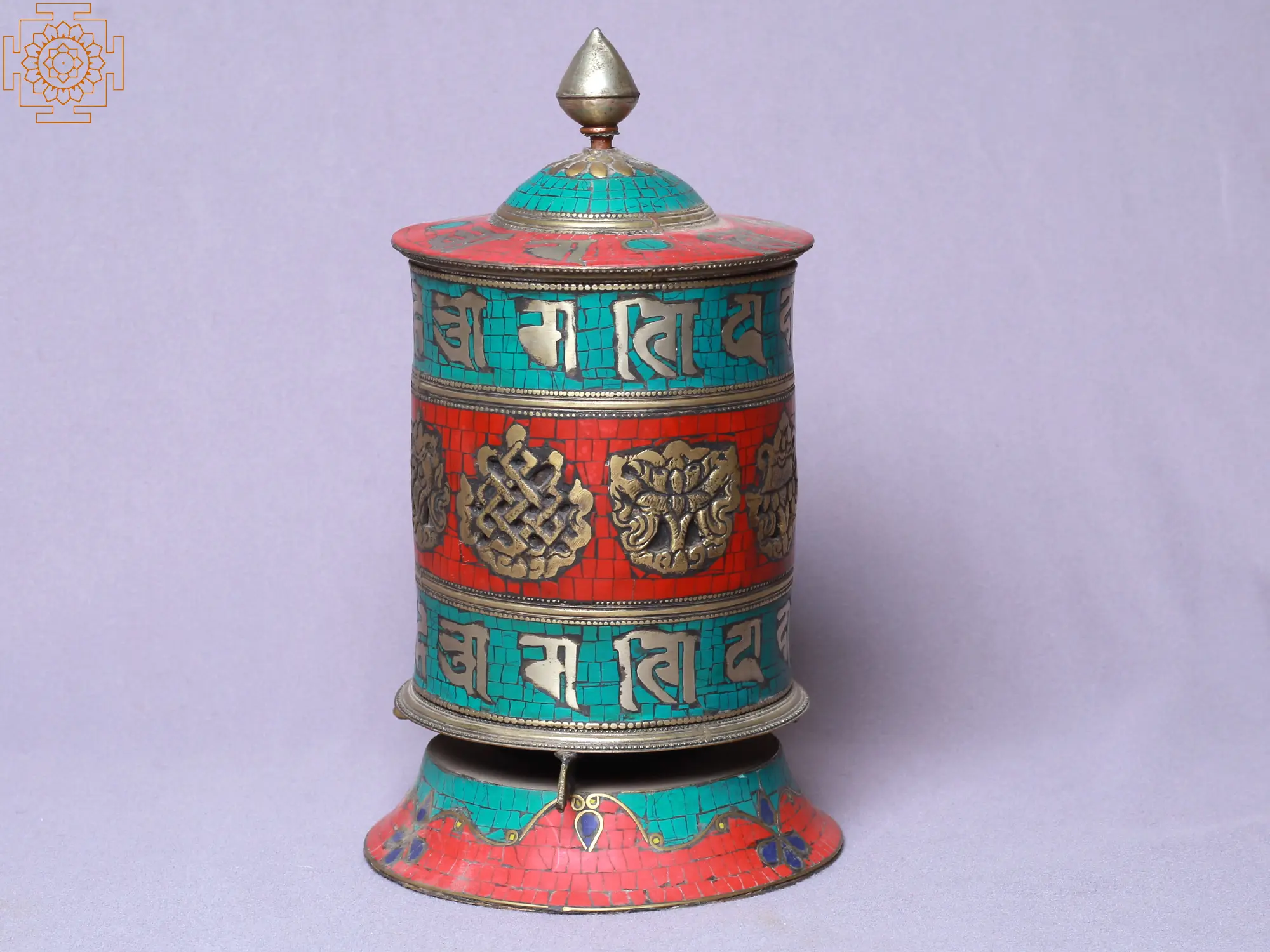 The Tibetan Buddhist Ashtamangala table prayer wheel stands as a divine portal to enlightenment in Buddhism. There are eight auspicious symbols, Srivatsa, Nandavarta, Vardhmanaka, Bhadrasana, Kalasha, Darpana, and the Pair of fish, adorning its sacred surface. Each symbol carries profound meaning: purity, sustenance, prosperity, wholeness, reflection, and abundance of life. Together, they guide the devotee on the path to liberation. As the wheel spins, these symbols dance harmoniously, imbuing the surroundings with spiritual energy and awakening the seeker's inner wisdom.