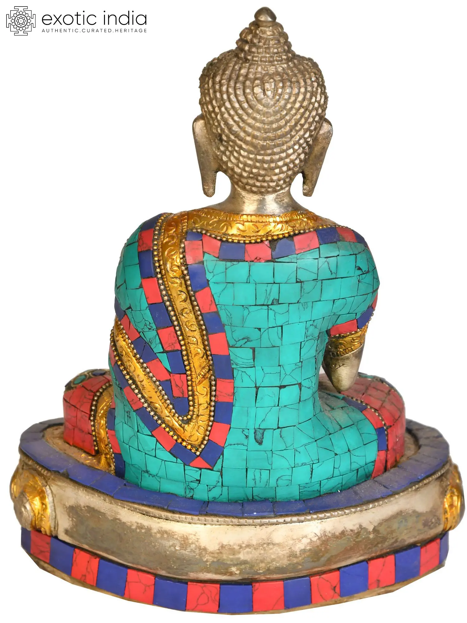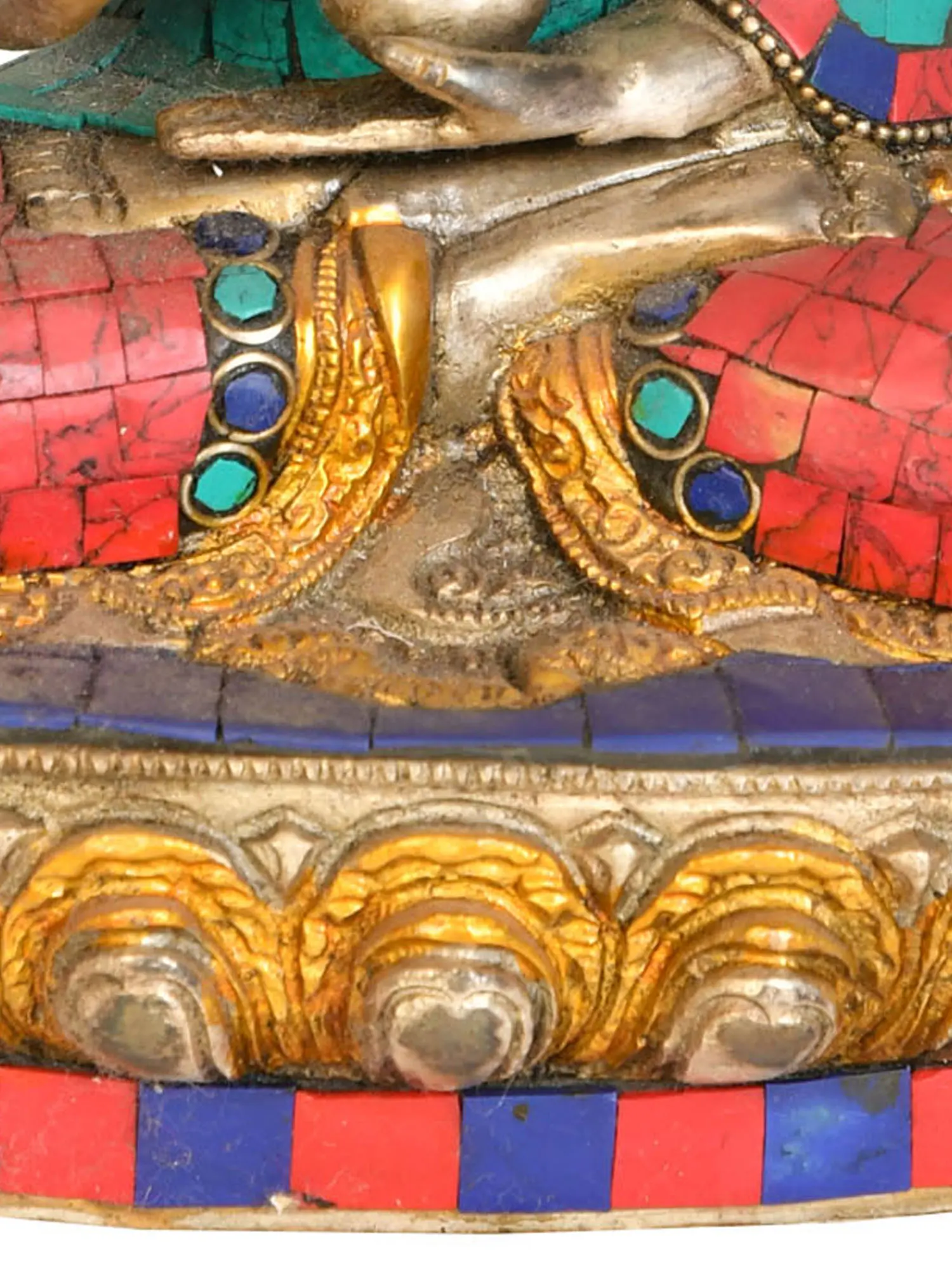 Handmade in India, this statue is a testament to the enduring artistic traditions and meticulous craftsmanship that have flourished on the subcontinent for centuries. The body of the Buddha is cast in brass, lending it a timeless quality and a satisfying weight. The intricate details of his serene face, the coiled curls of his hair, and the graceful folds of his robes are rendered with remarkable skill. What truly elevates this piece is the vibrant inlay work adorning his robes and the throne. Dazzling pieces of red coral, turquoise, and lapis lazuli are precisely set into the brass, creating a stunning mosaic of color that reflects the opulence and spiritual fervor often associated with Tibetan Buddhist art. These gemstones themselves carry symbolic weight; coral is often linked to protection and vitality, turquoise to wisdom and healing, and lapis lazuli to inner truth and communication, all aligning with the essence of the Vitark Mudra.
