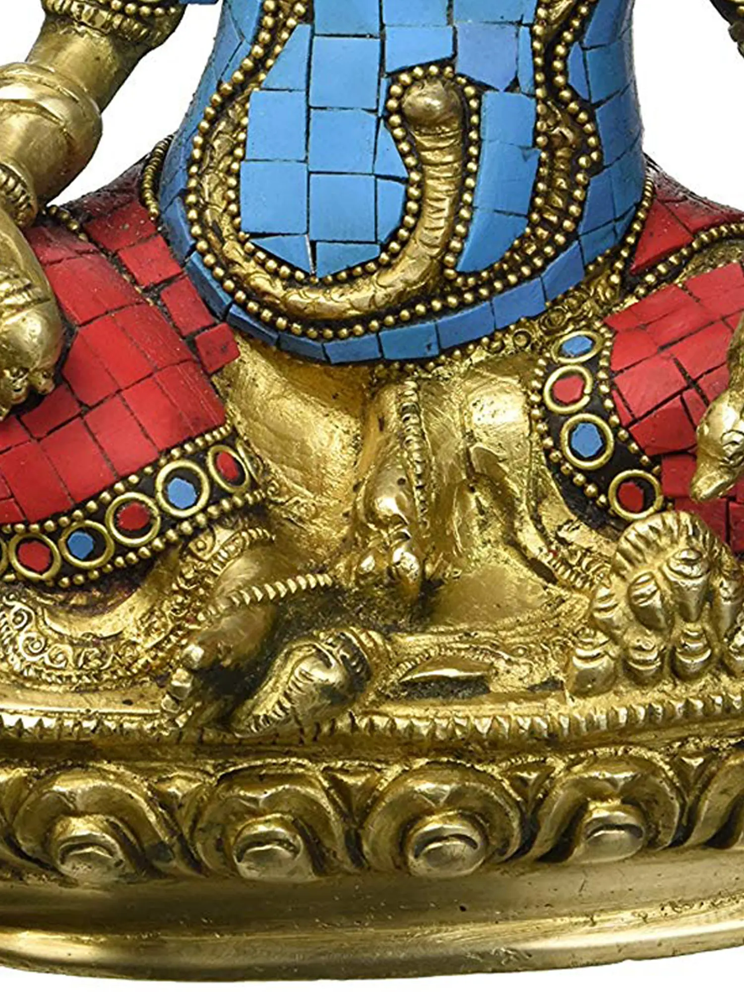 Handmade in India, this brass statue showcases the remarkable artistry and dedication of traditional artisans. The lustrous brass, a material associated with auspiciousness and purity, is meticulously shaped and detailed to bring Kubera to life. The deity is adorned in vibrant blue and red inlaid work, possibly representing precious stones like lapis lazuli and coral, further enhancing the richness and opulence of the figure. Intricate carving defines his ornate headdress, flowing robes, and the serene yet powerful expression on his face. His posture, with one hand often depicted holding a mongoose that spouts jewels, is a common iconography that signifies his role as the dispenser of wealth.