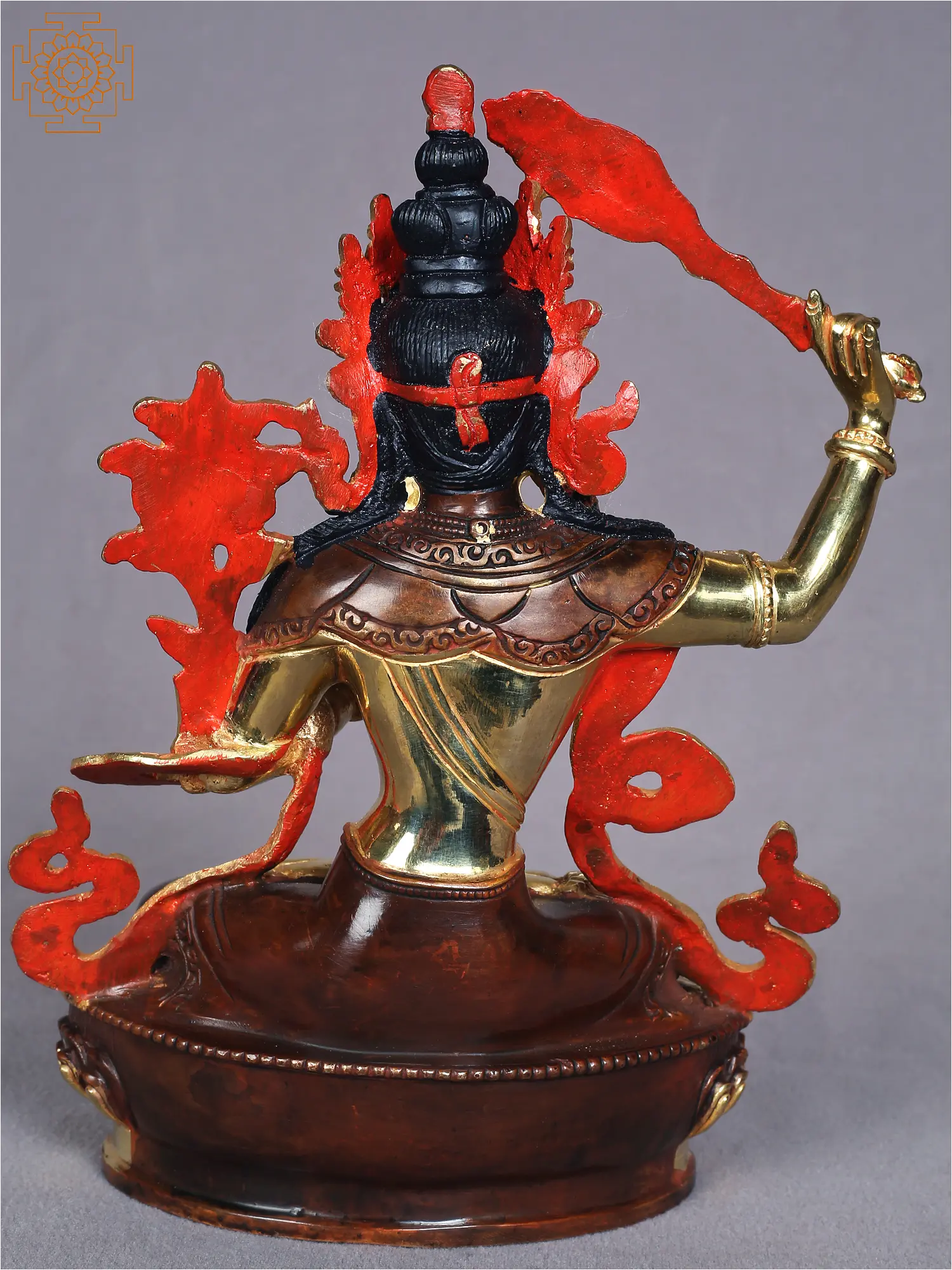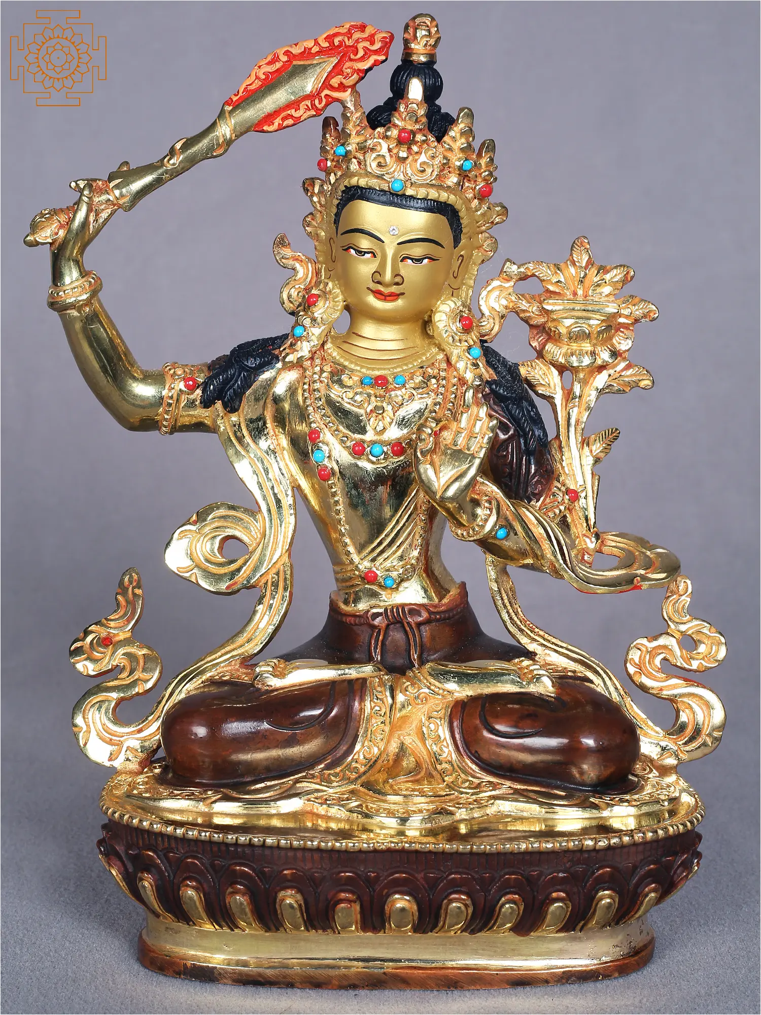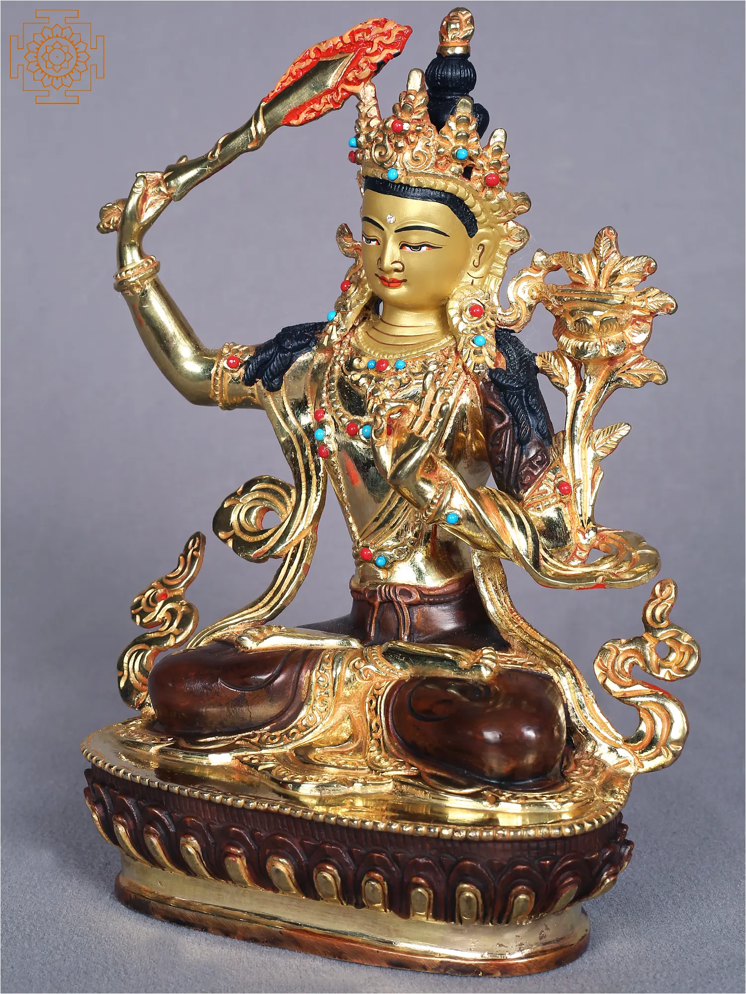In Mahayana Buddhism, Manjushri is honored as the Bodhisattva. Manjushri, the personification of enlightened wisdom, is shown with a blazing sword that slices through ignorance and a text that signifies transcendental knowledge. Manjushri is shown as a young, graceful figure sitting on a lotus throne, dressed in royal regalia. He exemplifies a wisdom that is beyond ordinary comprehension, highlighting the significance of discernment and insight on the spiritual path.