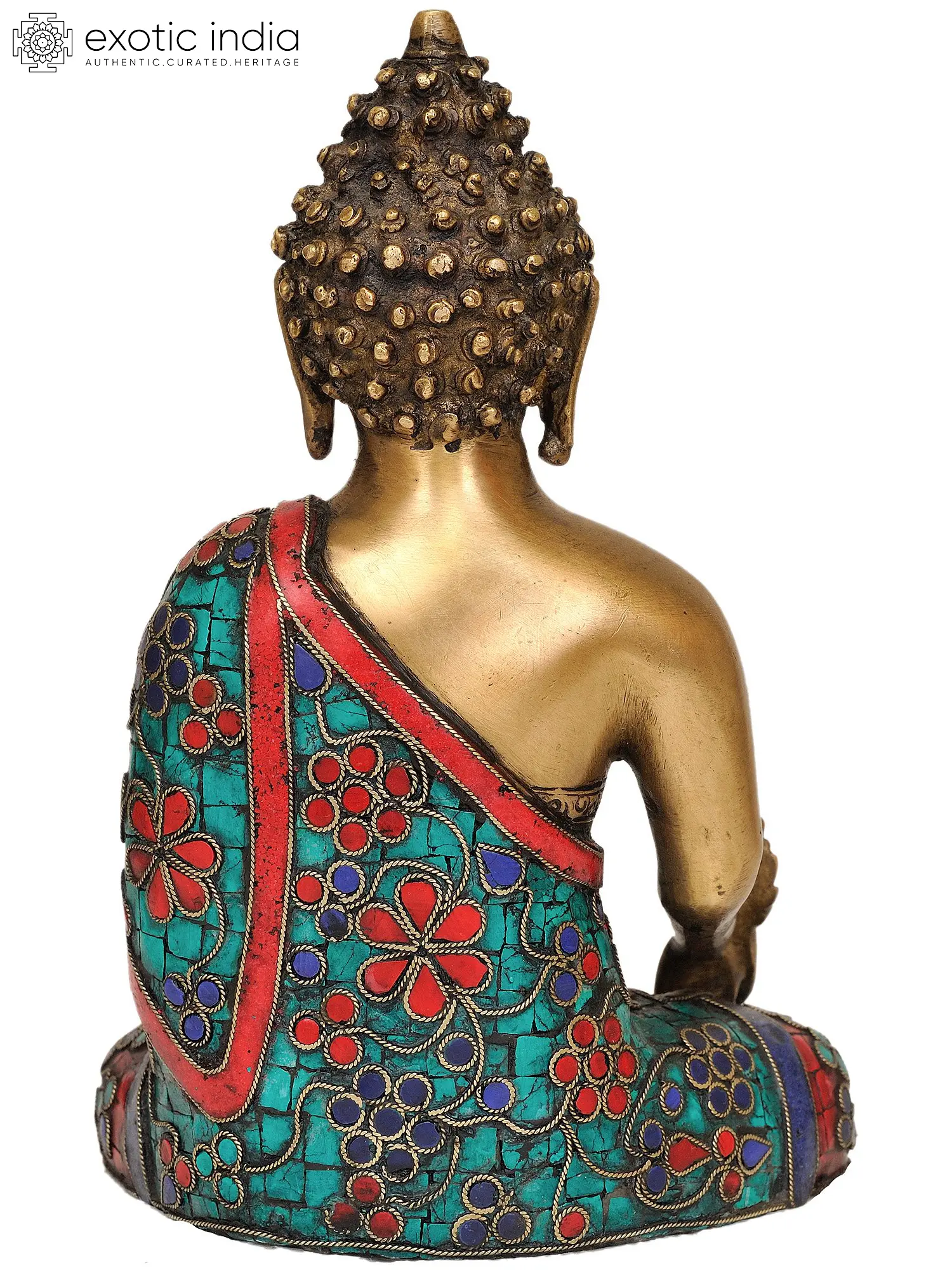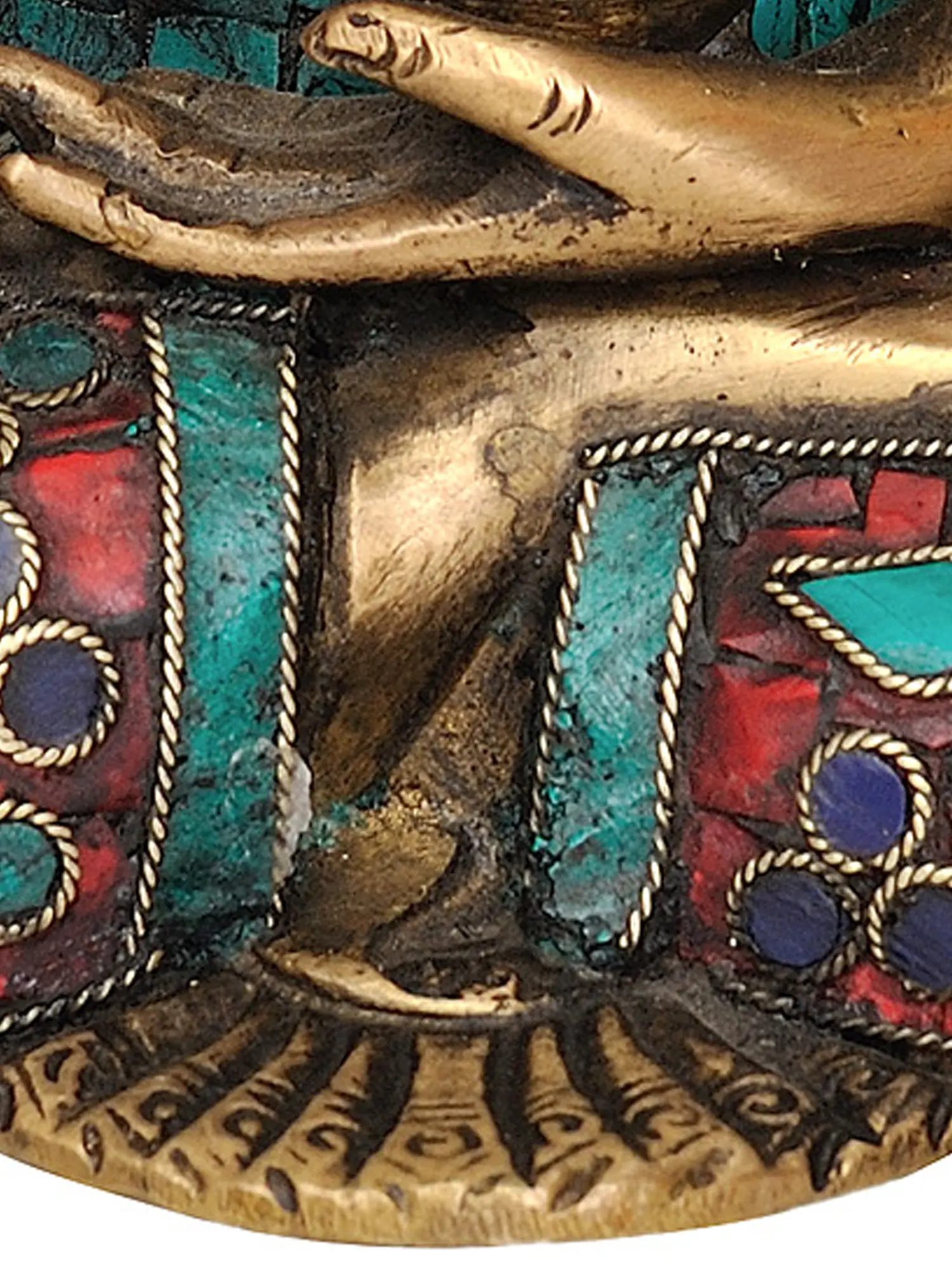 , the gesture of bestowing boons and granting wishes. This mudra signifies his compassionate nature and his readiness to alleviate suffering. The striking turquoise and coral inlay work that adorns his monastic robe adds a vibrant dimension to the statue, representing the precious gems and the diverse elements of nature from which healing properties are derived. The intricate patterns of these inlays further enhance the spiritual aura of the deity, drawing the viewer into a meditative state.