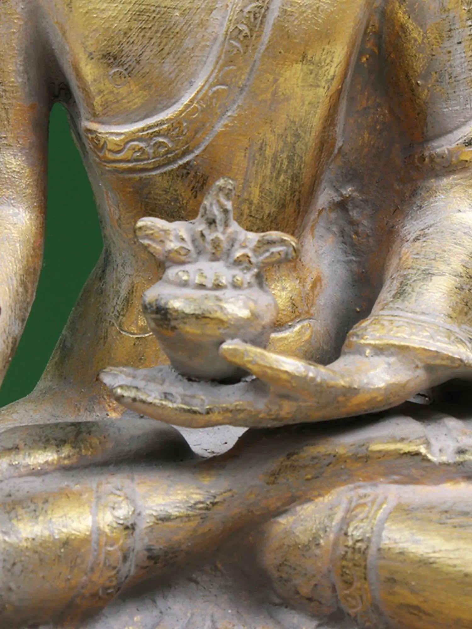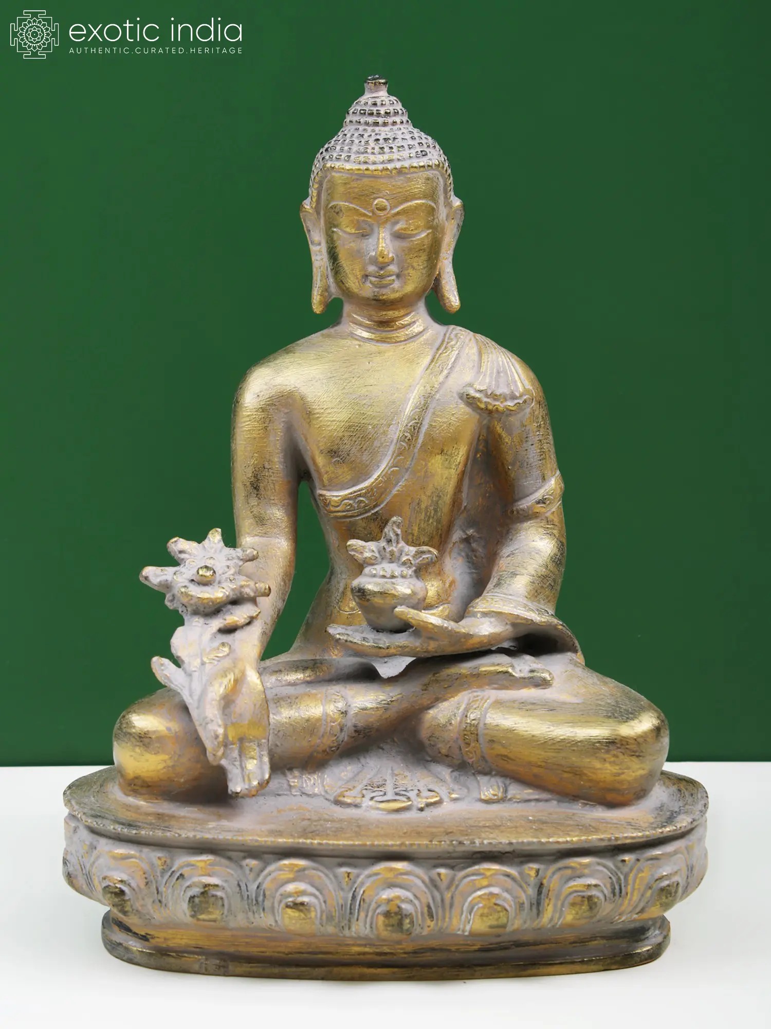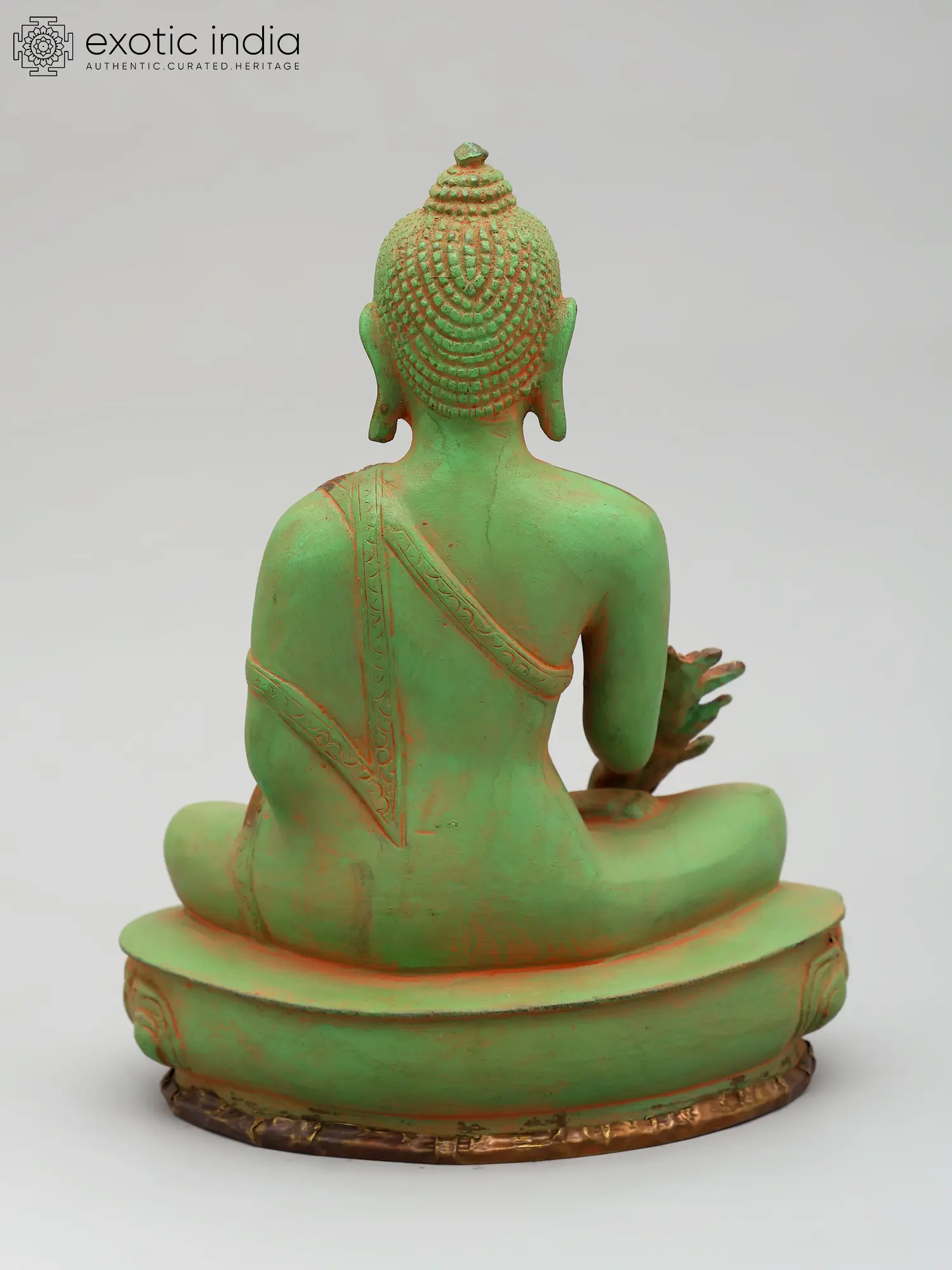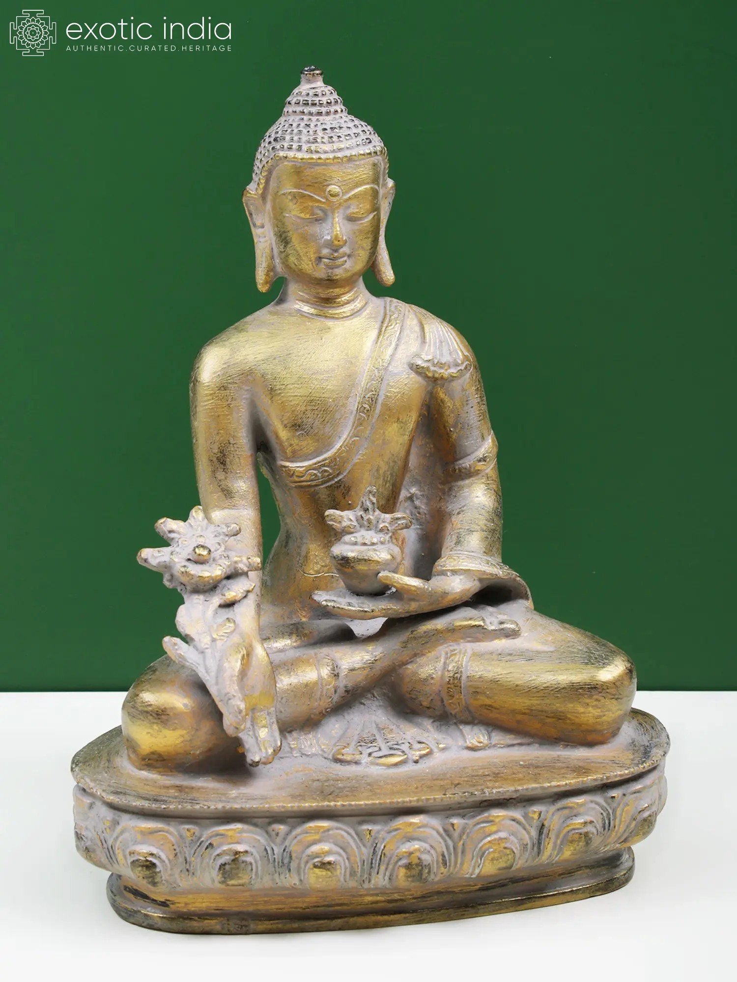 Find solace and healing energy with this handmade Brass Tibetan Buddhist Deity Medicine Buddha. This sacred statue, crafted in India, represents the compassionate and healing aspect of Buddhism. In Tibetan Buddhism, the Medicine Buddha is revered for his ability to heal physical and spiritual ailments. His serene expression and the aura of tranquility he exudes embody the belief in the interconnectedness of the mind, body, and spirit. The intricate craftsmanship on this brass idol reflects the beauty of the Buddhist philosophy of inner peace. Having the Medicine Buddha in your home encourages the path to holistic well-being and reminds you of the healing power within us all.