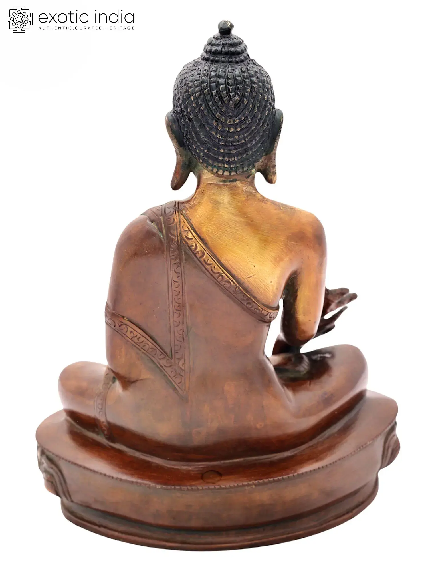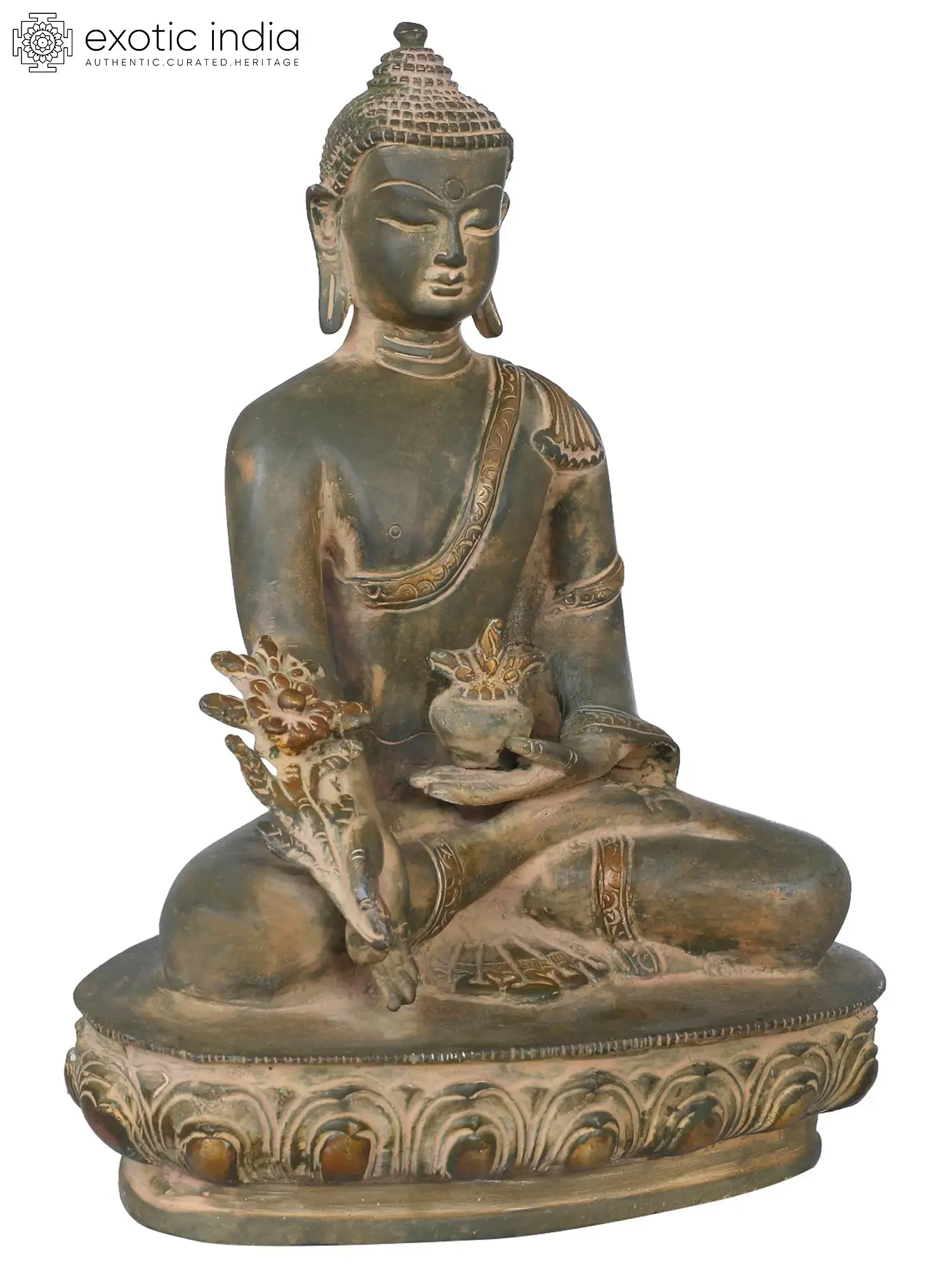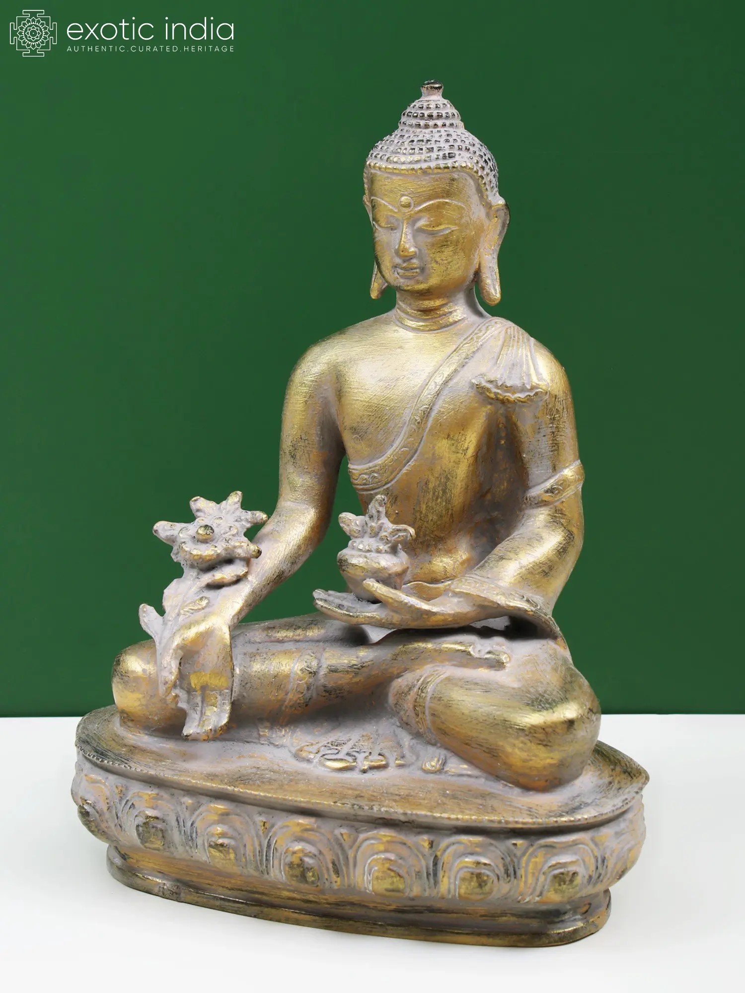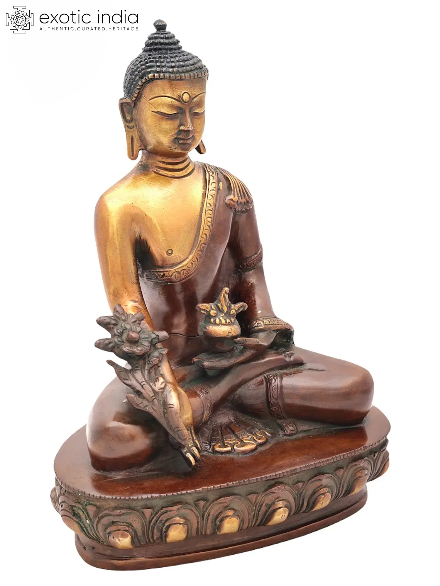 Find solace and healing energy with this handmade Brass Tibetan Buddhist Deity Medicine Buddha. This sacred statue, crafted in India, represents the compassionate and healing aspect of Buddhism. In Tibetan Buddhism, the Medicine Buddha is revered for his ability to heal physical and spiritual ailments. His serene expression and the aura of tranquility he exudes embody the belief in the interconnectedness of the mind, body, and spirit. The intricate craftsmanship on this brass idol reflects the beauty of the Buddhist philosophy of inner peace. Having the Medicine Buddha in your home encourages the path to holistic well-being and reminds you of the healing power within us all.