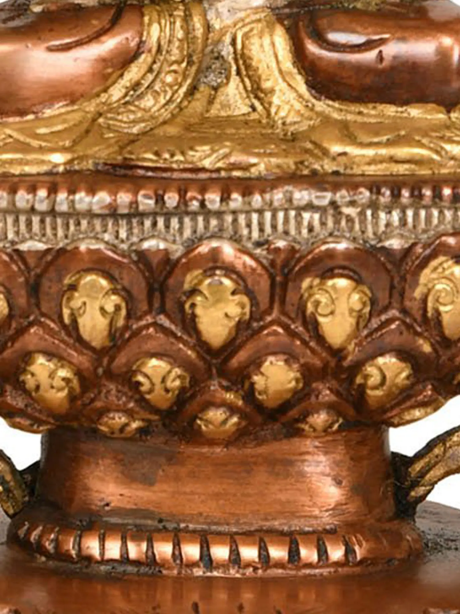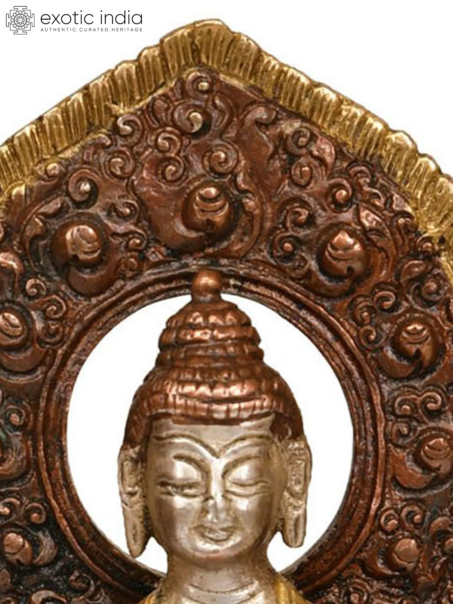 Brought to life through traditional Indian metalworking techniques, this brass statue is a beautiful fusion of heritage and spirituality. The lotus pedestal upon which the Buddha is seated is a classic symbol of purity, enlightenment, and spiritual growth, representing the unfolding of consciousness. The ornate, scalloped aureole behind him, with its intricate carvings, further enhances the divine aura surrounding the figure, evoking the cosmic radiance that emanates from a fully awakened being. This piece serves as a constant reminder of the path to enlightenment, encouraging the viewer to cultivate inner peace, courage, and compassion in their own lives. It is a perfect addition to any meditation space, home altar, or as a gift for those seeking spiritual inspiration and a sense of calm.