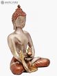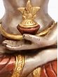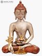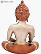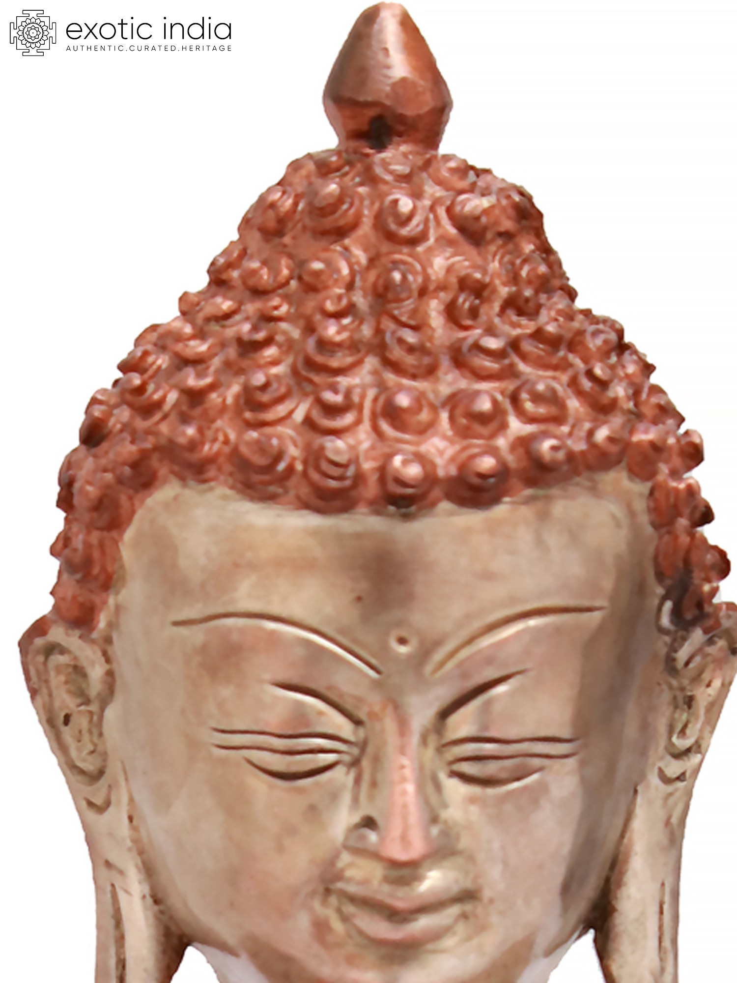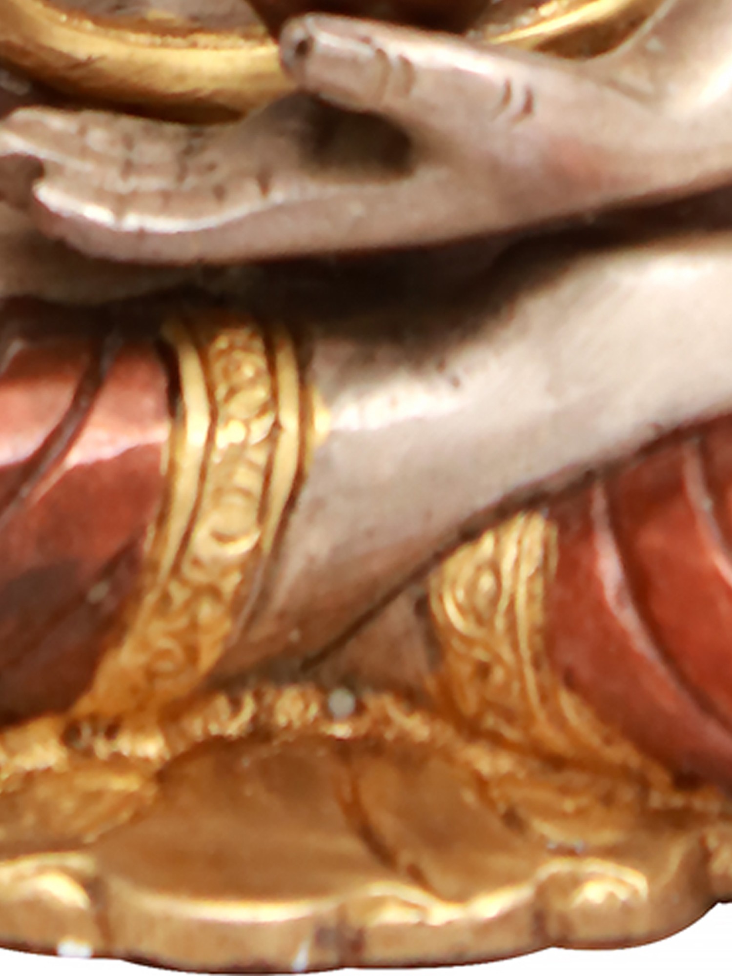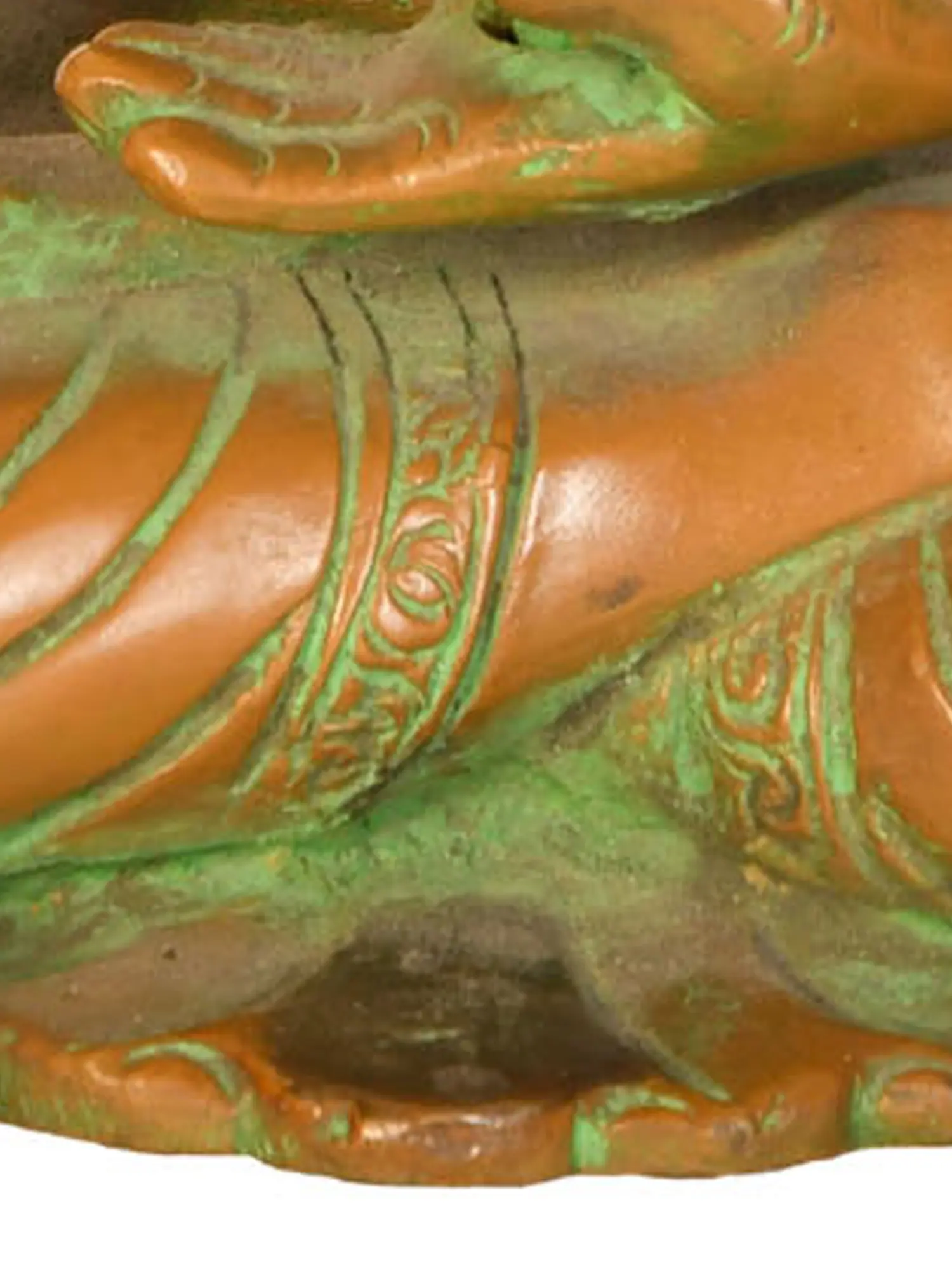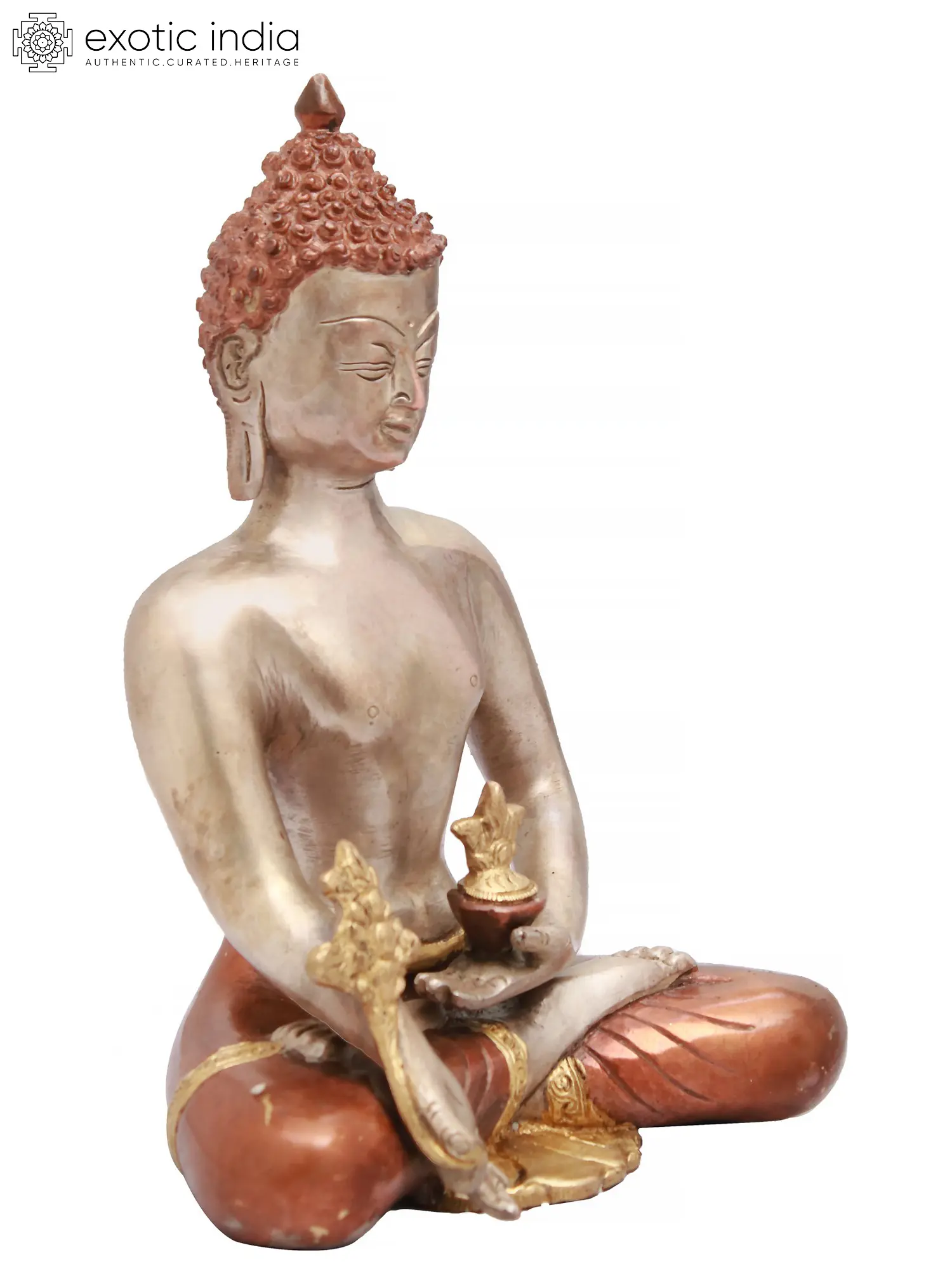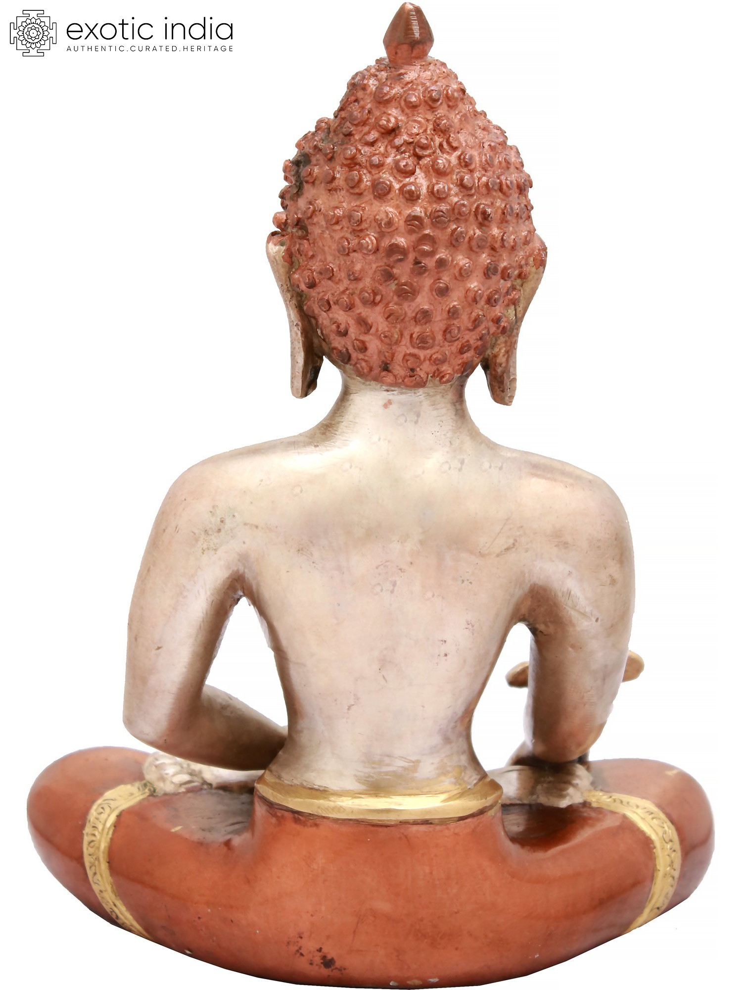 This exquisite brass statue captures the serene presence of the Medicine Buddha, also known as Bhaisajyaguru. Seated in a meditative posture, this divine figure radiates an aura of peace, healing, and profound compassion. The intricate craftsmanship of this 9-inch sculpture speaks to the rich artistic traditions of Tibetan Buddhism, where such representations are not mere decorations but potent symbols of spiritual aspiration and refuge. The Medicine Buddha is a central figure in Mahayana Buddhism, revered as the master of healing arts and the dispeller of suffering. According to Buddhist lore, he made twelve great vows to heal all beings from sickness, mental anguish, and the cycle of rebirth. His form is often depicted holding a medicine bowl filled with medicinal herbs, symbolizing his power to cure all ailments. In this statue, his right hand rests in the *vitarka mudra* or gesture of teaching, while his left hand is in *dhyana mudra* or meditation, cradling a small vessel from which delicate, stylized herbs emerge. This posture underscores his dual role as a source of wisdom and a healer. ––––––––––