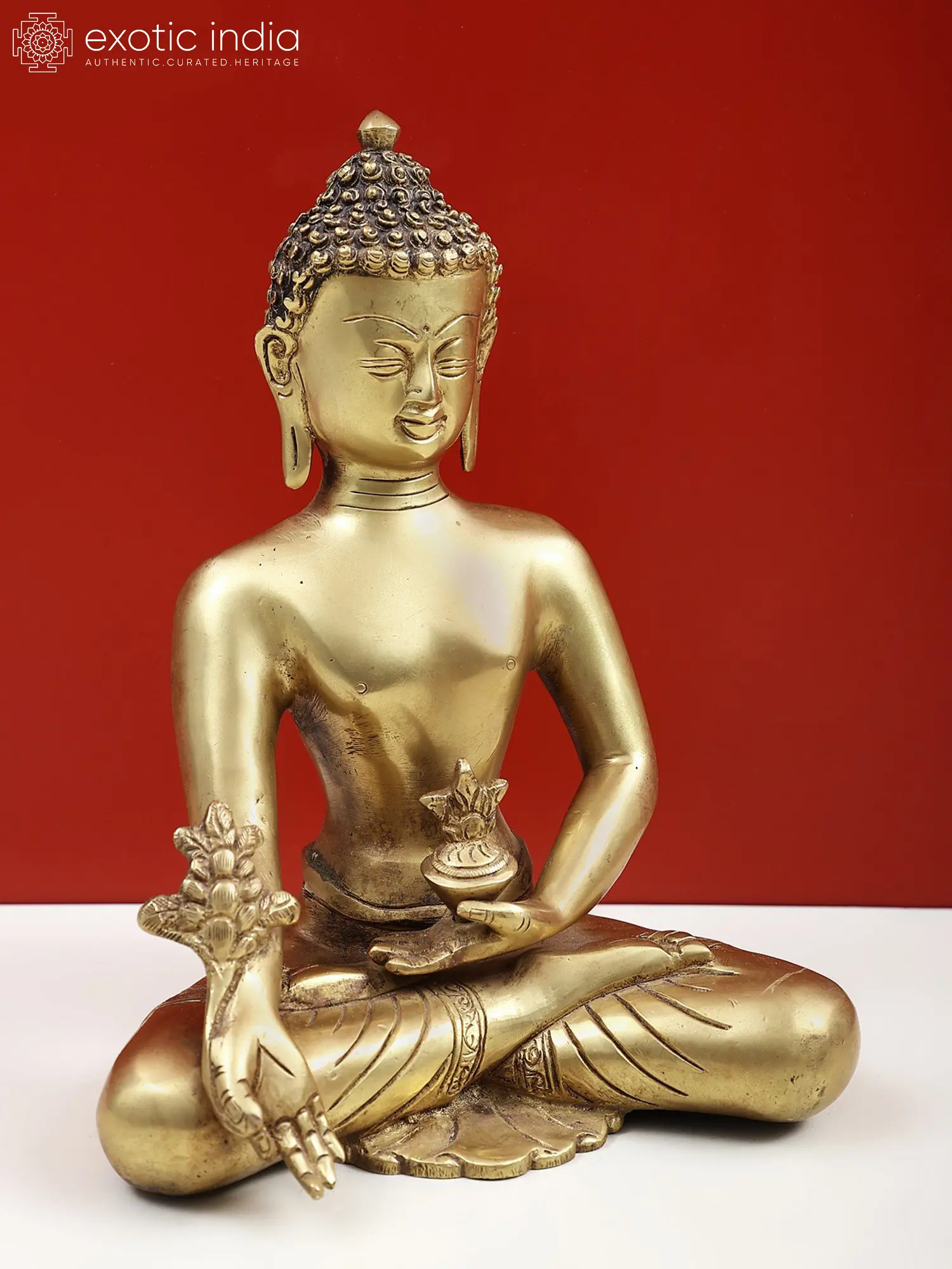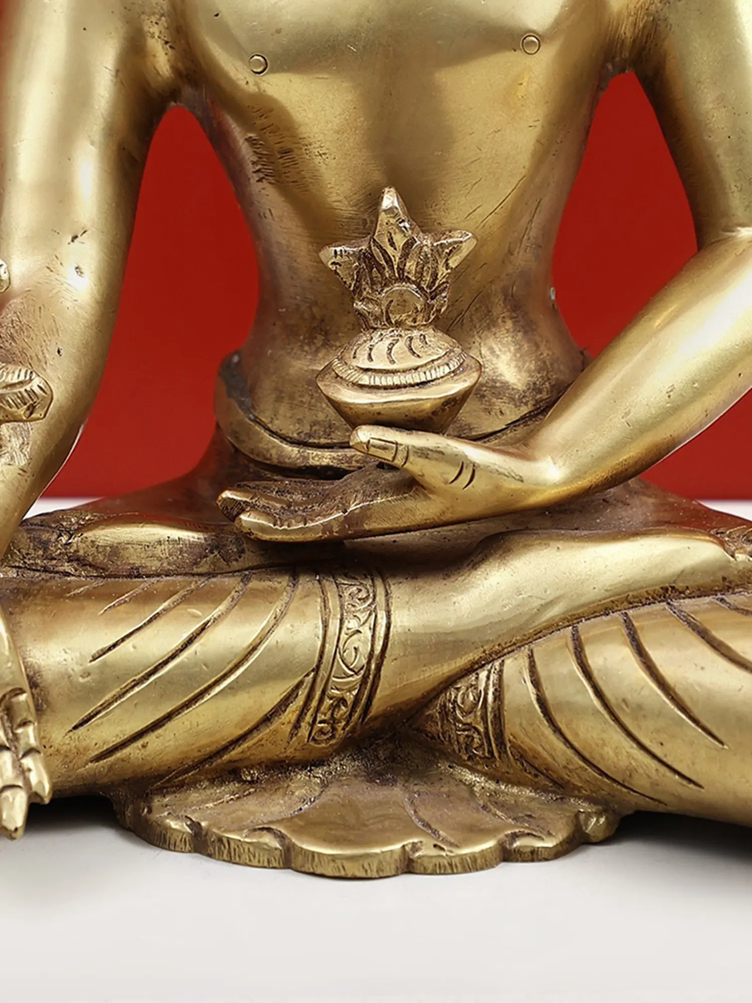 This exquisite brass statue captures the serene presence of the Medicine Buddha, also known as Bhaisajyaguru. Seated in a meditative posture, this divine figure radiates an aura of peace, healing, and profound compassion. The intricate craftsmanship of this 9-inch sculpture speaks to the rich artistic traditions of Tibetan Buddhism, where such representations are not mere decorations but potent symbols of spiritual aspiration and refuge. The Medicine Buddha is a central figure in Mahayana Buddhism, revered as the master of healing arts and the dispeller of suffering. According to Buddhist lore, he made twelve great vows to heal all beings from sickness, mental anguish, and the cycle of rebirth. His form is often depicted holding a medicine bowl filled with medicinal herbs, symbolizing his power to cure all ailments. In this statue, his right hand rests in the *vitarka mudra* or gesture of teaching, while his left hand is in *dhyana mudra* or meditation, cradling a small vessel from which delicate, stylized herbs emerge. This posture underscores his dual role as a source of wisdom and a healer. ––––––––––