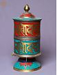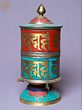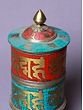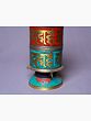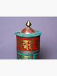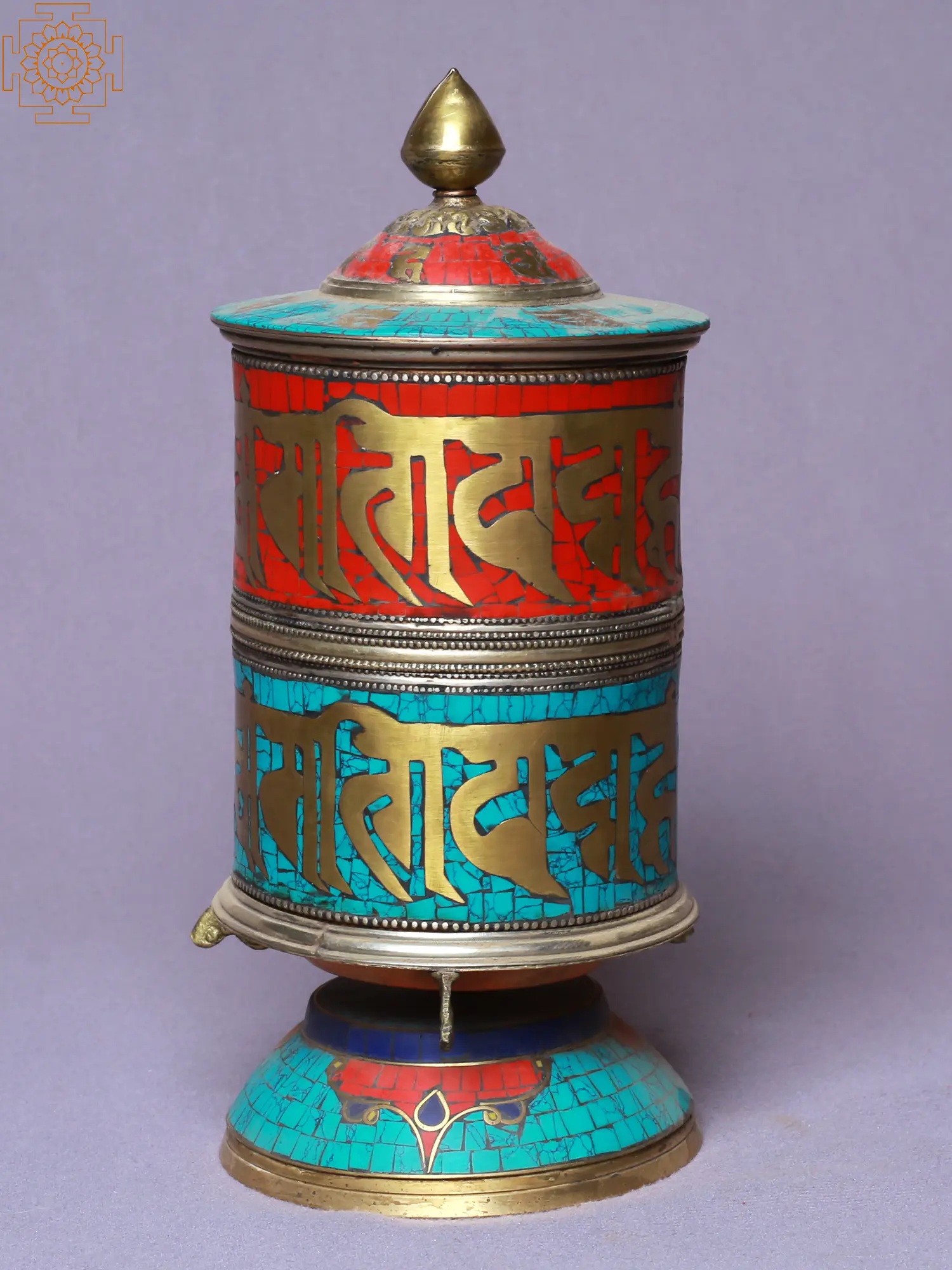 The Tibetan Buddhist Table Prayer Wheel with Stone Work is a masterpiece built with graphical futuristic stone and glowing colors. Made in Nepal, this prayer wheel stands on a supporting pedestal adorned with Ethnic patterns drawn with paint and a pointed carving on the top. In Buddhism, prayer wheels are believed to facilitate the chanting of mantras, creating a positive and sacred environment. By spinning this wheel, one can invoke spiritual energies and remove negative forces from their life. This prayer wheel serves as a powerful aid in meditation and prayer, helping individuals deepen their spiritual practice.