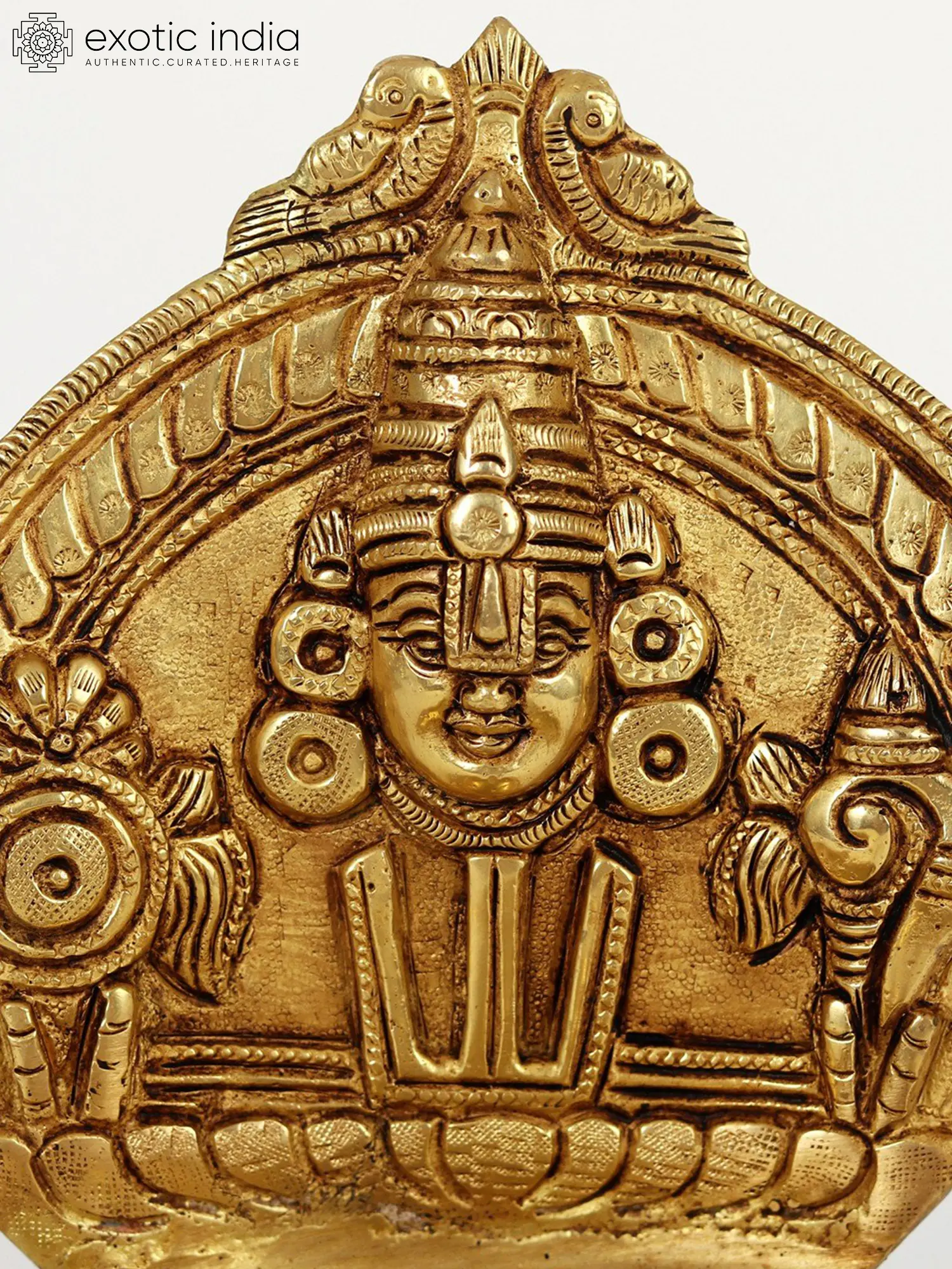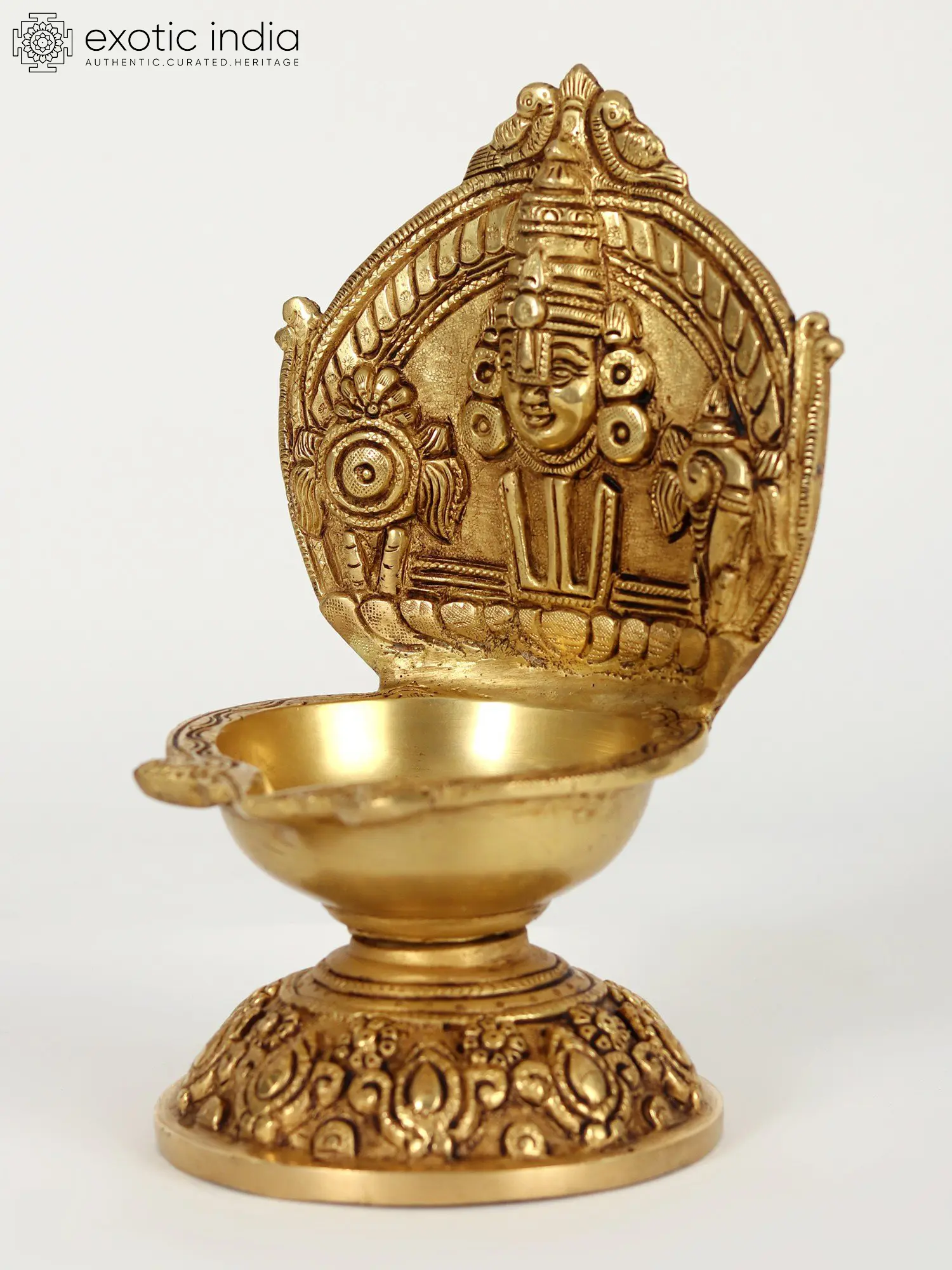 A beautifully patterned piece in brass, this Vaishnava lamp is a little temple in itself - the plate backdrop forms a beautiful tip on the top making two peacocks adjoined. Swami Venkateshwara is carved in the focal center, and below him are the revered Vaishnava Icons - Sudarshan Chakra, Namam, and Panchajanya. A must-have for your temple, it lights in the name of Hari.
