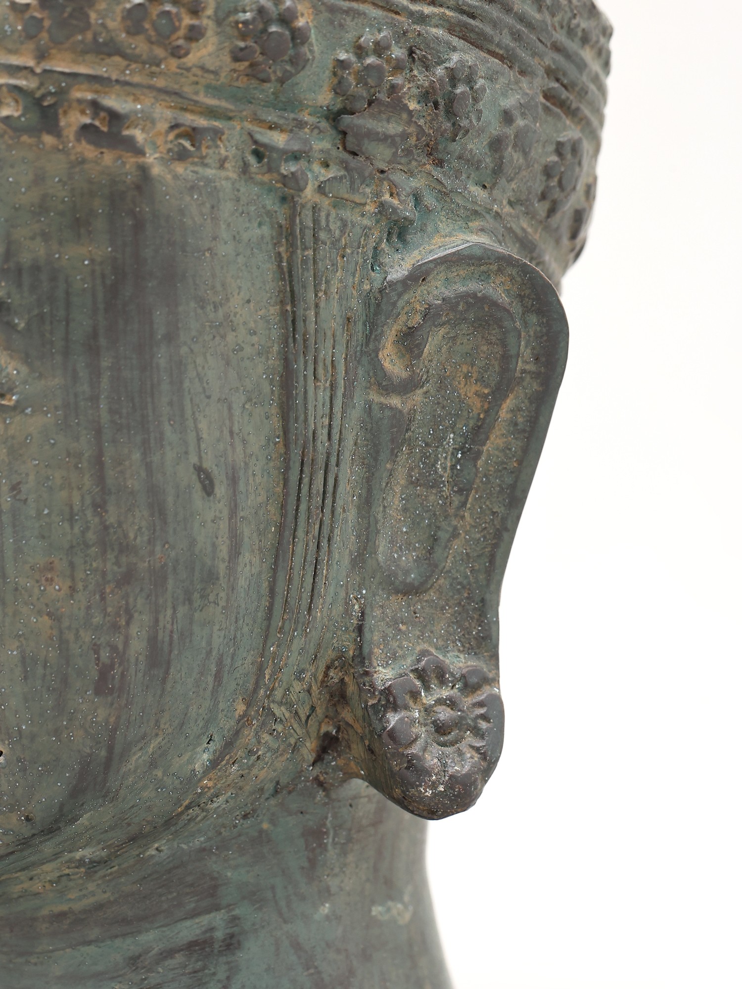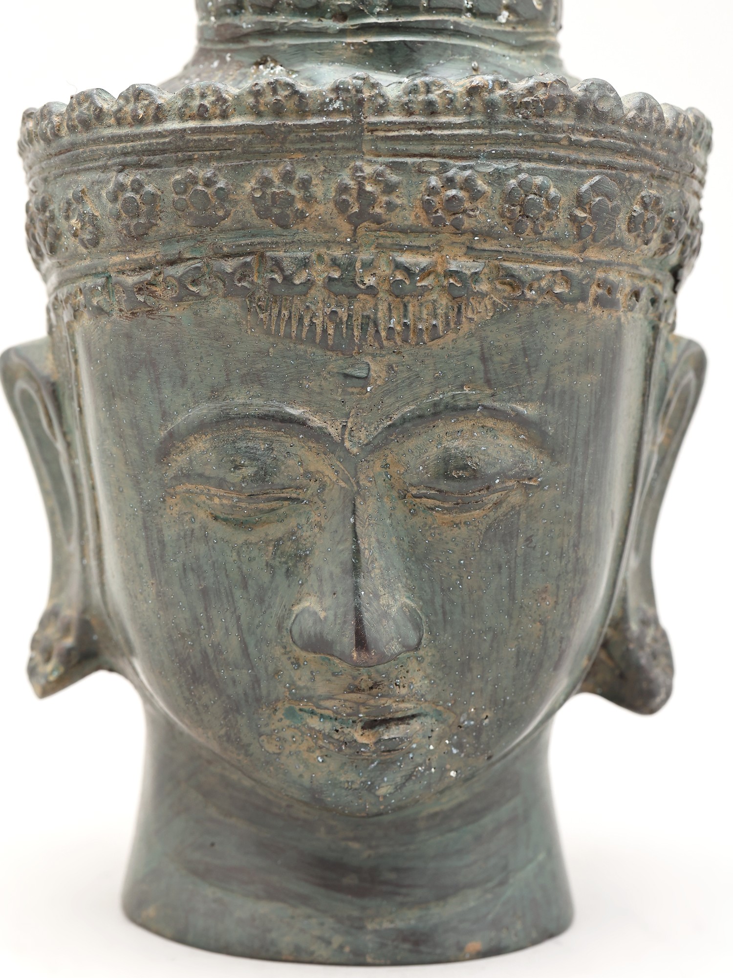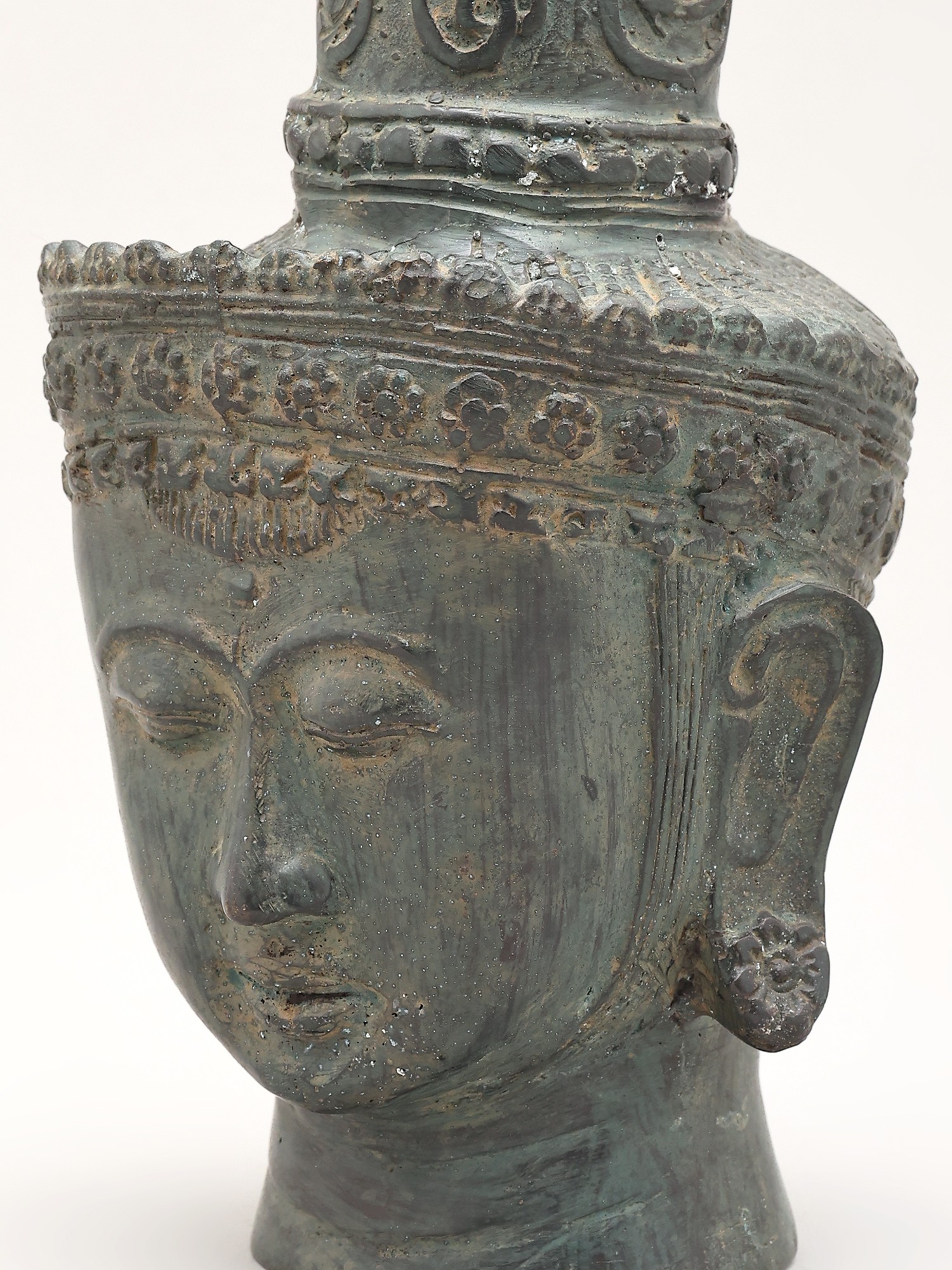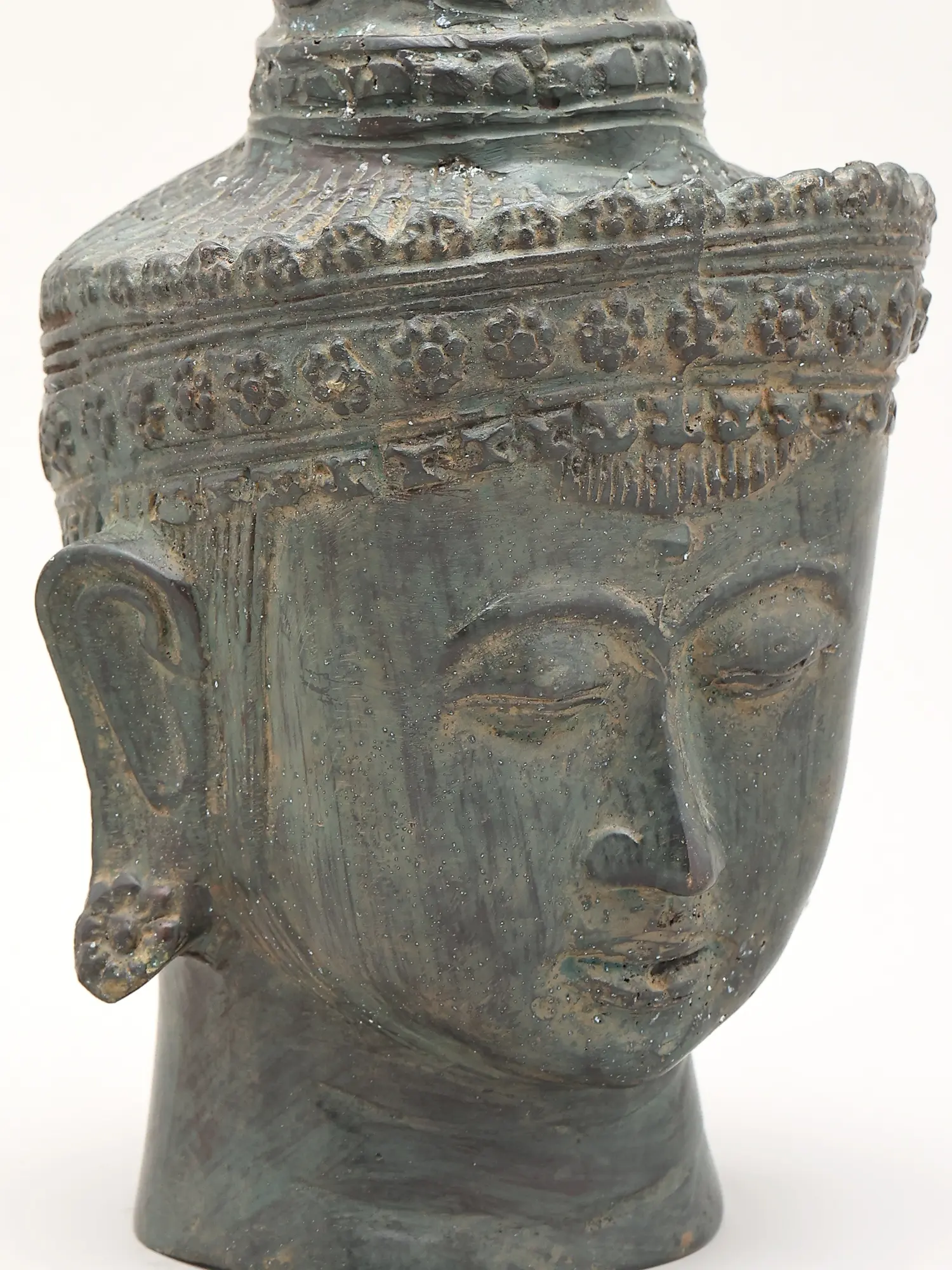 The Buddha, whose name Siddhartha Gautama means "he who has attained his goal," was a prince who renounced his worldly possessions in pursuit of truth and understanding. His teachings, the Dharma, have guided millions across centuries, offering a path to liberation from suffering. This sculpture, with its closed eyes and gentle expression, invites contemplation and evokes the deep inner peace that the Buddha himself cultivated. The elaborate headdress suggests the spiritual crown of wisdom and the multifaceted nature of his enlightenment. In Buddhist iconography, the cranial protuberance (ushnisha) symbolizes his boundless wisdom and vast knowledge, while the urna, a dot between his eyebrows, represents his insight into the universe. ––––––––––––––––––